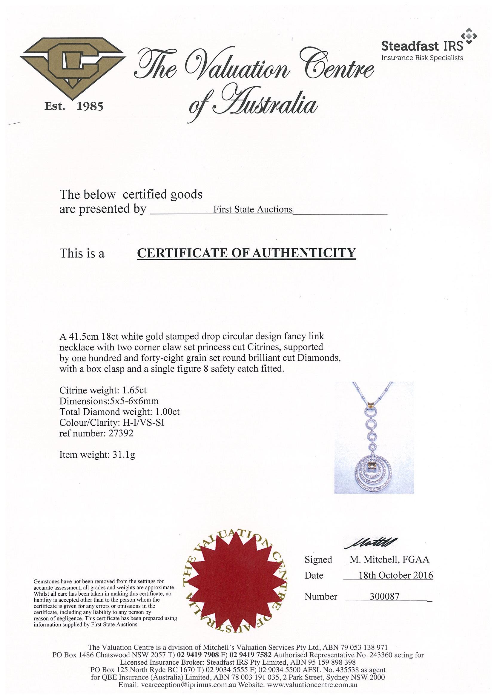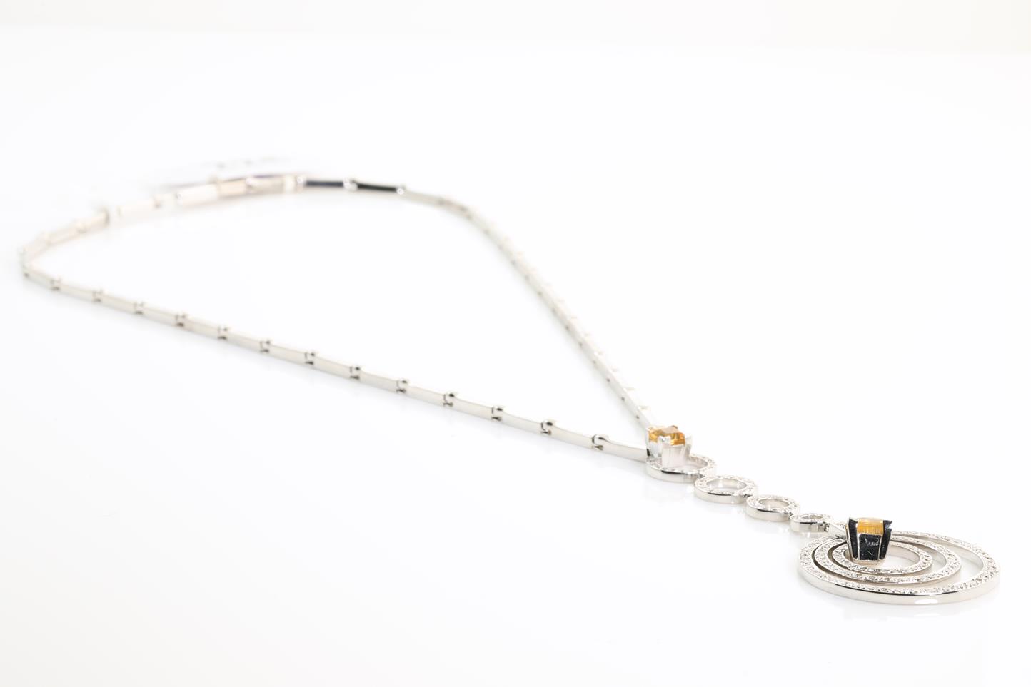 Citrine and Diamond Necklace with two Princess cut Citrines totalling approximately 1.65cts and Round Brilliant cut Diamonds totalling approximately 1.00cts (Estimated Grading: H-I VS-SI). 18ct white gold. Length: 41.5cm. With copy of Certificate #300087. Weight: 31.1g (Pre-owned)