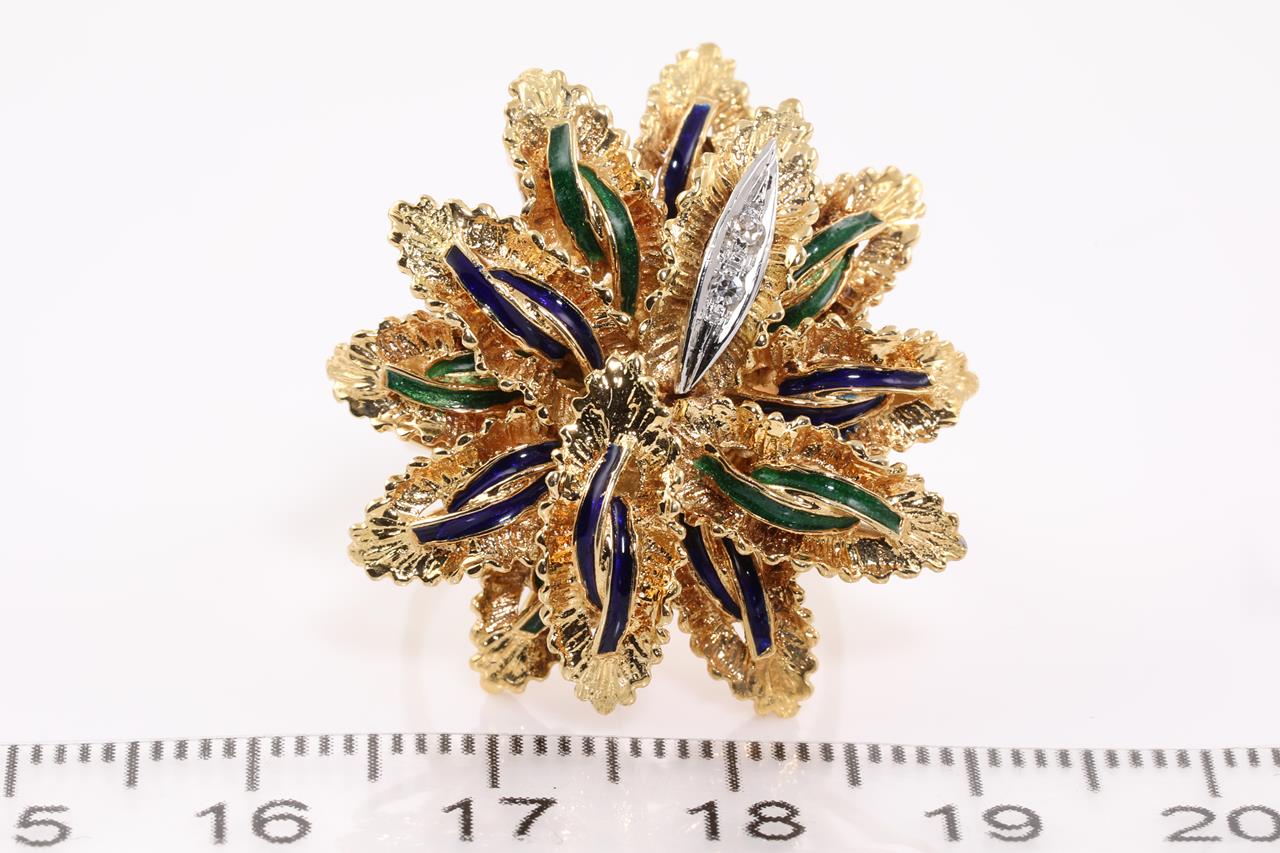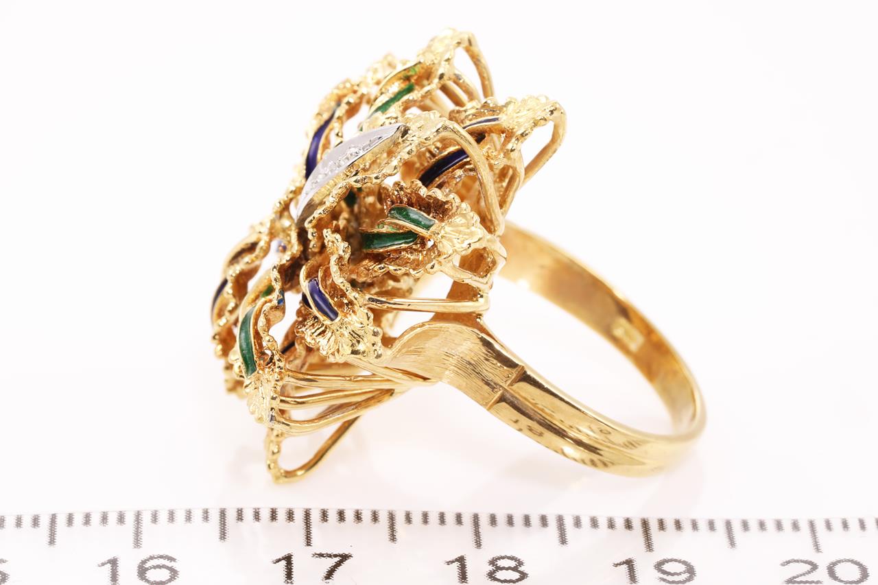 Diamond and Enamel Ring with round Diamonds totalling approximately 0.04cts with green and blue enamel. 18ct yellow gold. Ring size O. Weight 12.8g. (As New)