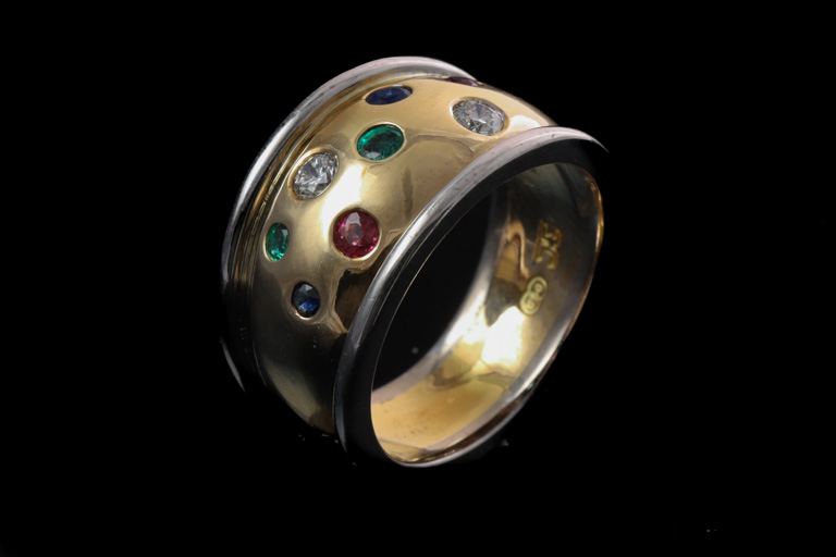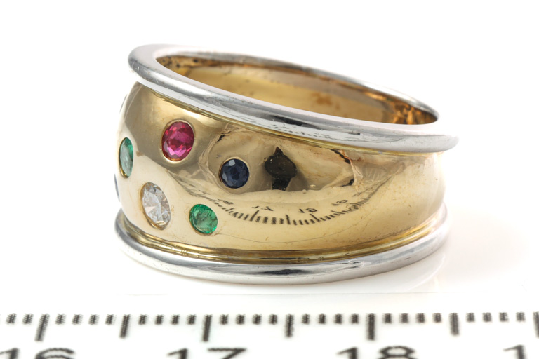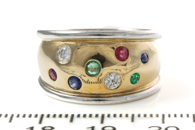RESHOOT: Diamond and mixed gemstone ring with 2 round Diamonds totalling 0.20cts, 2 round Ruby of 0.06cts, 2 round blue Sapphire totalling 0.06cts and 2 round Emerald totalling 0.06cts. Ring Size: P, ring resize is not recommended. 18ct white and yellow gold. Weight: 11.3g. (Pre-owned)