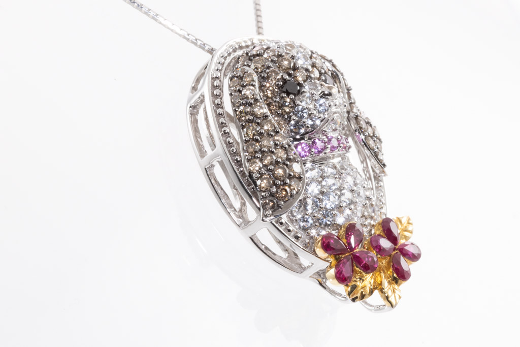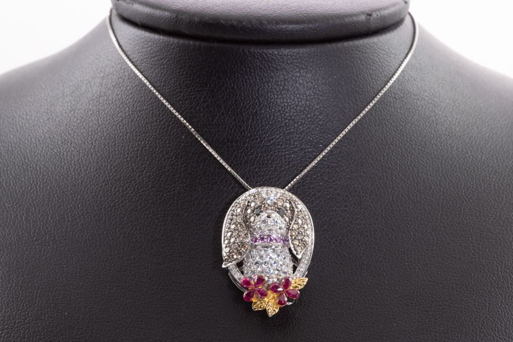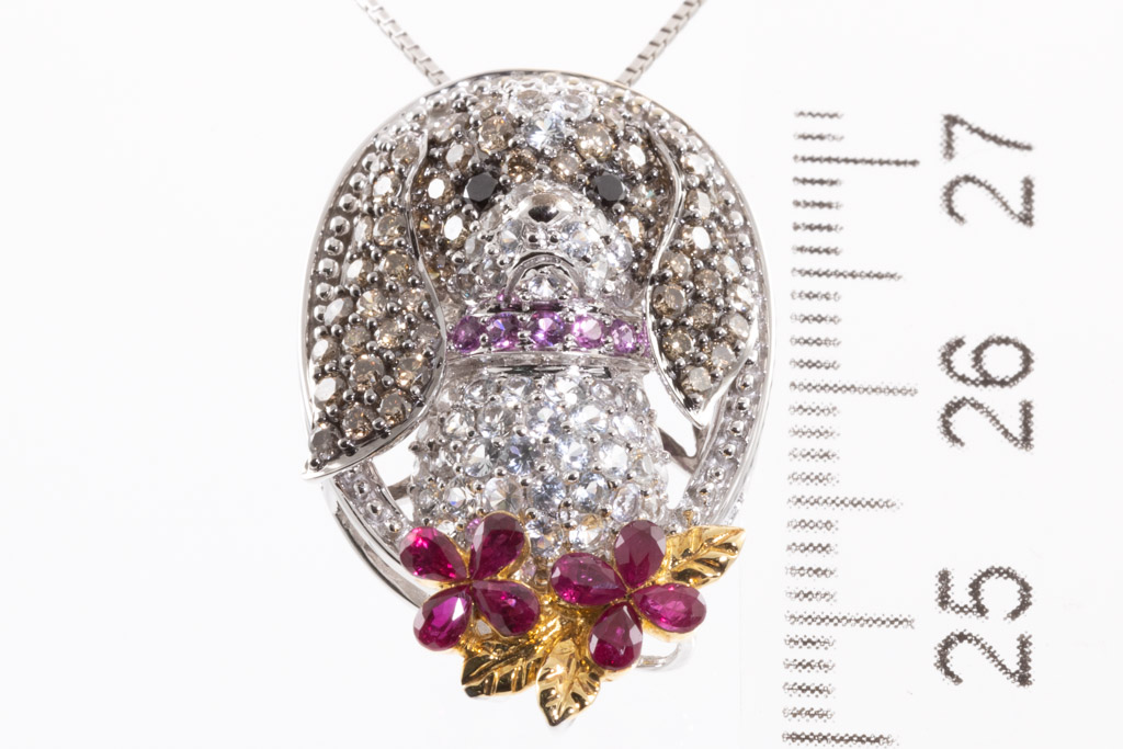 Diamond and Mixed gemstones puppy designed pendant with black Diamonds totalling 0.02cts (note: black Diamonds may be treated), round Champagne Diamonds totalling 0.50cts (Estimated grading: Champagne SI), round white & pink Sapphires totalling 0.60cts and pear shape Rubies totalling 0.20cts. 18ct white and yellow gold with 44cm 18ct white gold adjustable chain. Weight: 9.5g. (pre-owned)