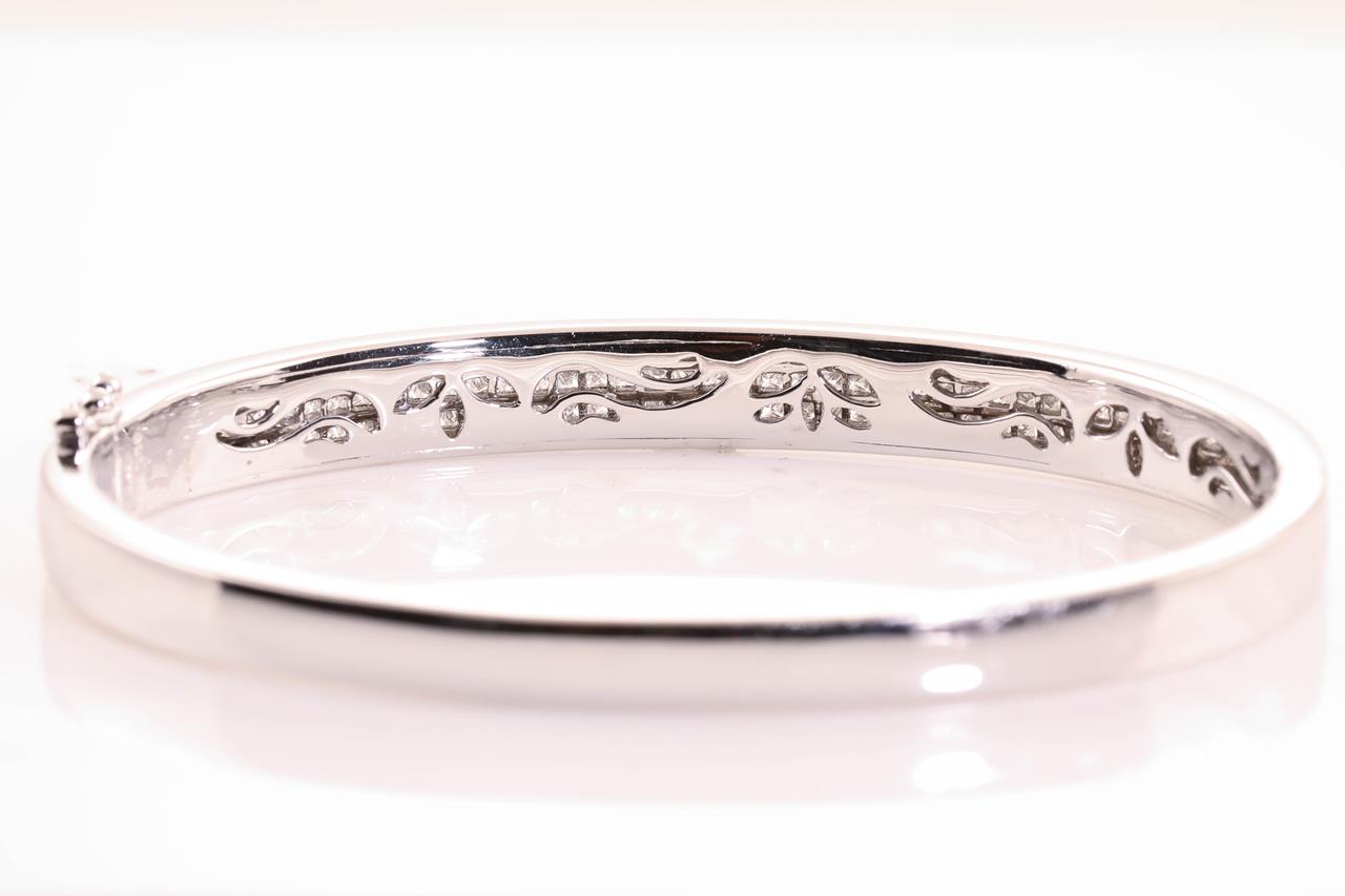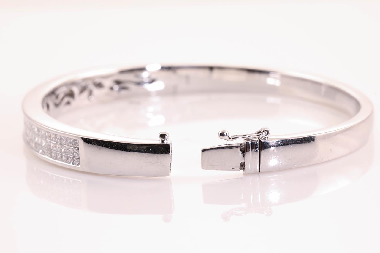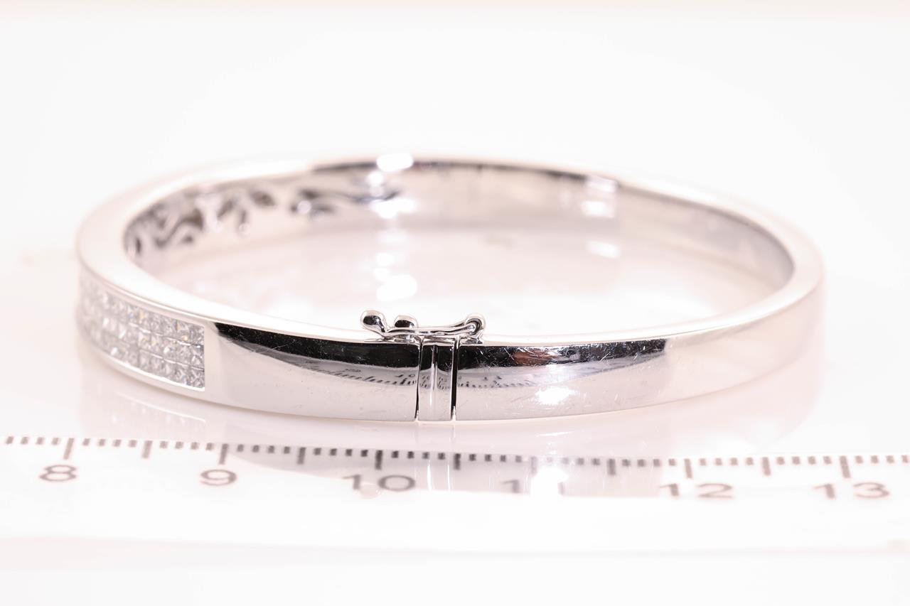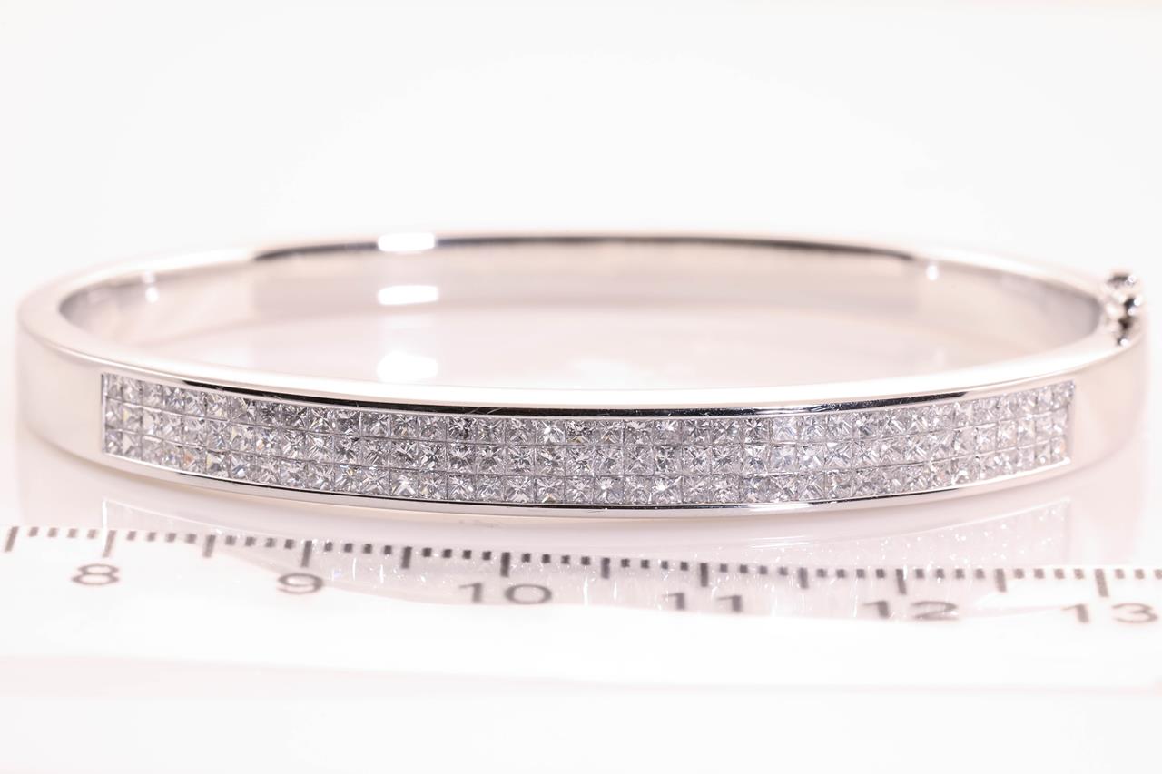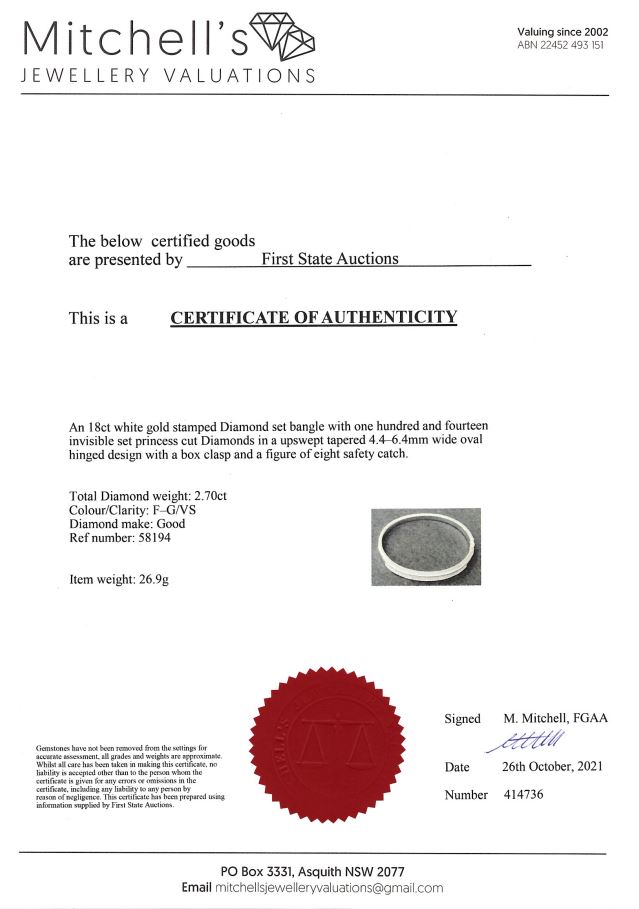 Diamond Bangle with 114 princess Diamonds totalling approximately 2.70cts (Estimated grading: F-G VS). 18ct white gold. Weight 26.9g. With Certificate #414736. (Pre-owned)