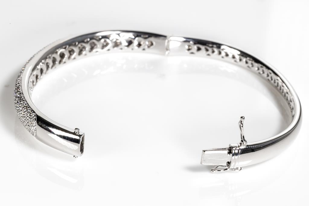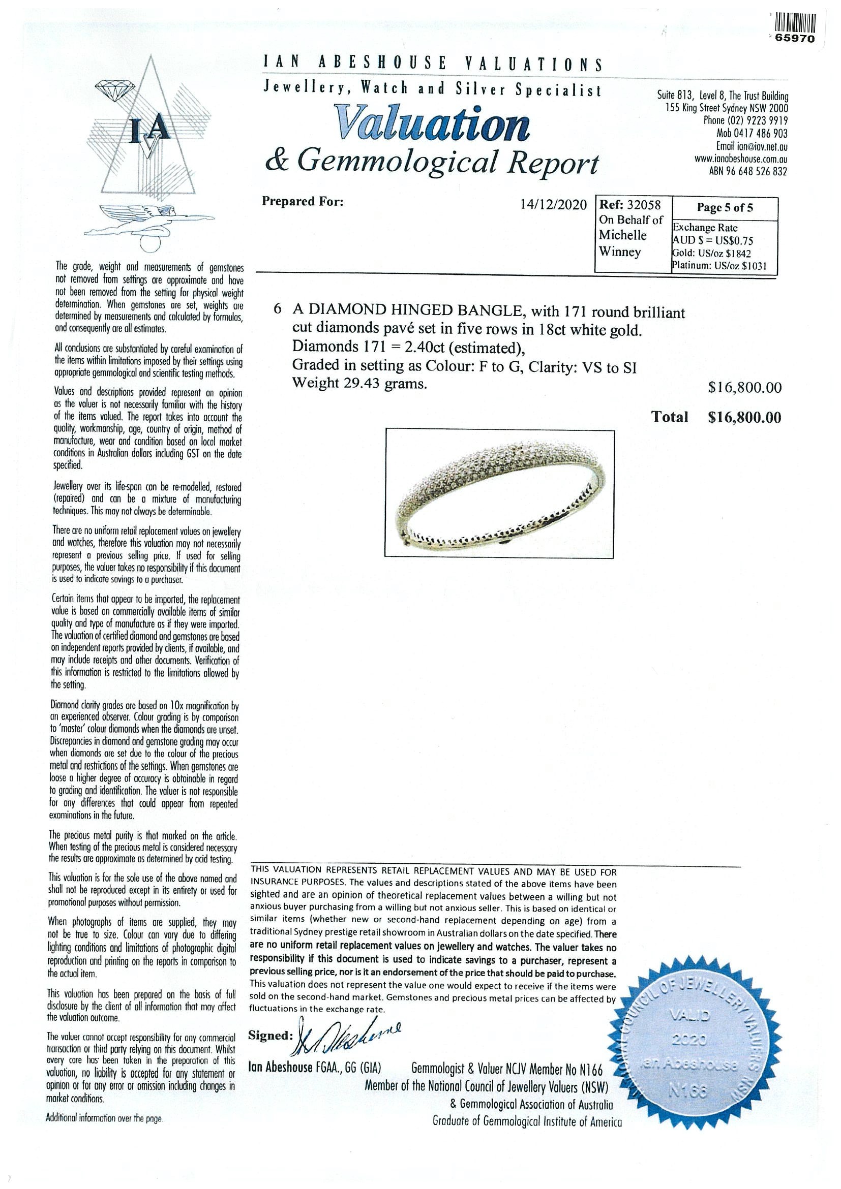 Diamond bangle with round cut Diamonds totalling approximately 2.40cts (Estimated grading F-G VS SI) 18ct white gold. Circumference 15.5cm. Weight 29.4g. With copy of valuation certificate. (Pre-owned)