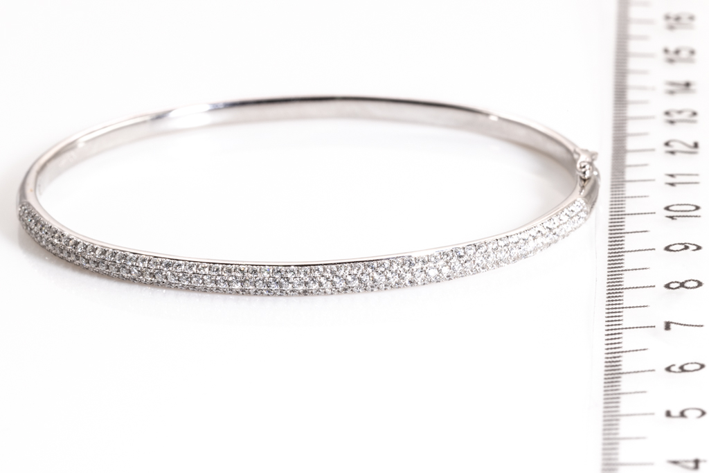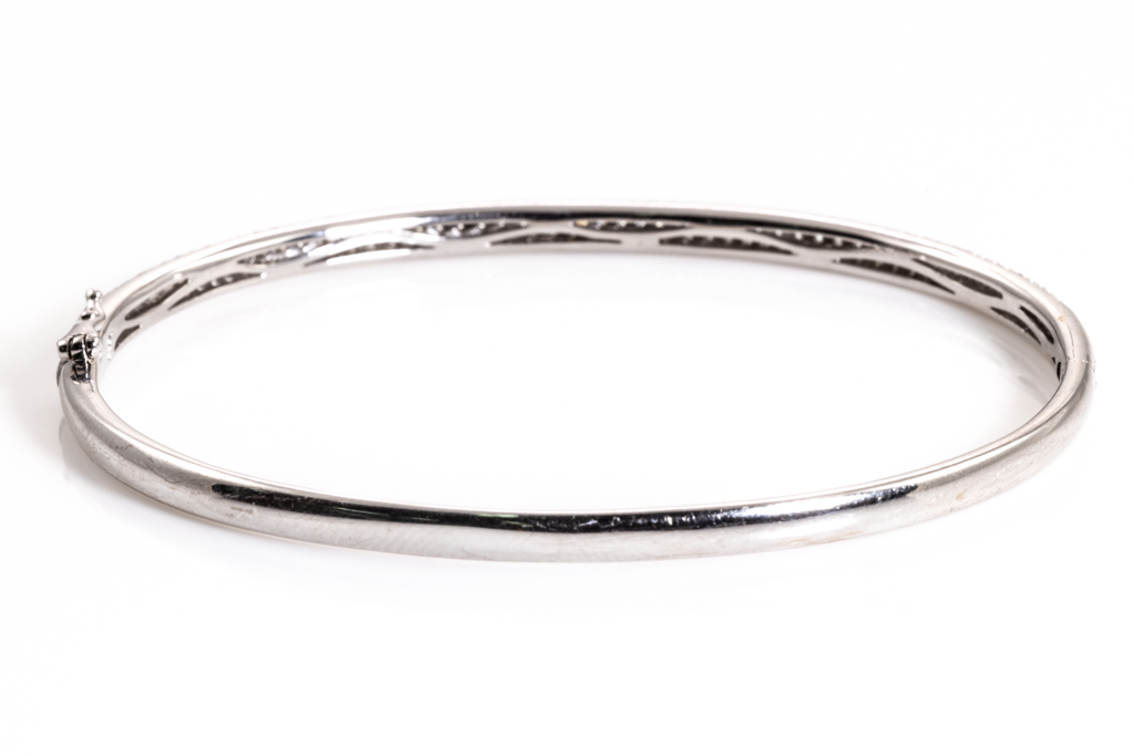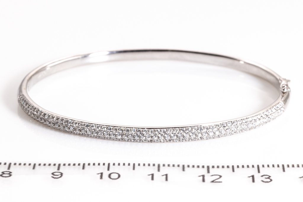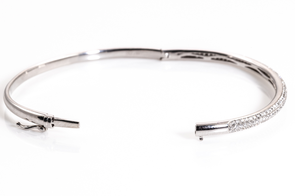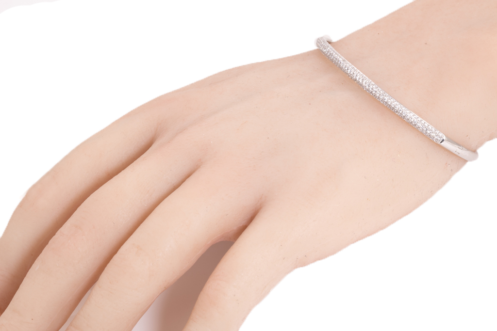 Diamond bangle with round cut Diamonds totalling approximately 0.70cts. (Estimated grading G-H SI-P1). 18ct white gold. Circumference 15.5cm. Weight 11.7g. (Pre-owned)