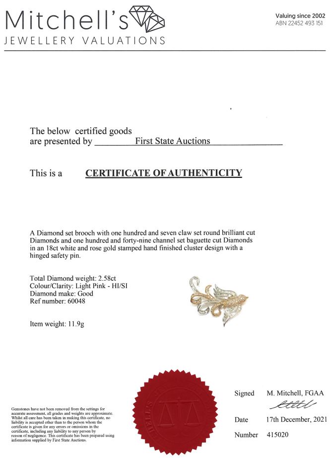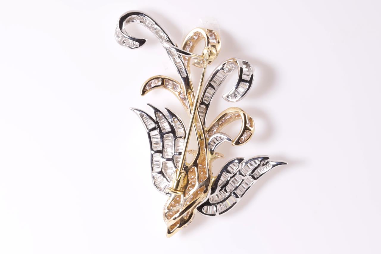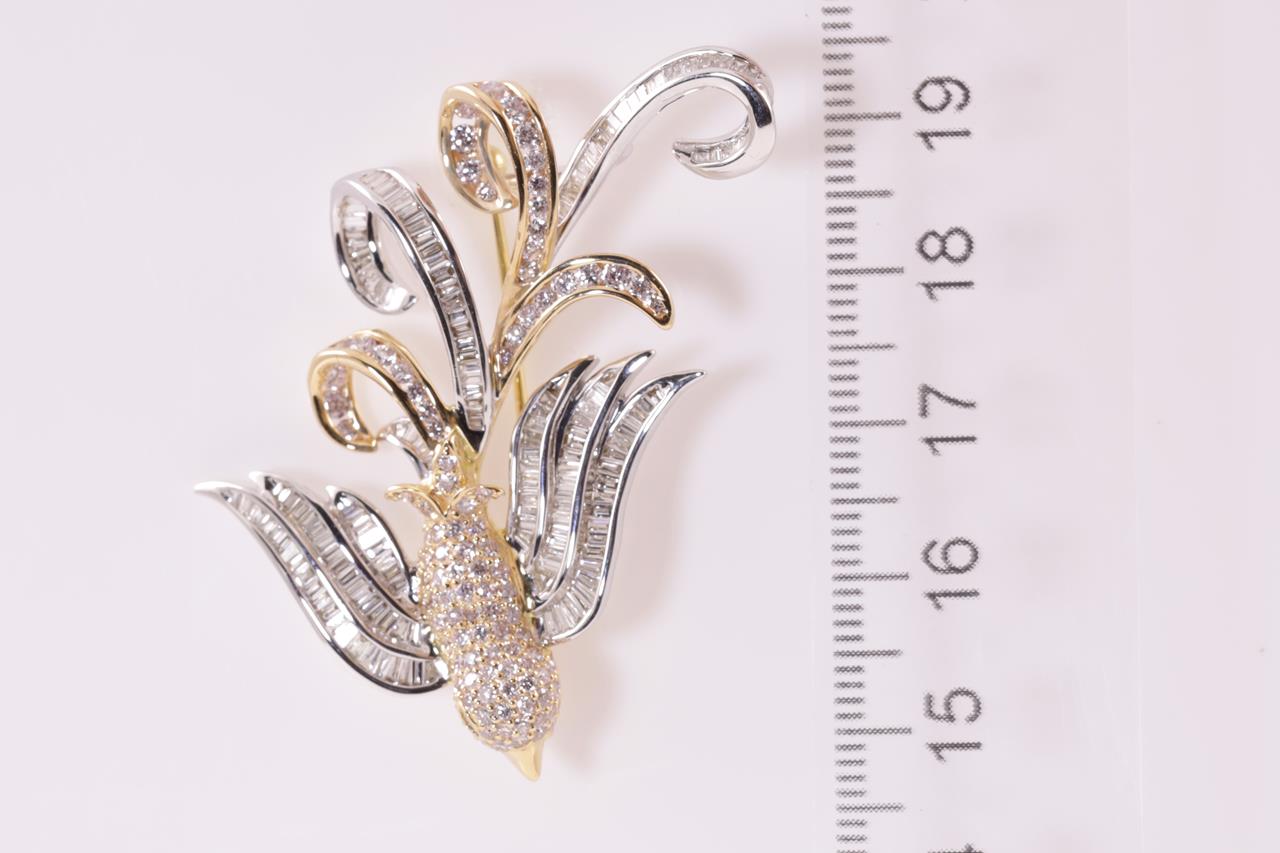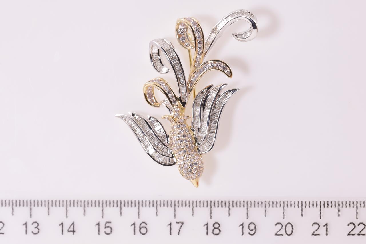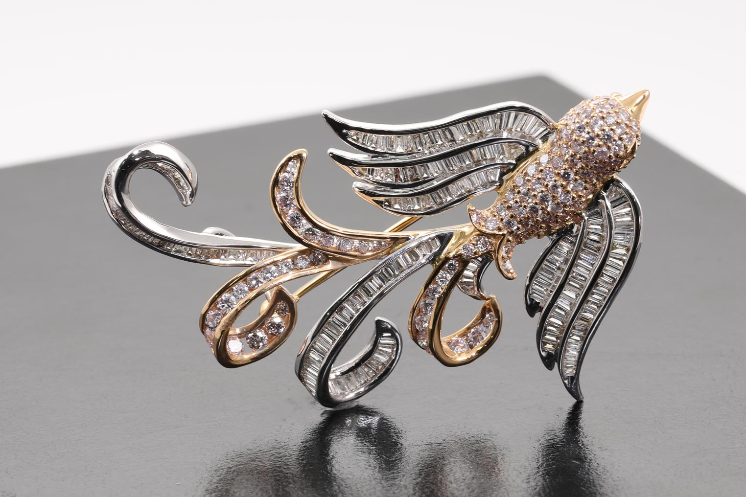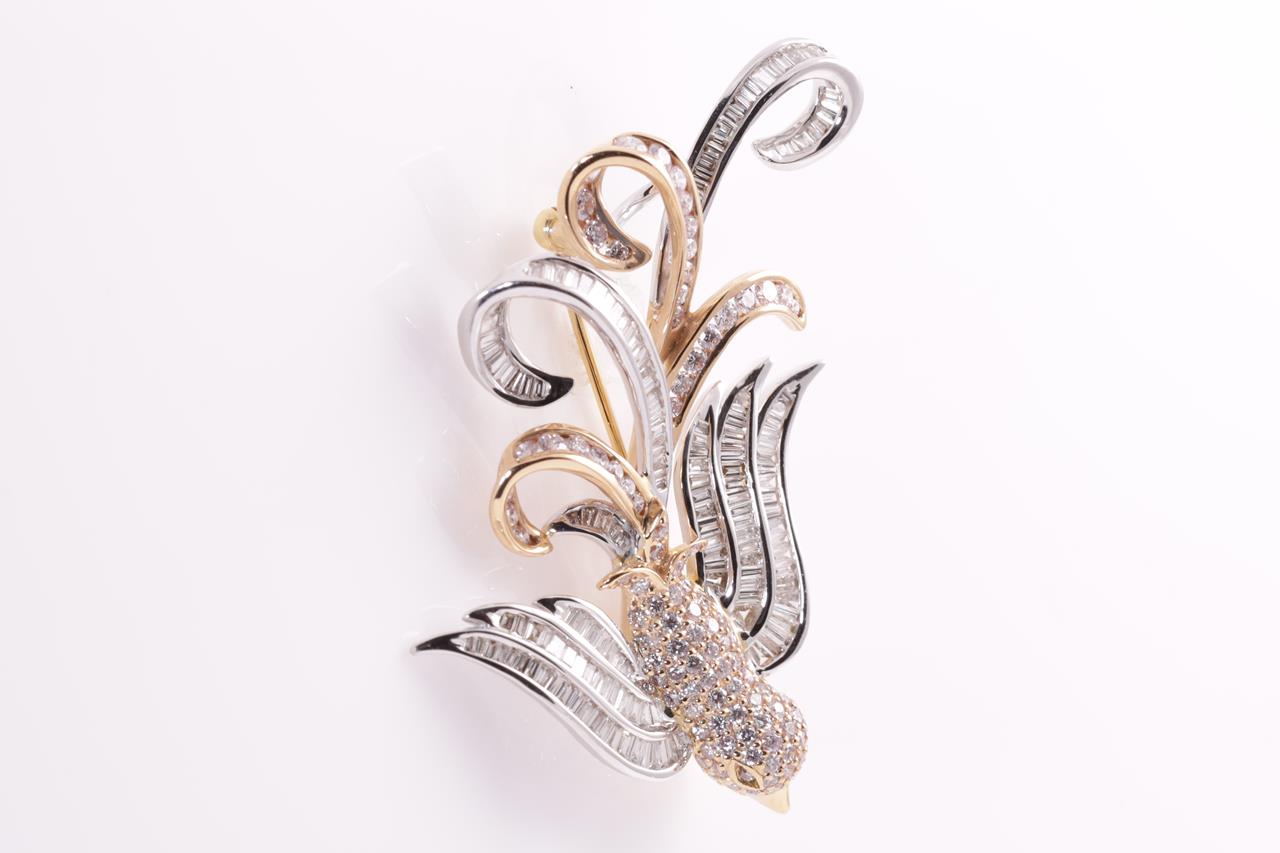 Diamond bird design brooch with round and baguette cut Diamonds totalling 2.58cts (Estimated grading: light pink H-I SI). 18ct white and yellow gold. Weight: 11.9g. With certificate #415020. (Pre-owned)
