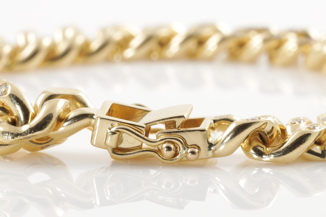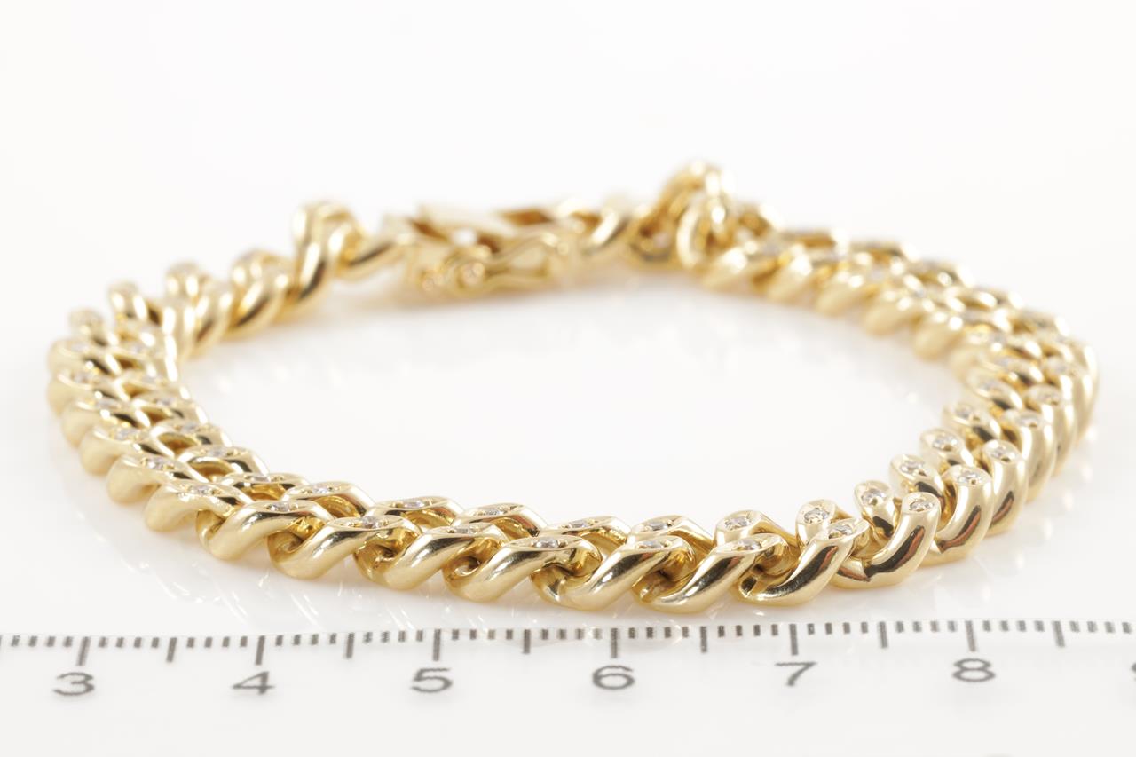 Diamond curb link bracelet with round Diamonds totalling 0.85cts (Estimated grading: H-I SI). 18ct yellow gold. Length: 20cm. Weight: 45.1g. With certificate #414611. (Pre-owned)