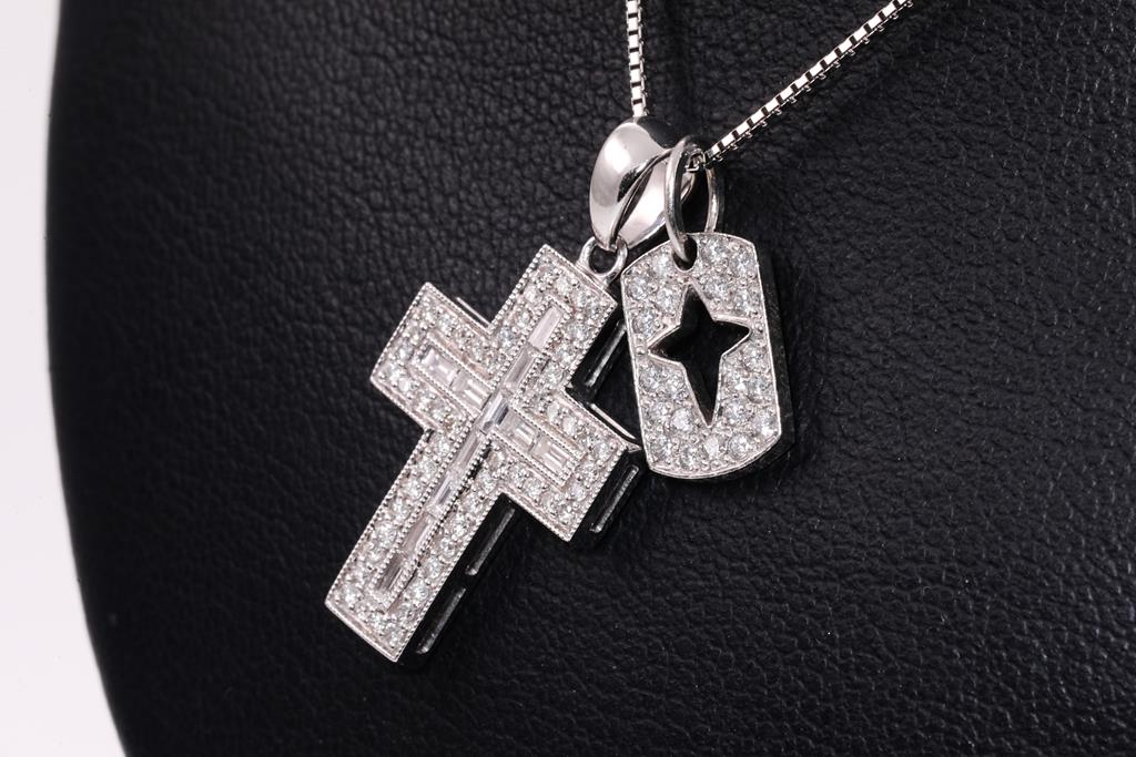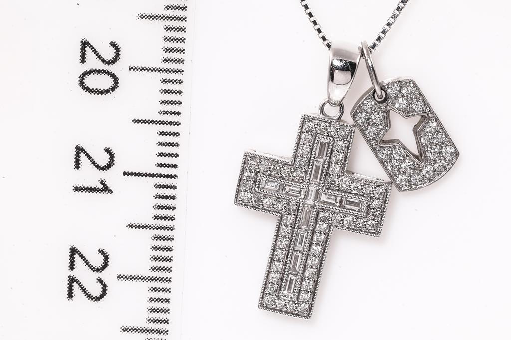 Diamond cross & charm pendant with round & baguette cut Diamonds totalling 0.56cts (Estimated grading: H SI). 18ct white gold with 18ct white gold 44cm adjustable chain. Note small charm engraved 10th Anniversary & since 2009. Weight 6.2g (Pre-owned)