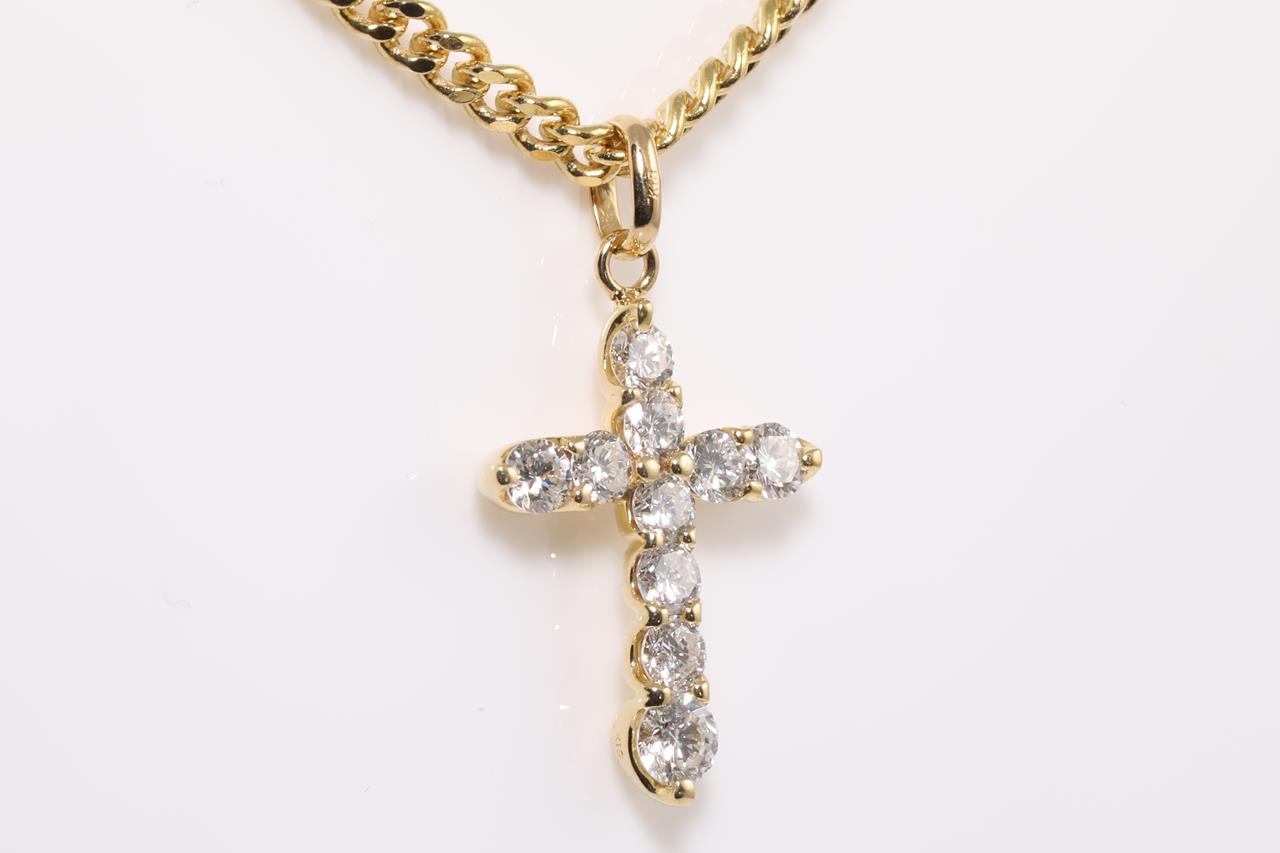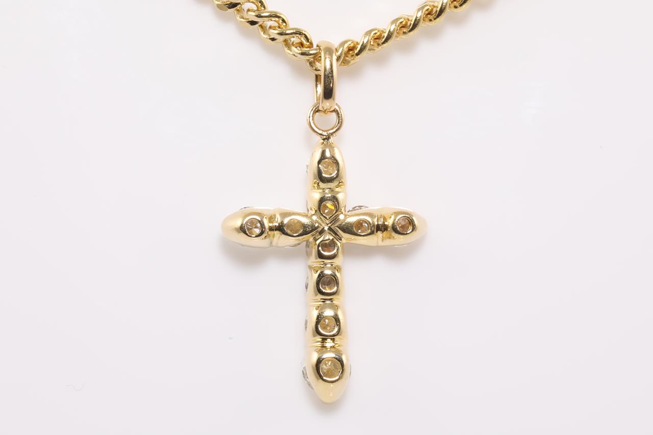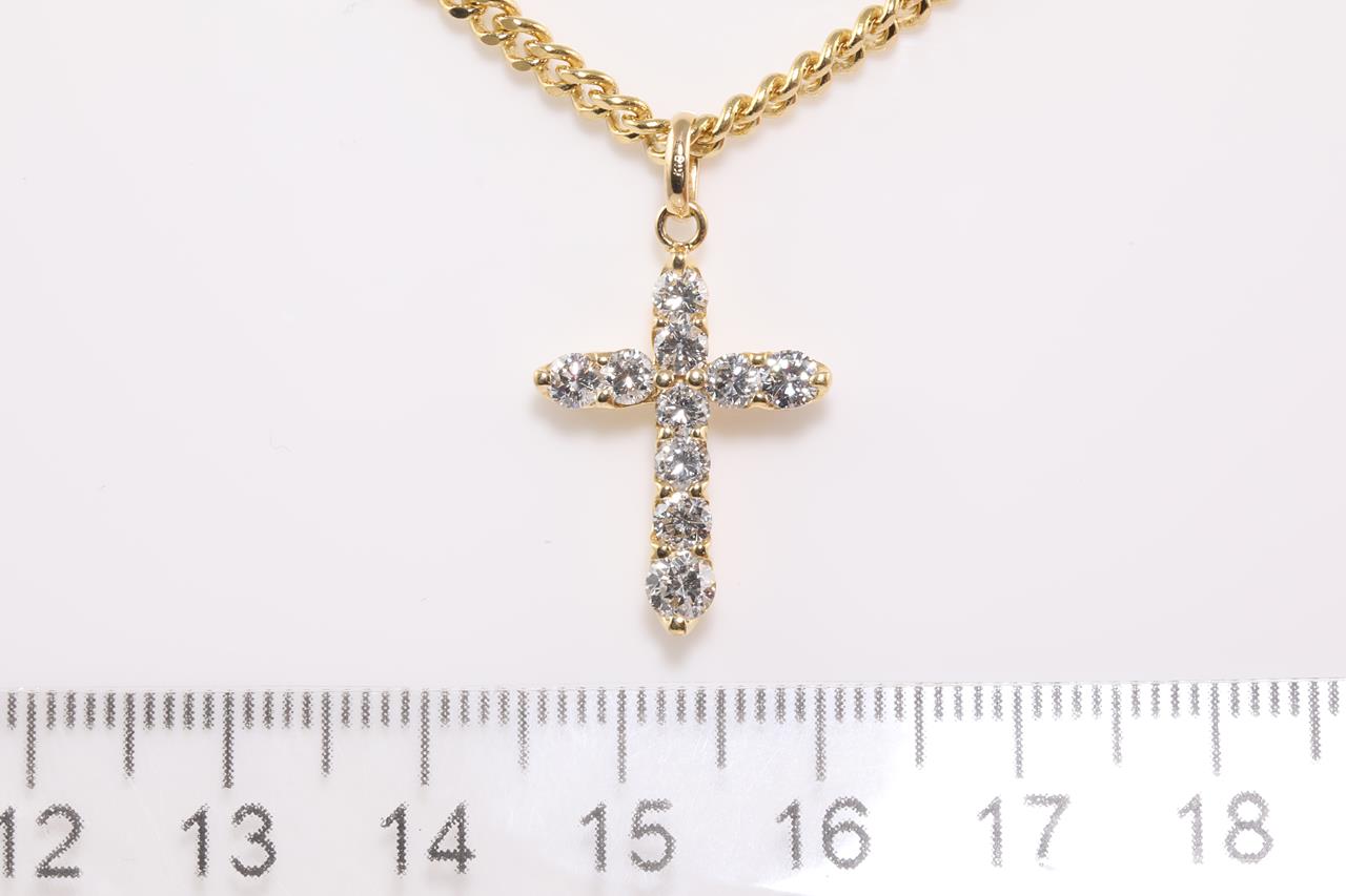 Diamond Cross pendant with round Diamonds totalling 1.02cts (Estimated grading: H-I SI). 18ct yellow gold with 50cm chain. Weight: 17.0g (Pre-owned)