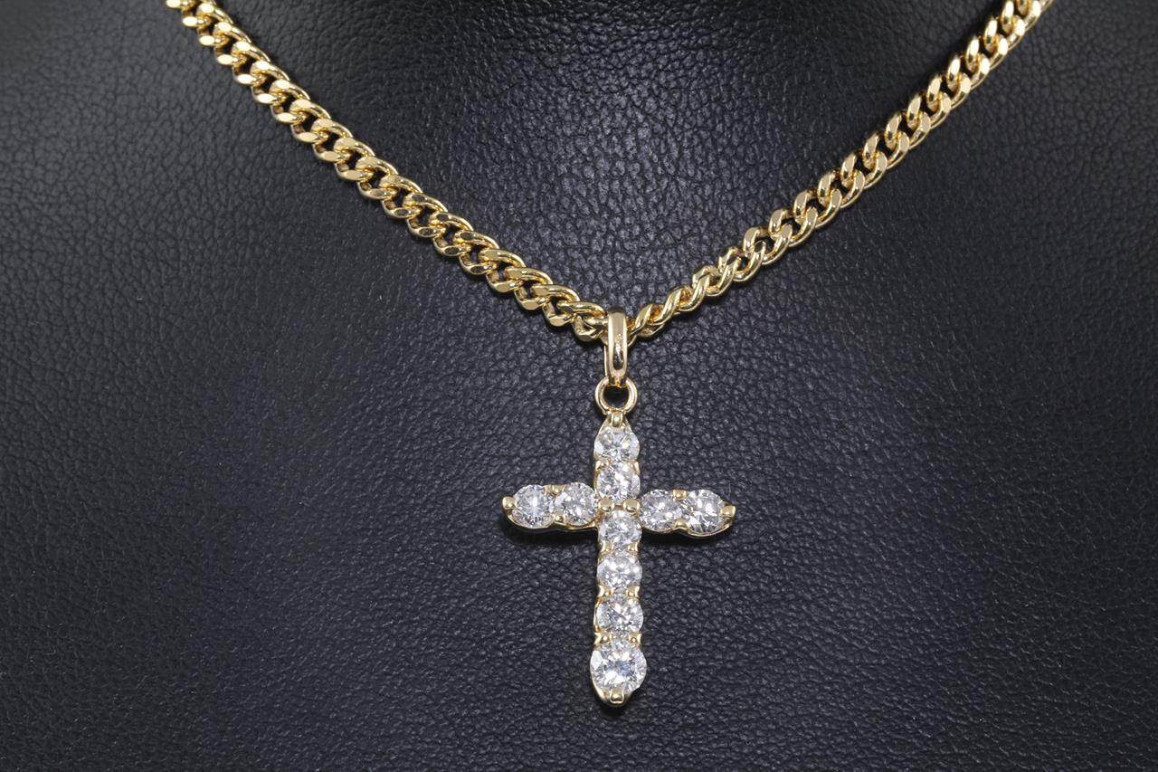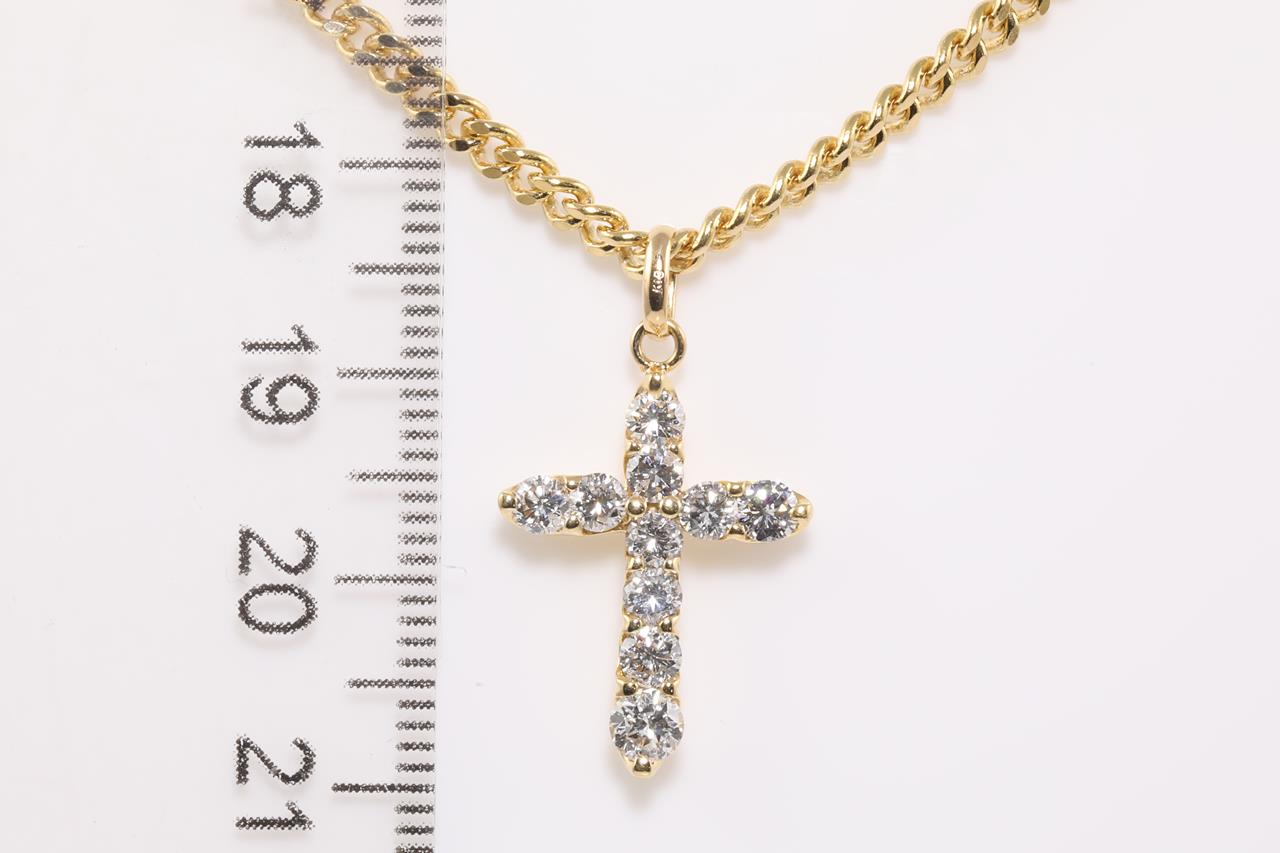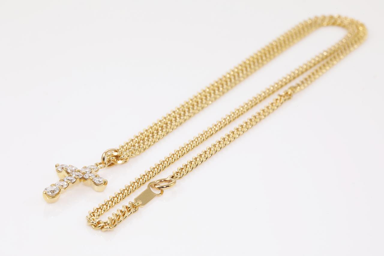 Diamond Cross pendant with round Diamonds totalling 1.02cts (Estimated grading: H-I SI). 18ct yellow gold with 50cm chain. Weight: 17.0g (Pre-owned)