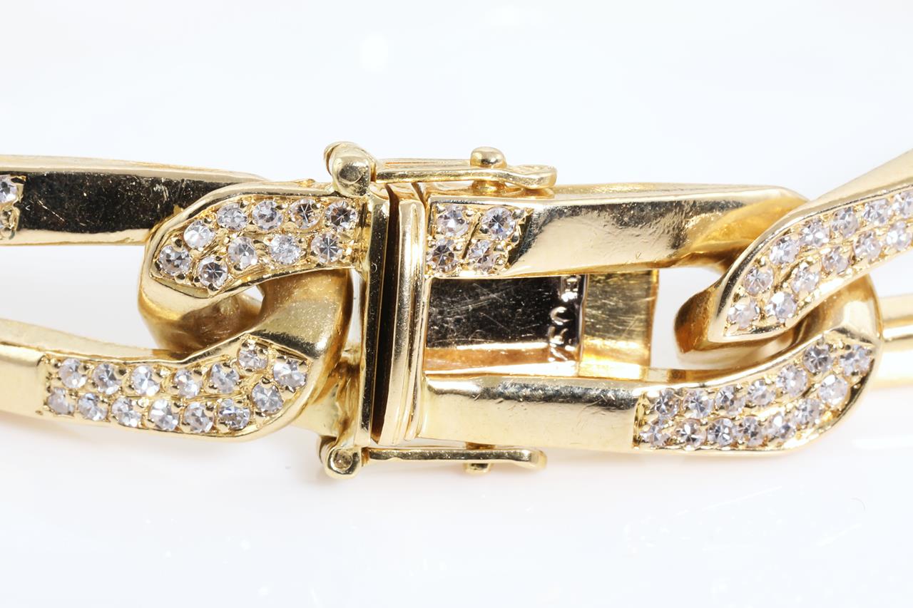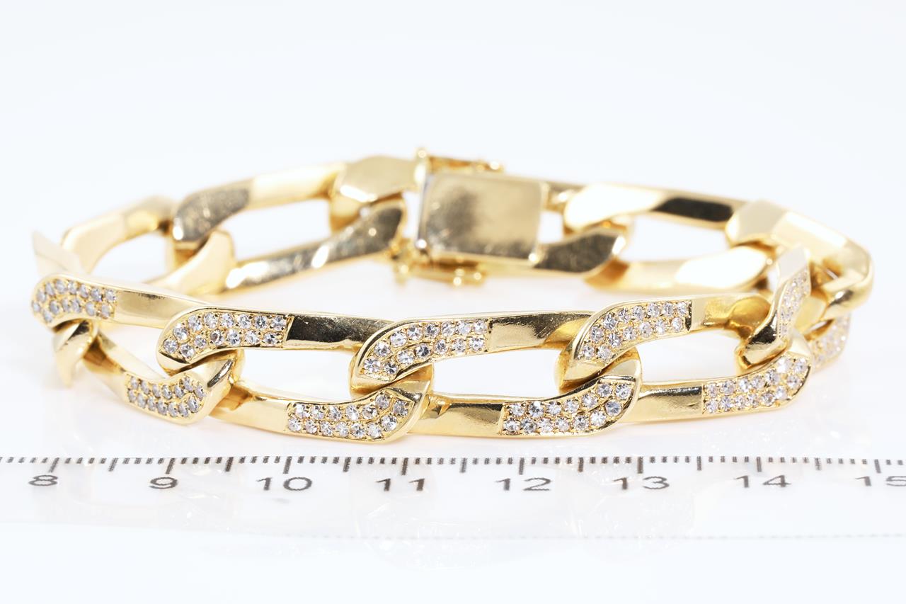 Diamond curb link bracelet with Diamonds totalling approximately 3.08cts (Estimated grading: G-H VS). 18ct yellow gold. Length: 20cm. Weight: 70.3g. With certificate #414415. (Pre-owned)