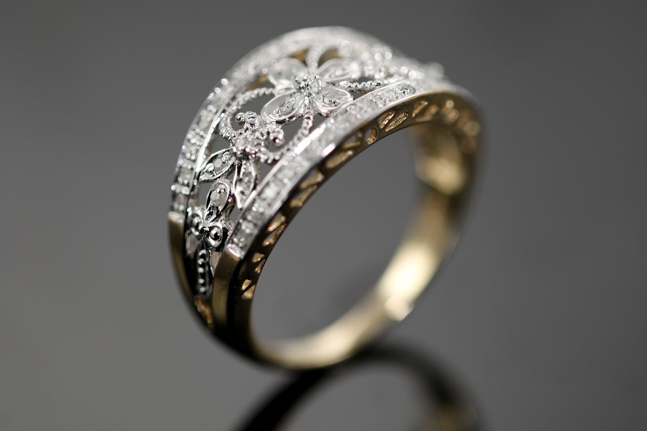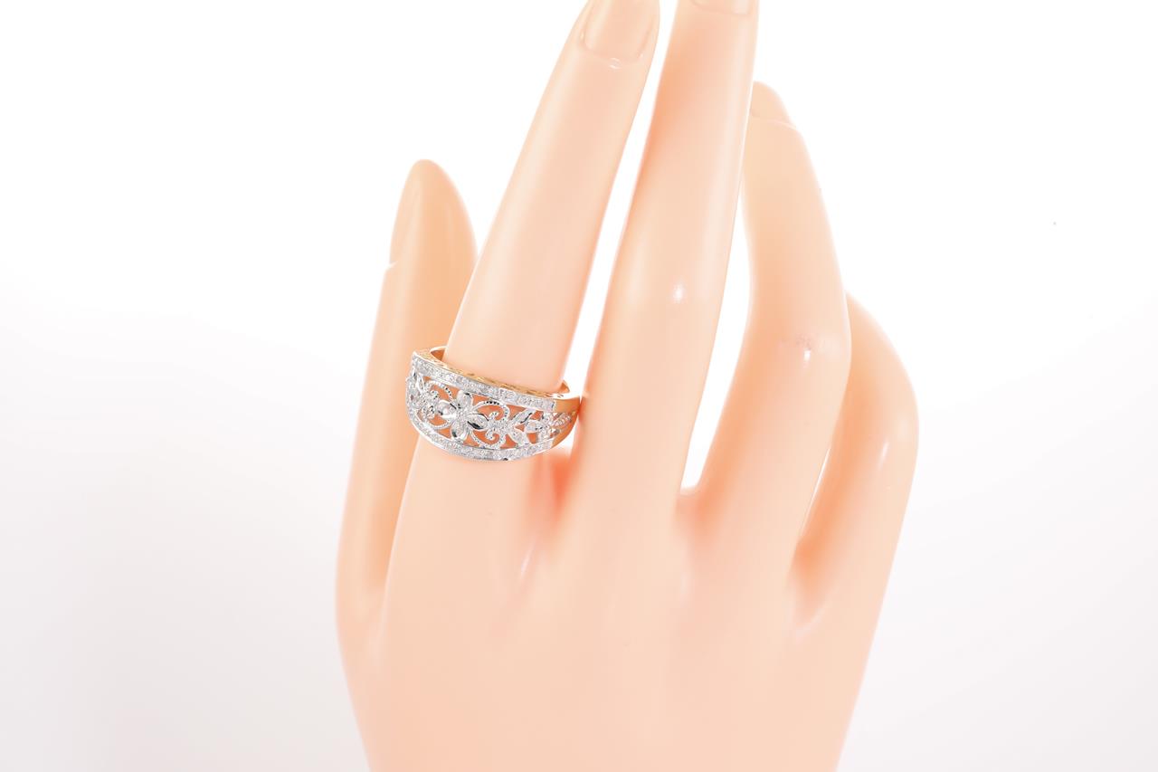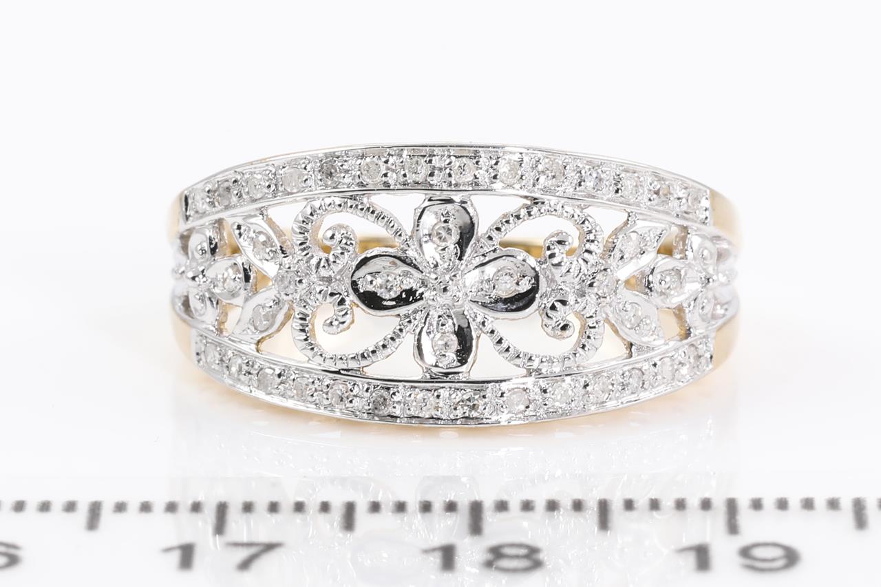 Diamond dress ring with round Diamonds totalling approximately 0.20cts (Estimated grading: G-H P3). 9ct white and yellow gold. Ring size S. Weight 3.9g. (Pre-owned)
