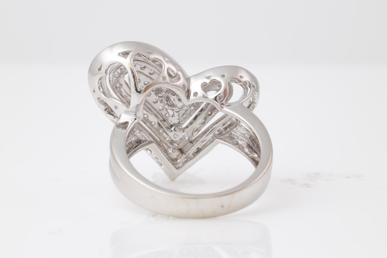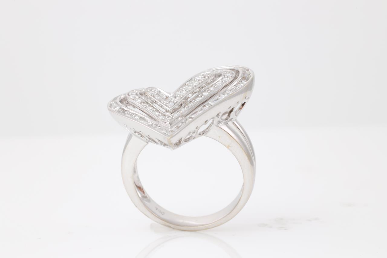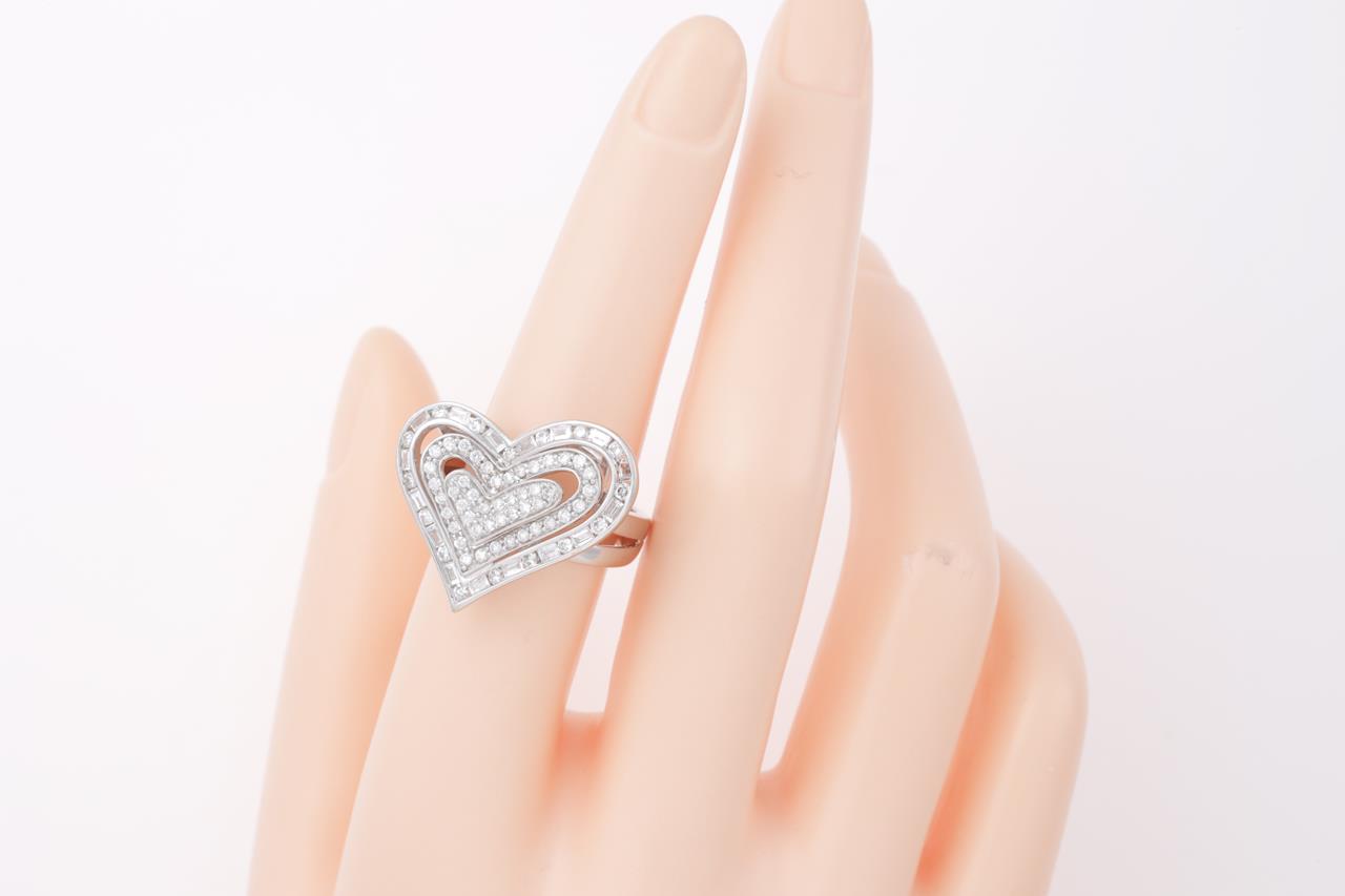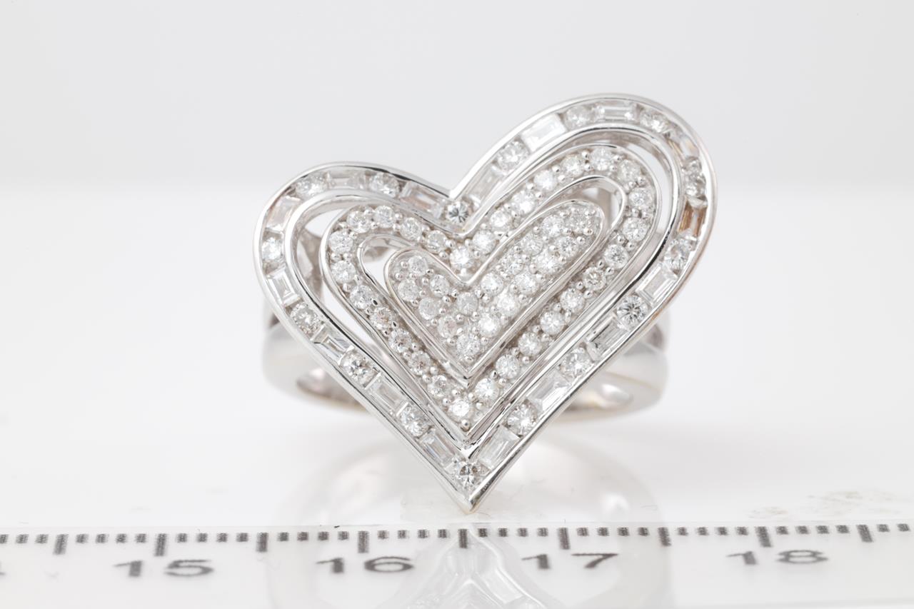 Diamond Dress Ring, heart design with baguette and round Diamonds totalling 1.50cts (Estimated grading H-I SI-P2). 18ct white gold. Ring size N. Weight 8.2g. (As New)