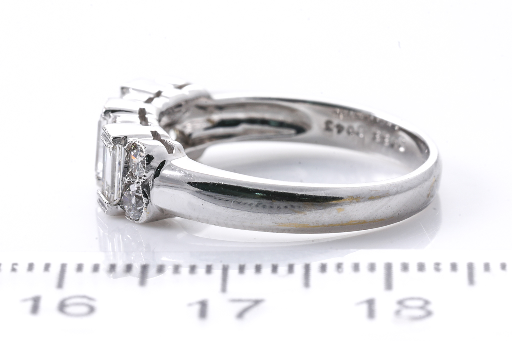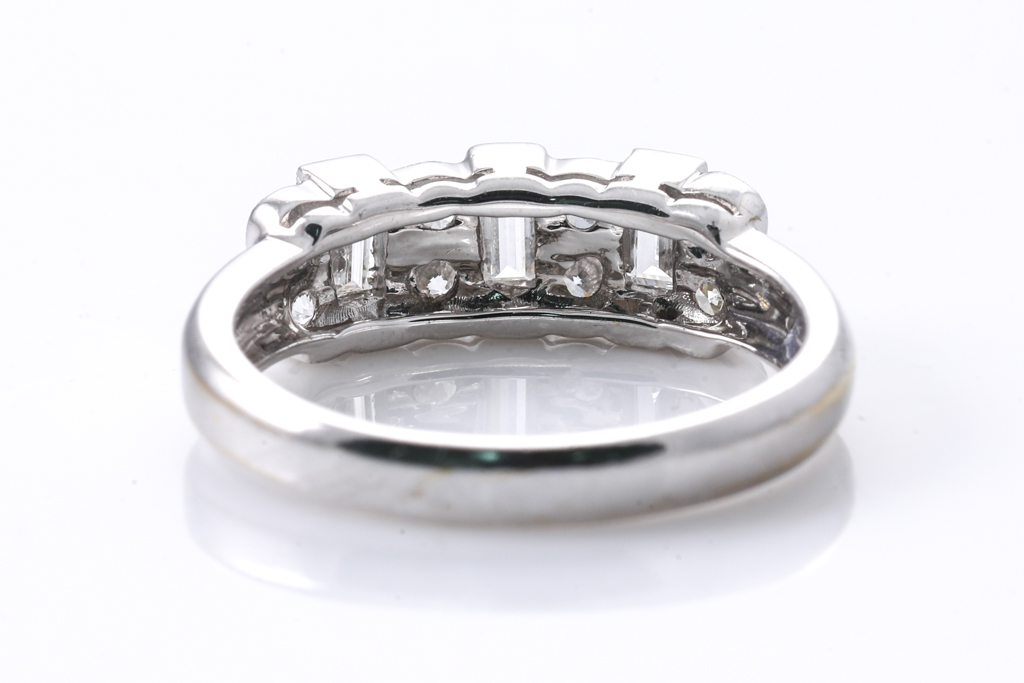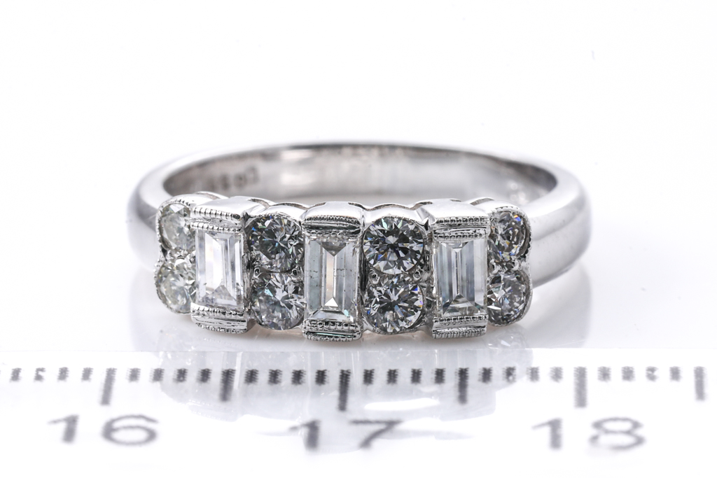 Diamond dress ring with round & baguette cut Diamonds totalling approximately 0.98cts (Estimated grading H-I SI). 18ct white gold. Ring size N. Weight 4.2g. (Pre-owned)