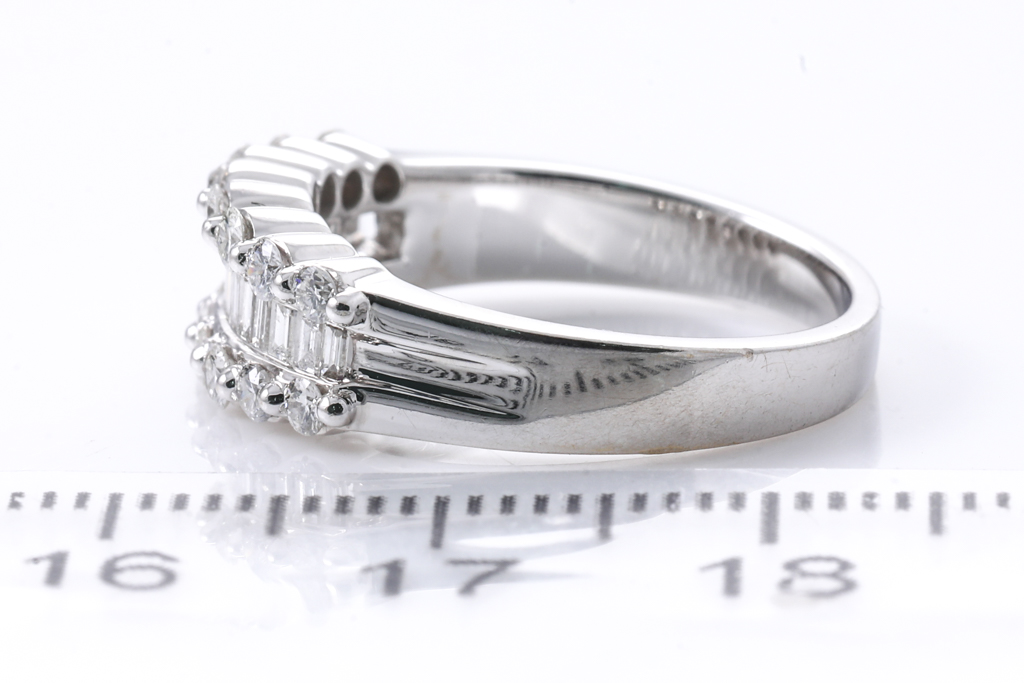 Diamond dress ring with baguette and round Diamonds totalling approximately 0.52cts (Estimated grading G SI). 18ct white gold. Ring size M. Weight 5.1g. (Pre-owned)