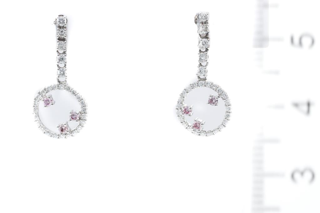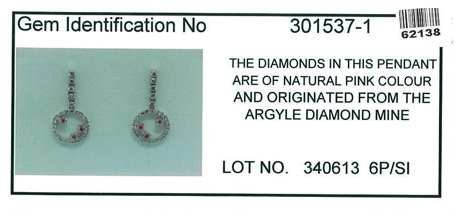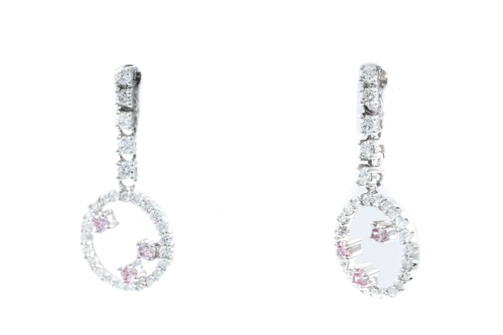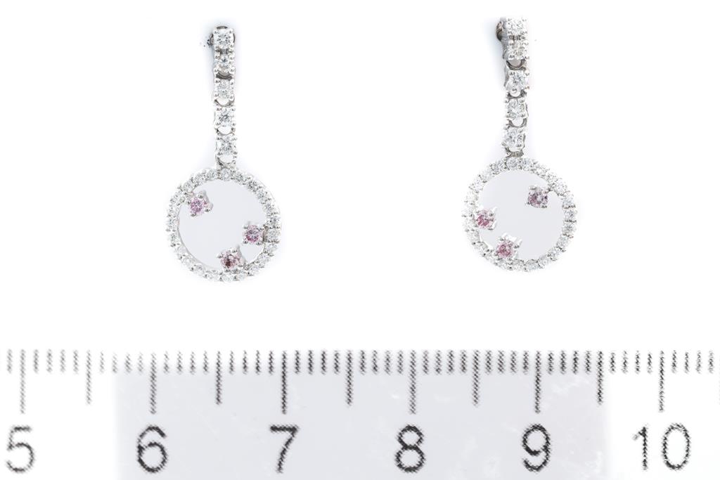 Diamond Drop Earrings with six round natural fancy pink Argyle Diamonds totalling 0.09ct and round Diamonds totalling 0.12cts. 18ct white gold. Weight 2.6g. With Gem Identification Report #301537-1.(As New)