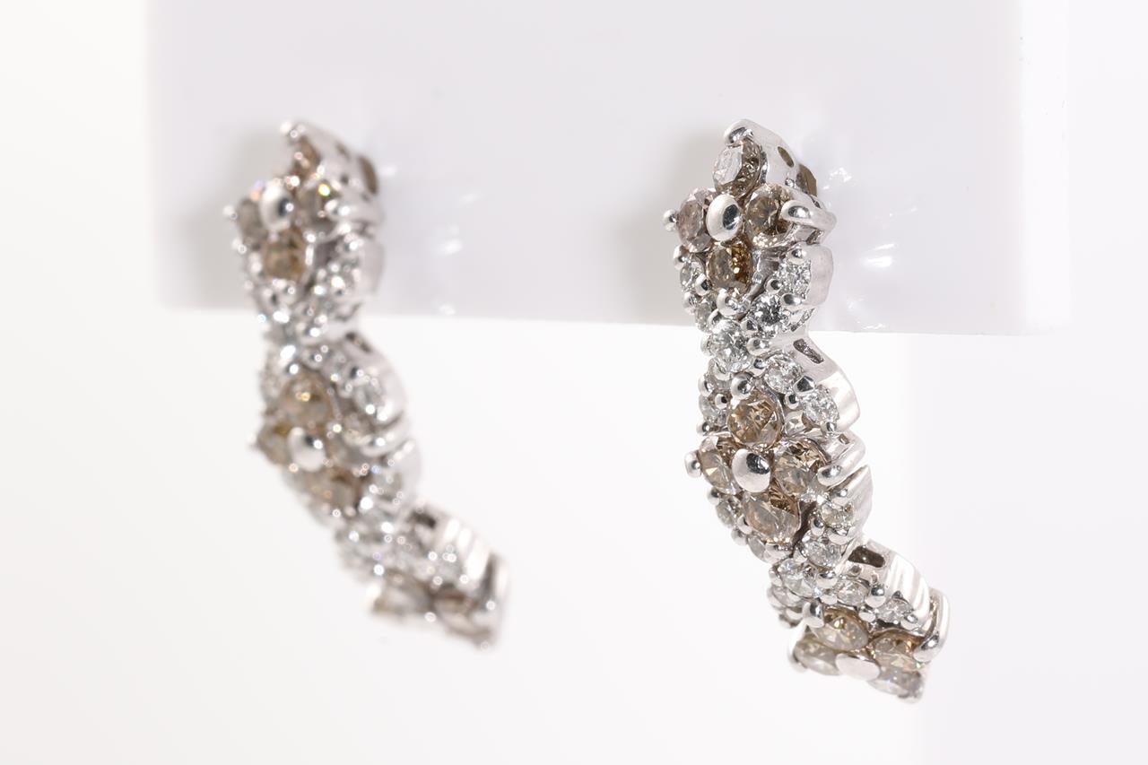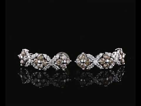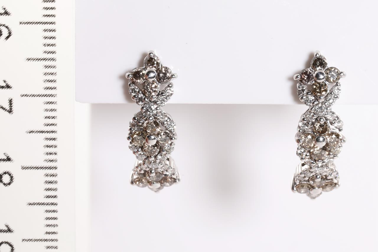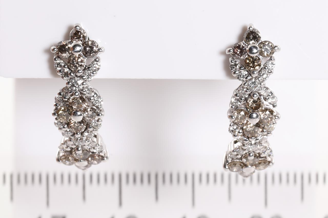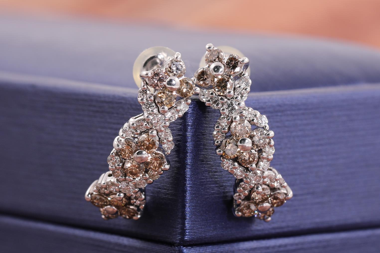Diamond Earrings with round champagne and white Diamonds totalling 2.05cts (Estimated grading: Champagne SI and H SI). 18ct white gold and 14ct white gold. Weight: 4.9g (Pre-owned)