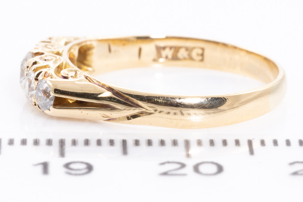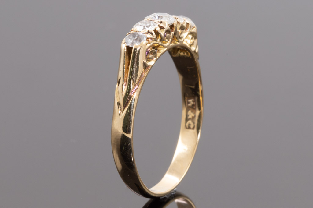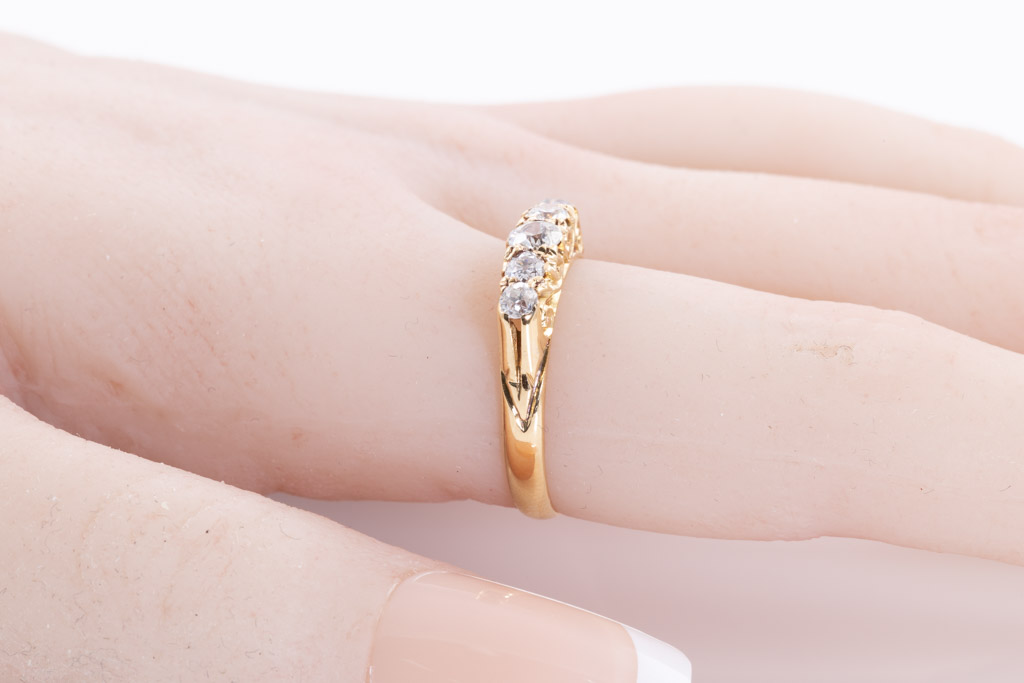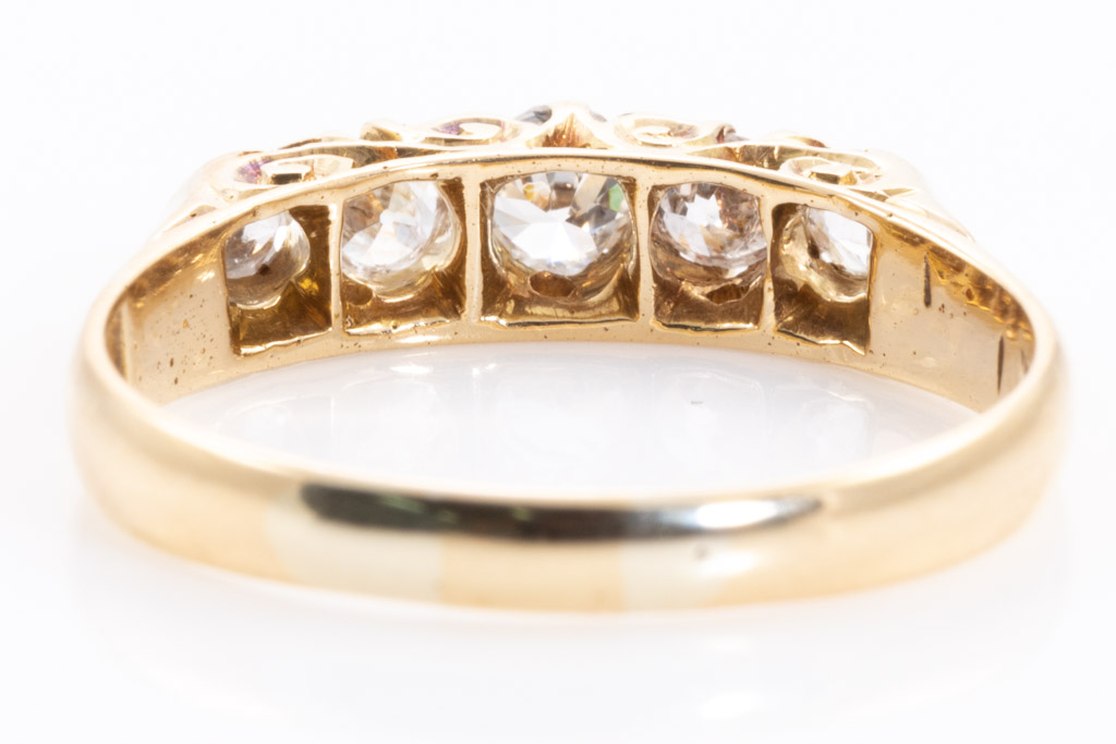 Diamond eternity ring with five old cut Diamonds totalling approximately 0.40cts (Estimated grading I-J P, 2 of Diamonds with surface reaching inclusions). 18ct yellow gold. Ring size M. Weight 2.7g. (Pre-owned)