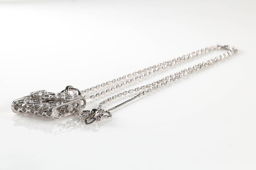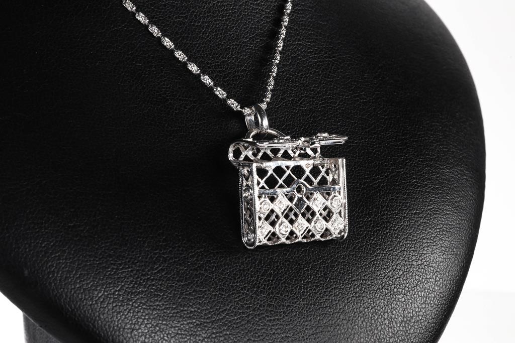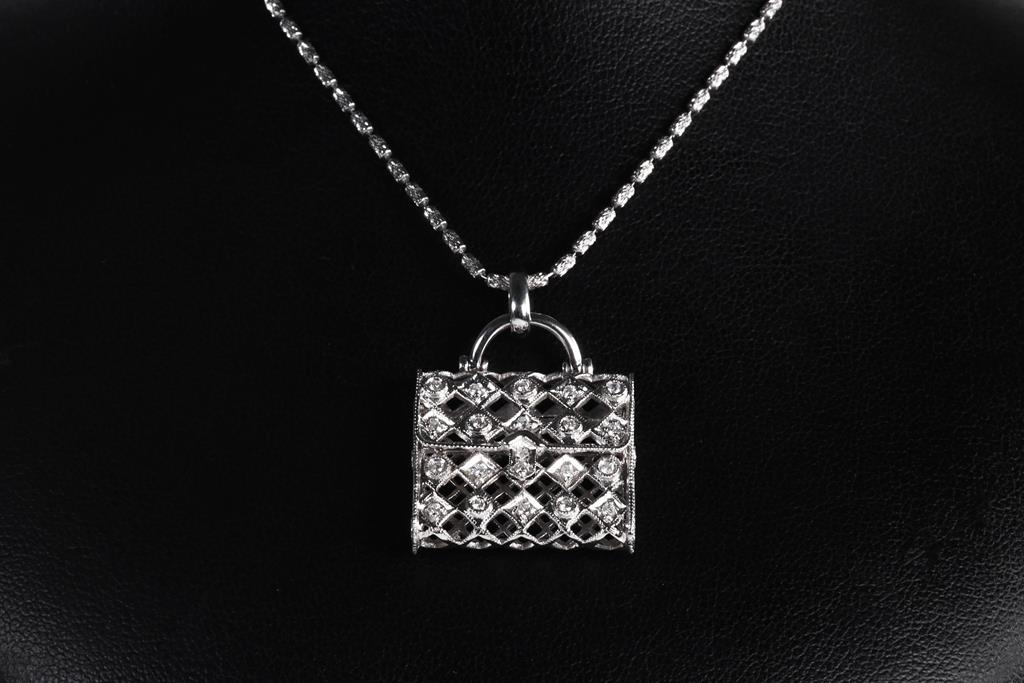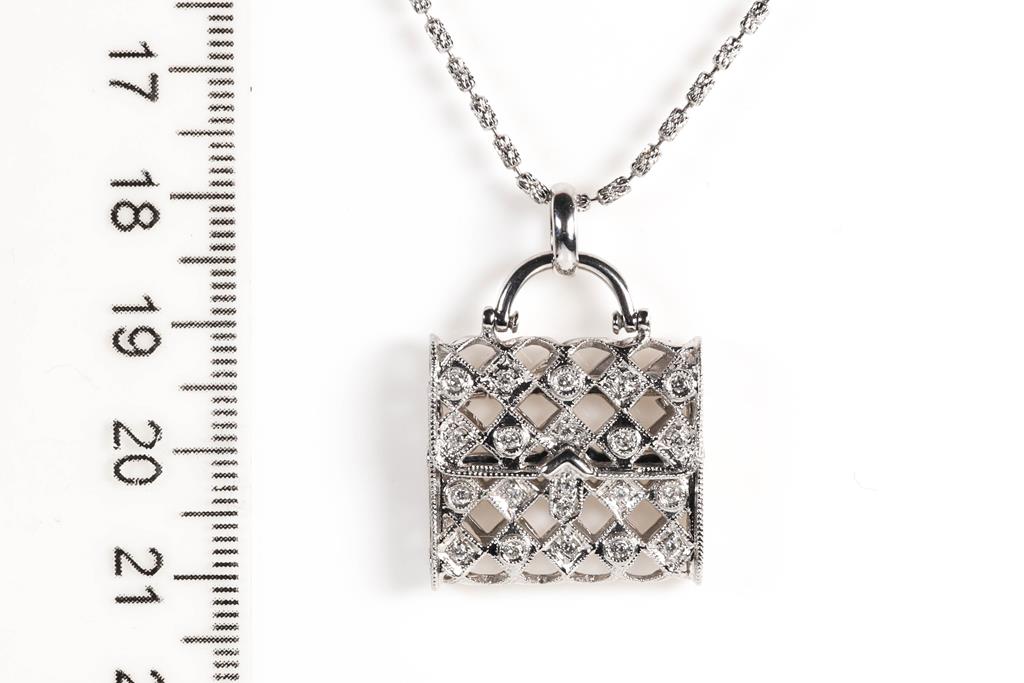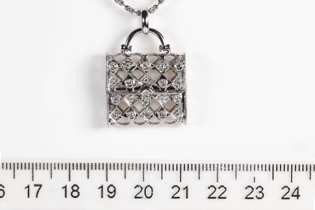 Diamond handbag design pendant with round Diamonds totalling 0.30cts (Estimated grading: G SI). 18ct white gold with adjustable 49cm chain. Weight: 12.5g. (Pre-owned)