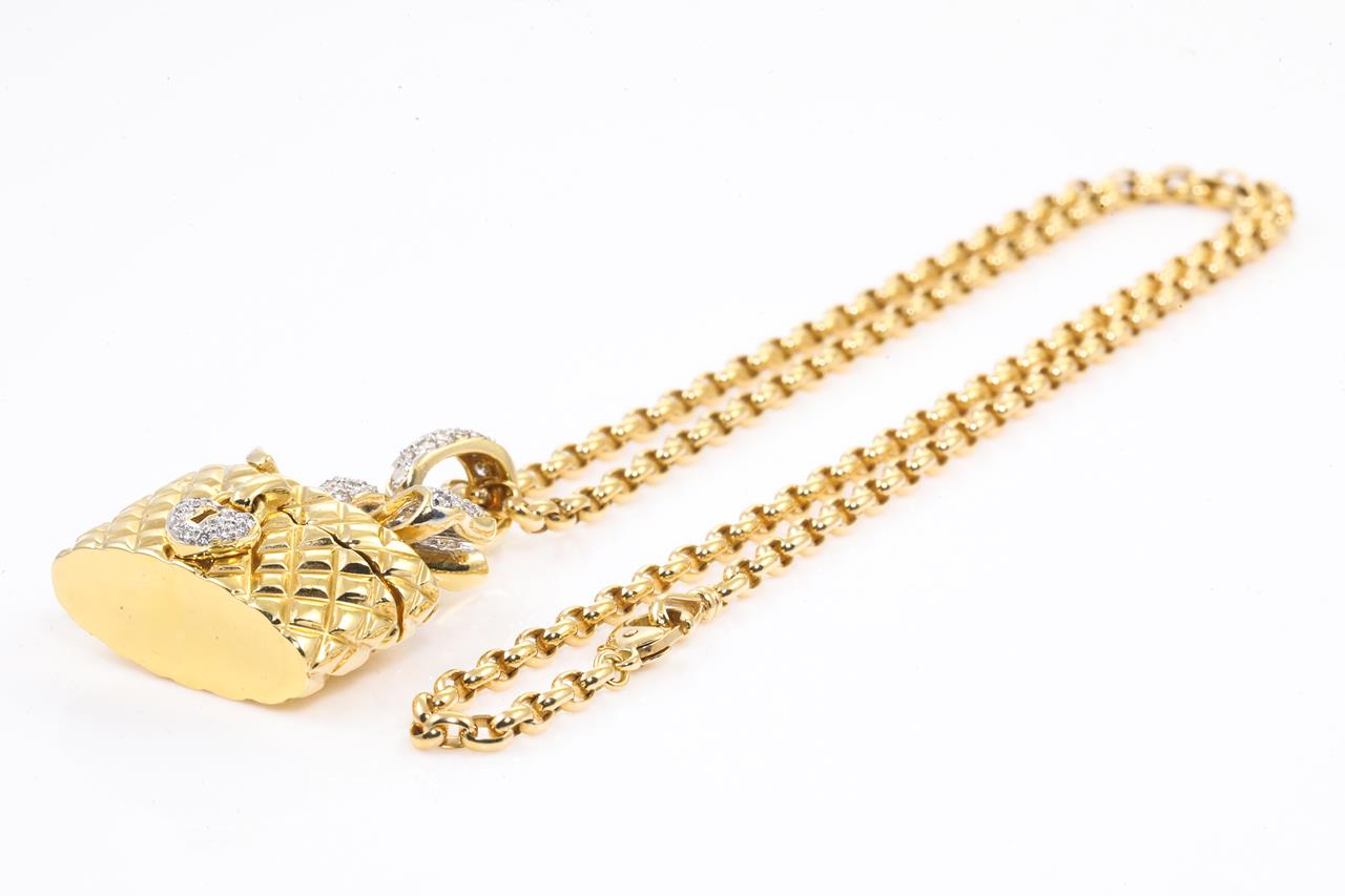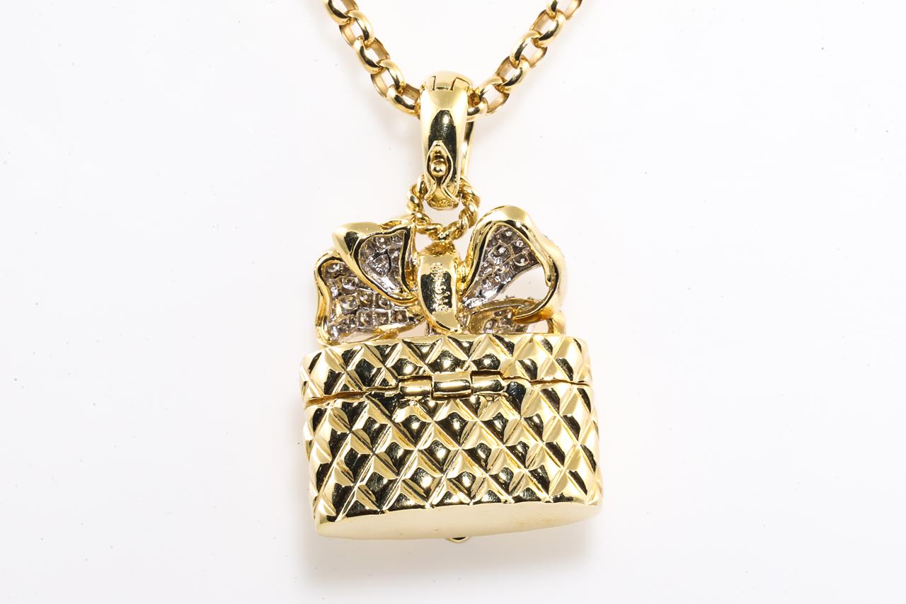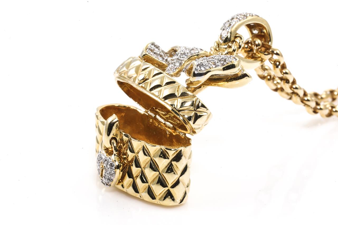 Diamond Handbag design enhancer/pendant with round Diamonds totalling 1.15cts (Estimated grading: G-H SI). 18ct yellow gold with 50cm chain. Weight: 32.7g. With certificate #415349. (Pre-owned)
