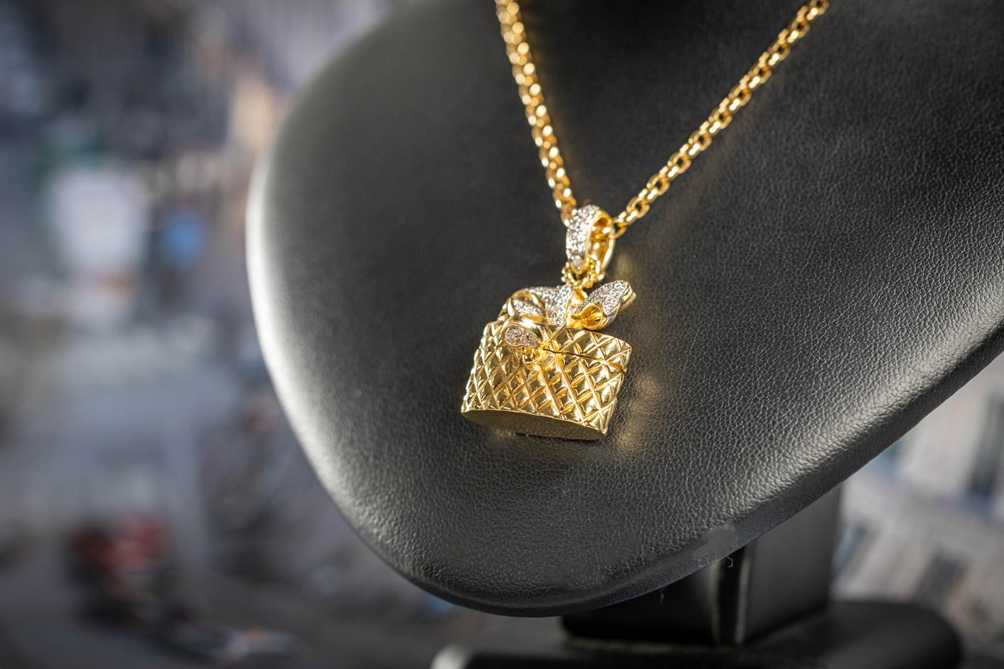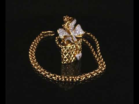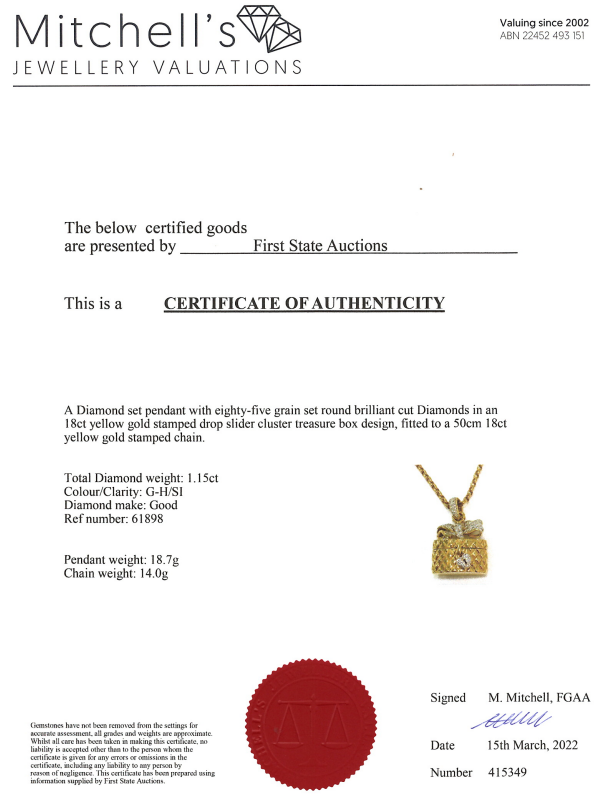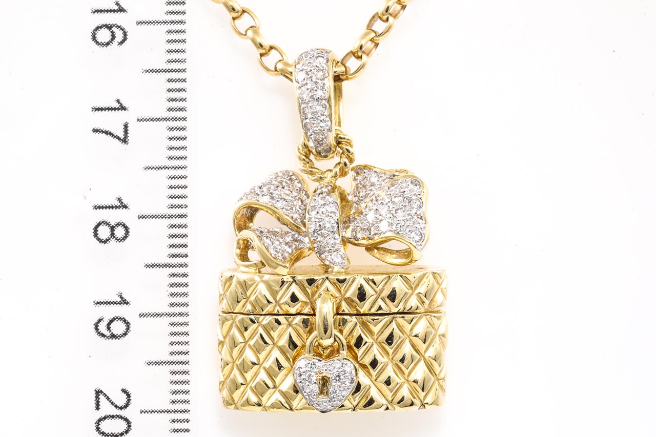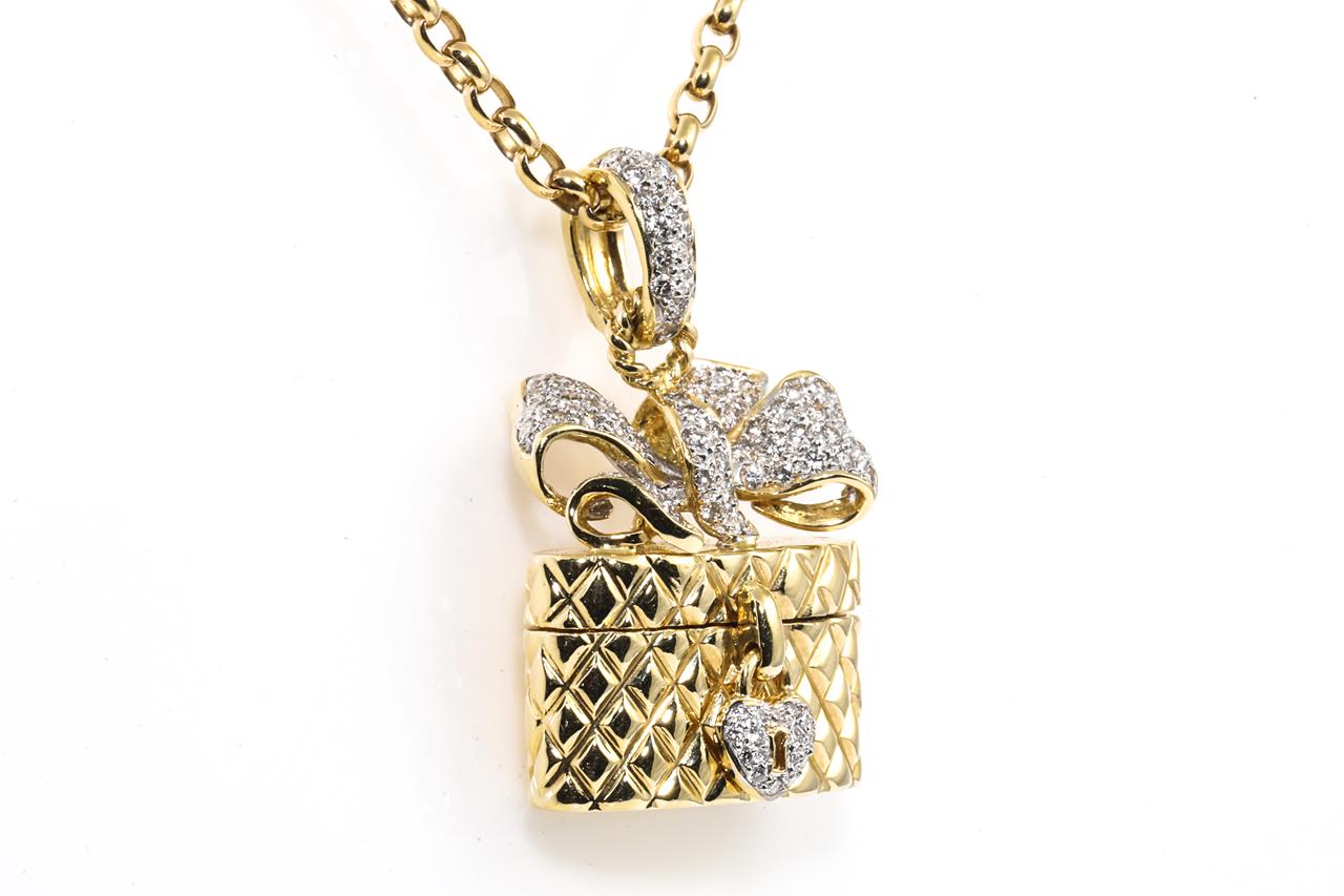 Diamond Handbag design enhancer/pendant with round Diamonds totalling 1.15cts (Estimated grading: G-H SI). 18ct yellow gold with 50cm chain. Weight: 32.7g. With certificate #415349. (Pre-owned)