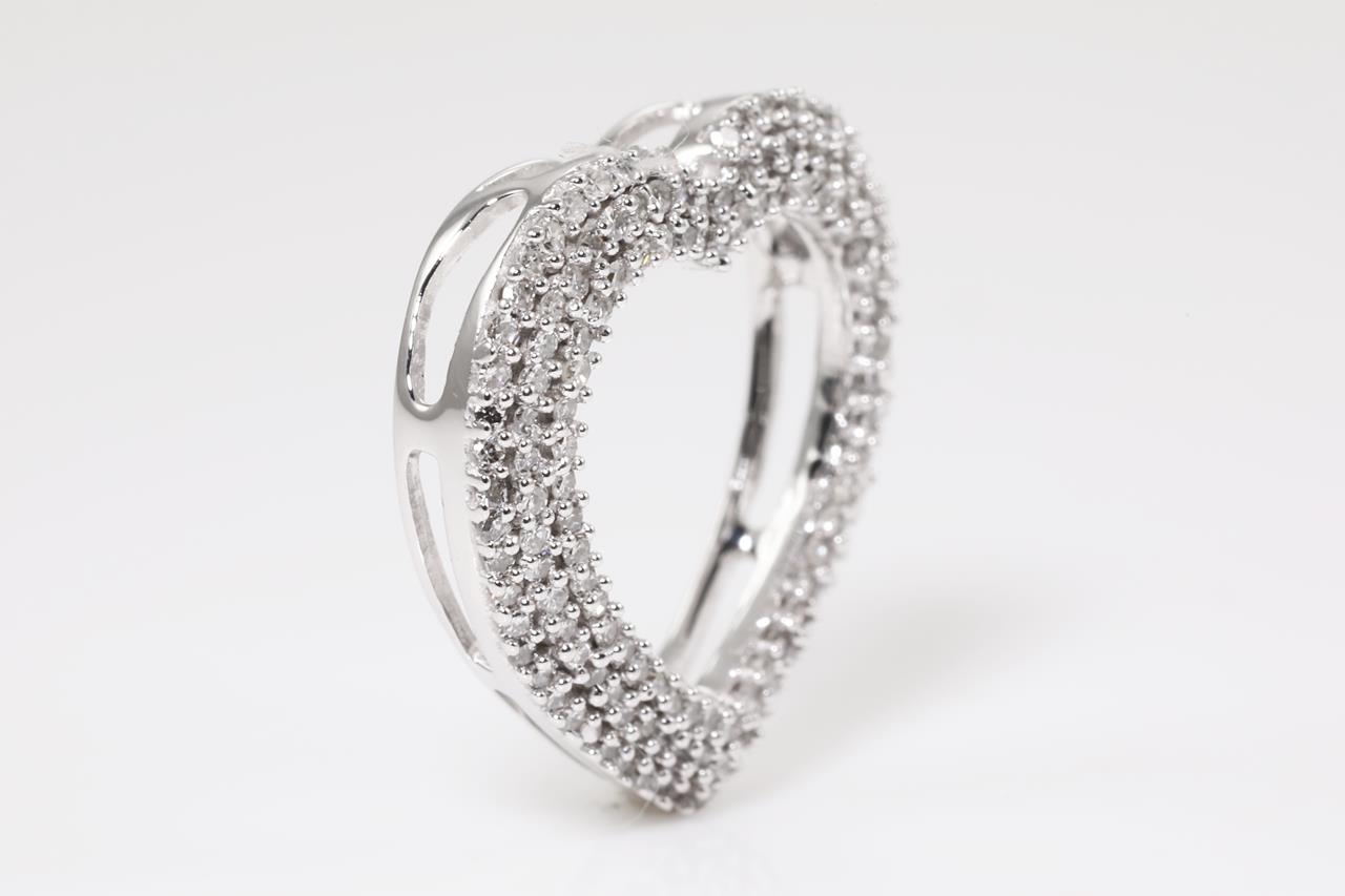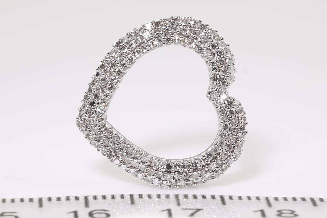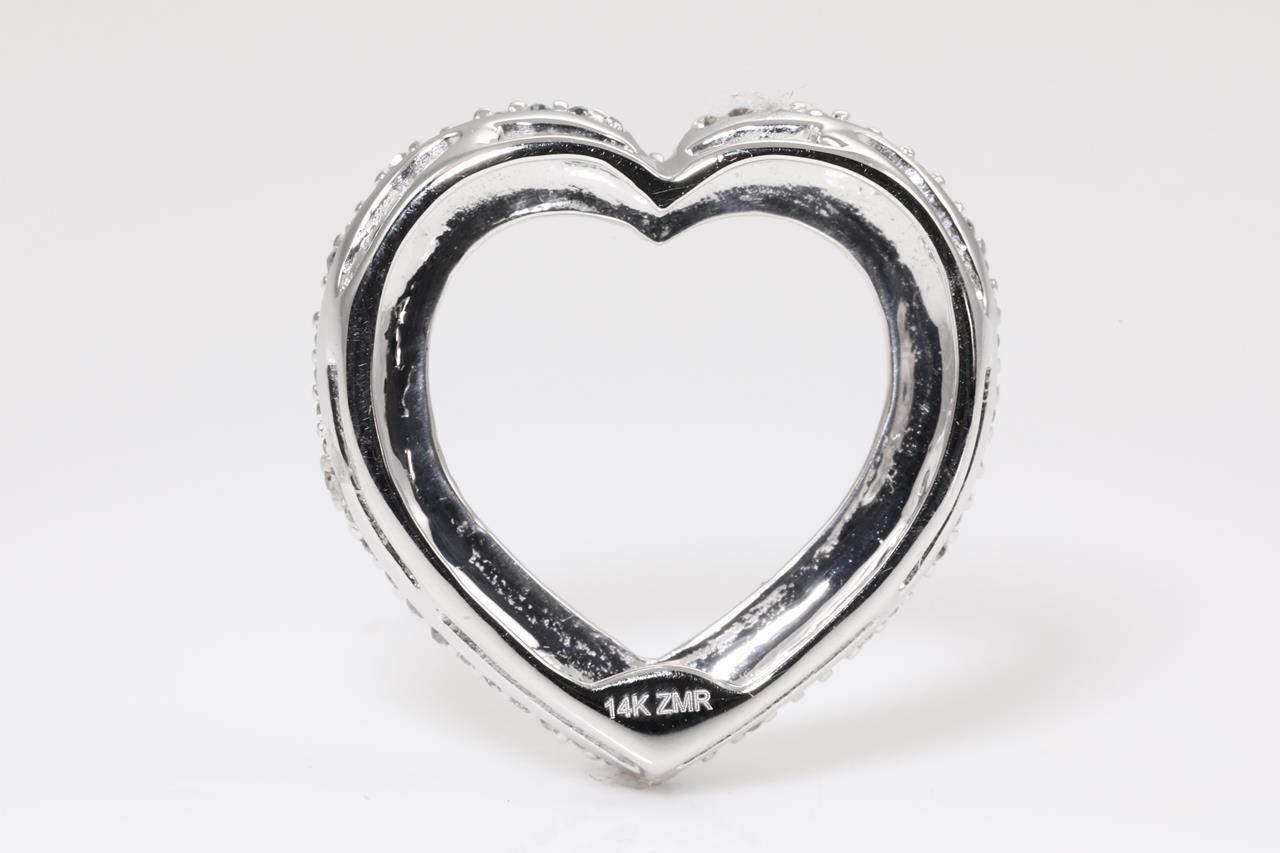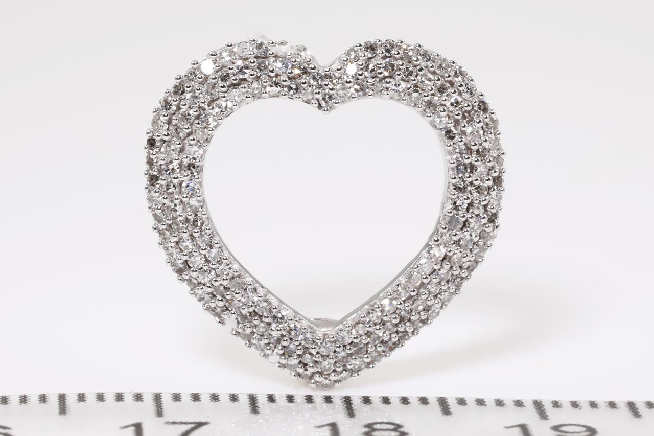 Diamond Heart Shaped Pendant with Diamonds totalling approximately 1.53cts (Estimated grading: I-J SI). 14ct white gold, no chain provided. Width 1.8cm. Weight 2.8g. (Pre-owned)