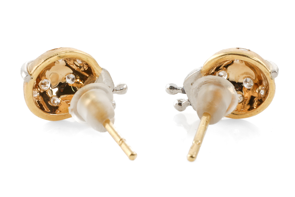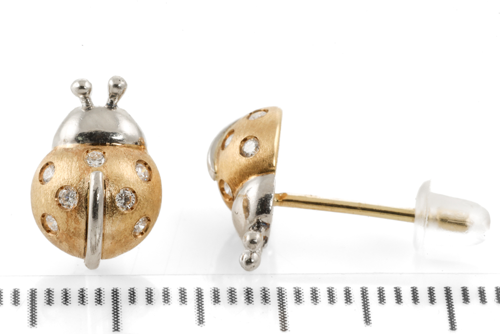 Diamond ladybug designed stud earrings with round Diamonds totalling approximately 0.11cts. 18ct yellow gold and platinum with silicon backs. Weight: 2.8g. (Pre-owned)