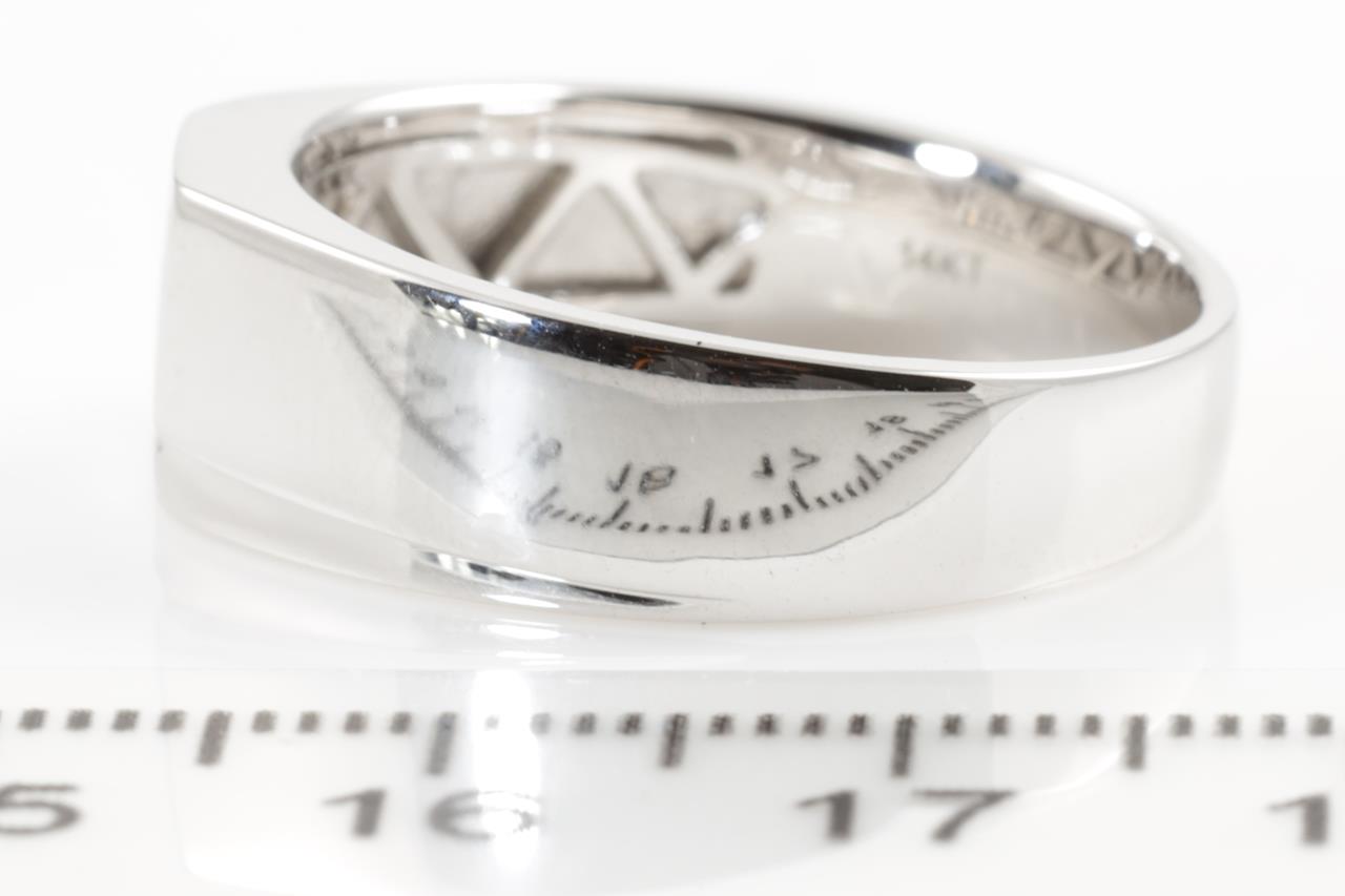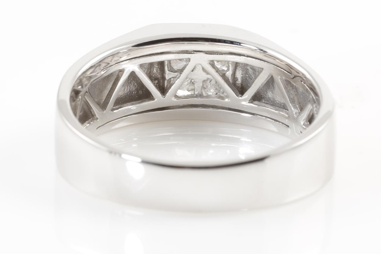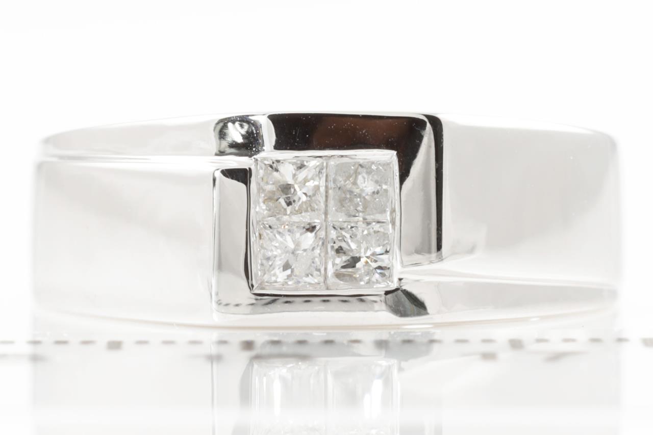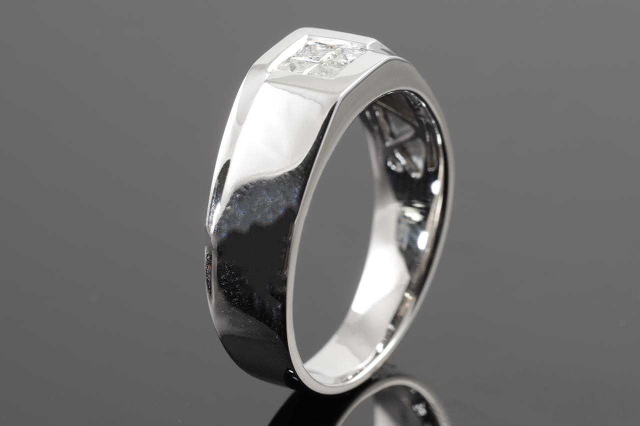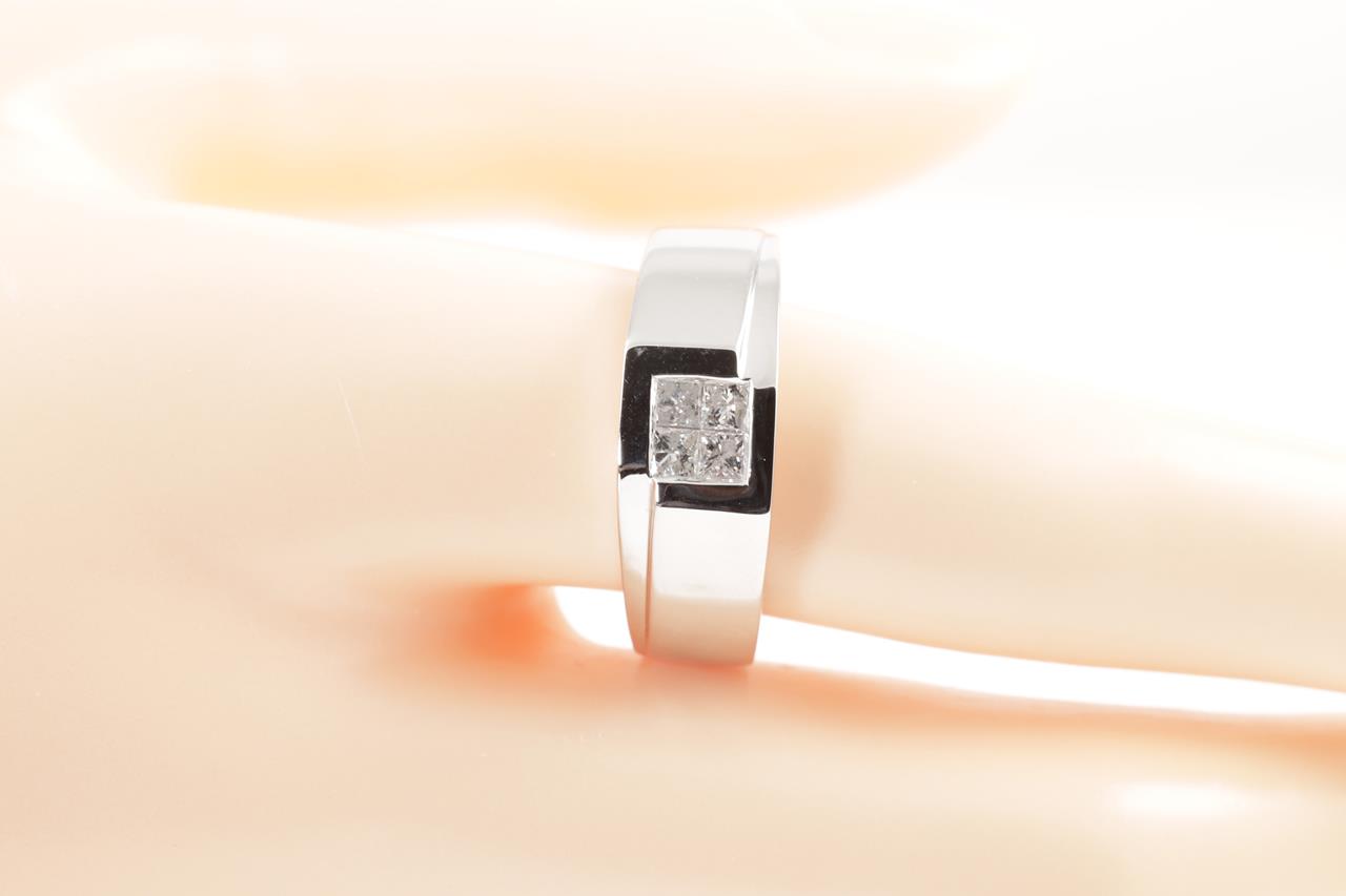 Mens ring with 4 princess cut Diamonds totalling 0.41cts (Estimated grading: H SI-P1). 14ct white gold. Ring size U - ring resizing is not recommended. Weight: 8.2g. (New)