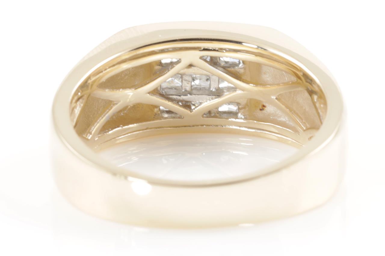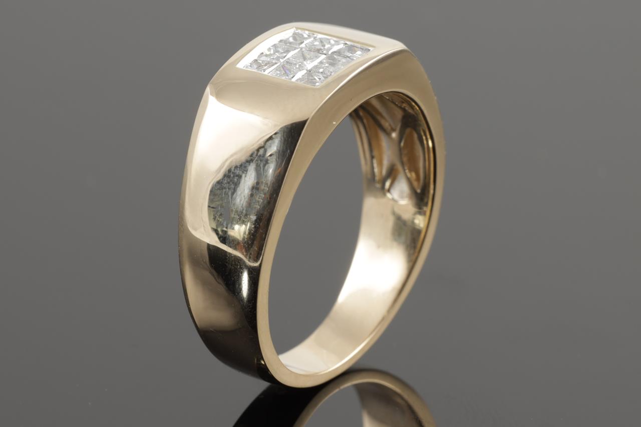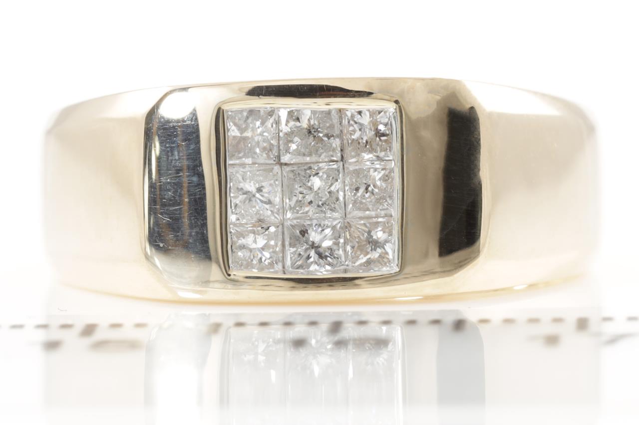 Mens ring with 9 princess cut Diamonds totalling 0.78cts (Estimated grading: H P1-2). 9ct yellow gold. Ring size V. Weight: 8.0g. (New)