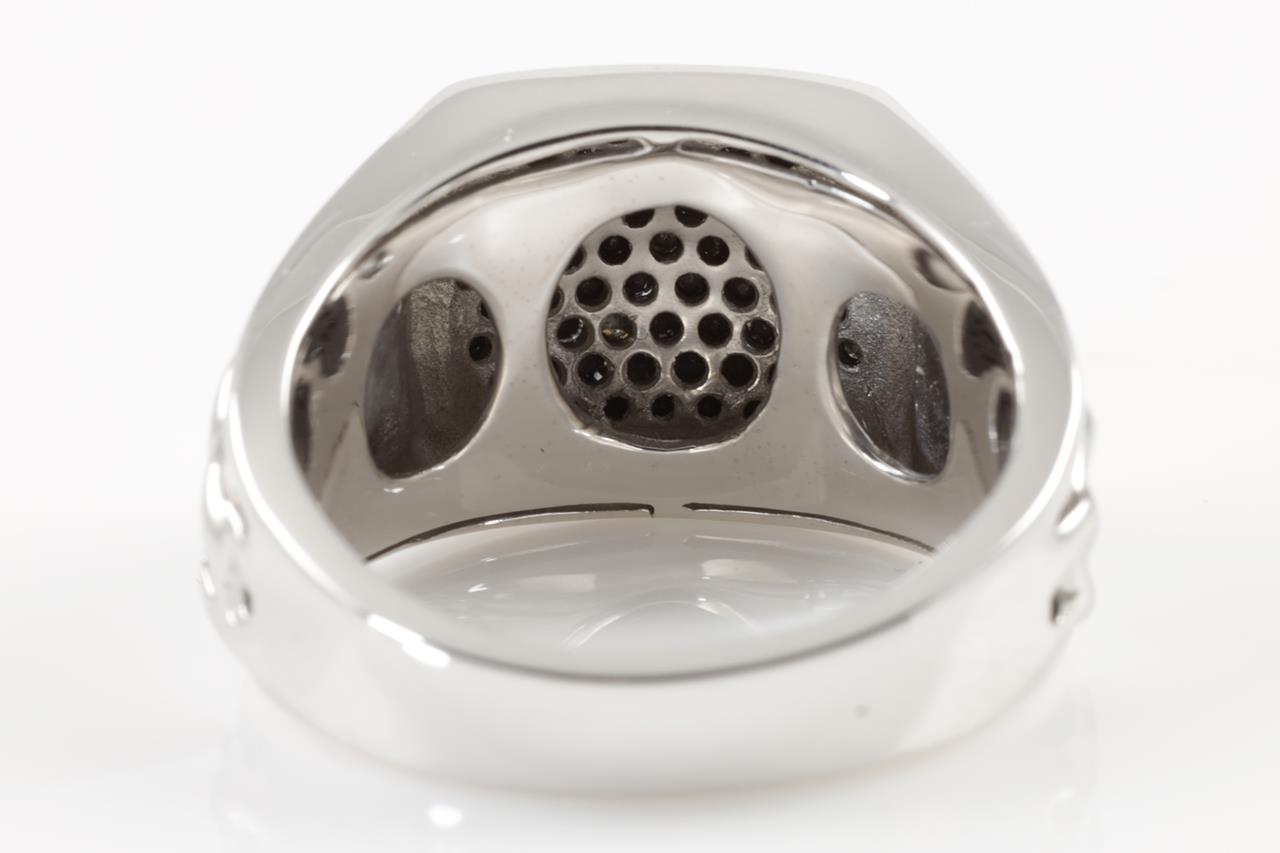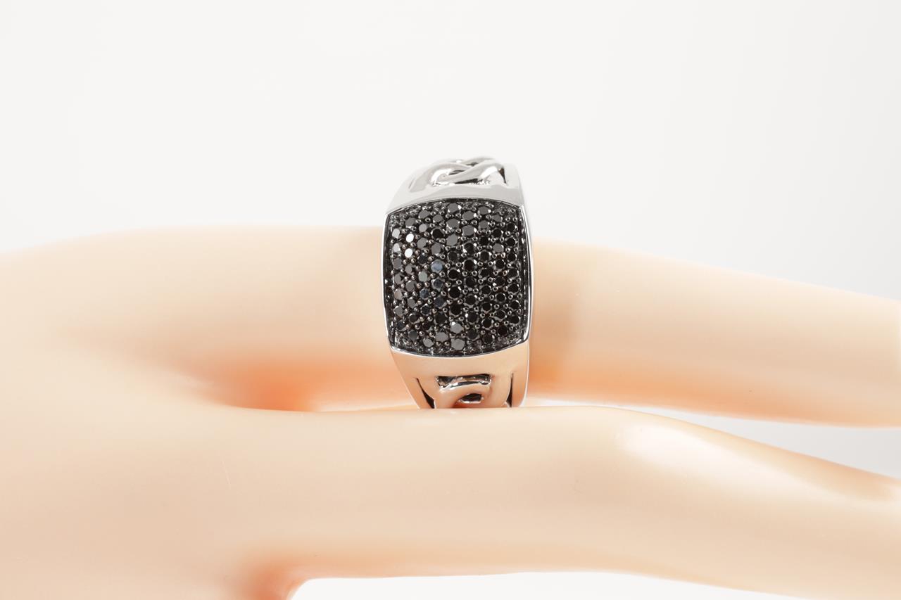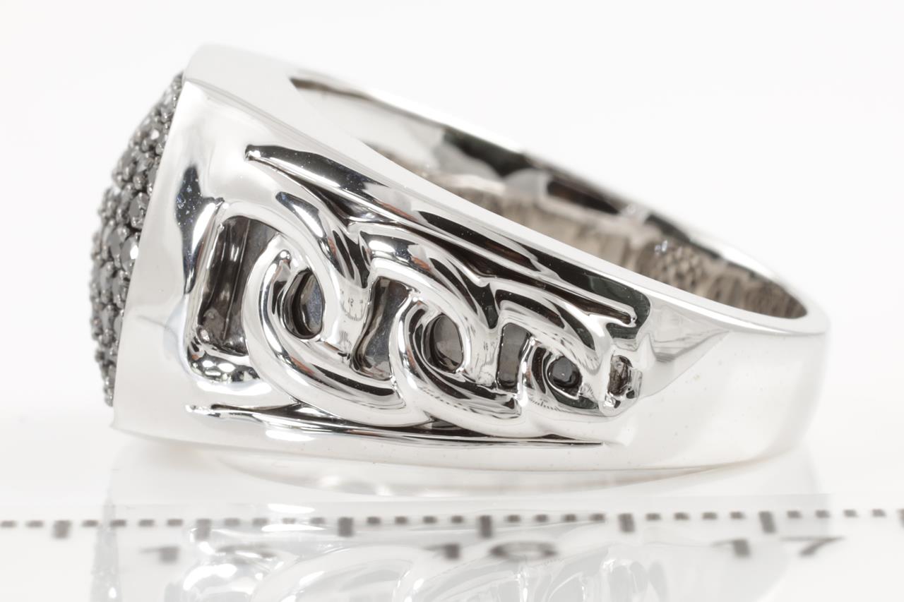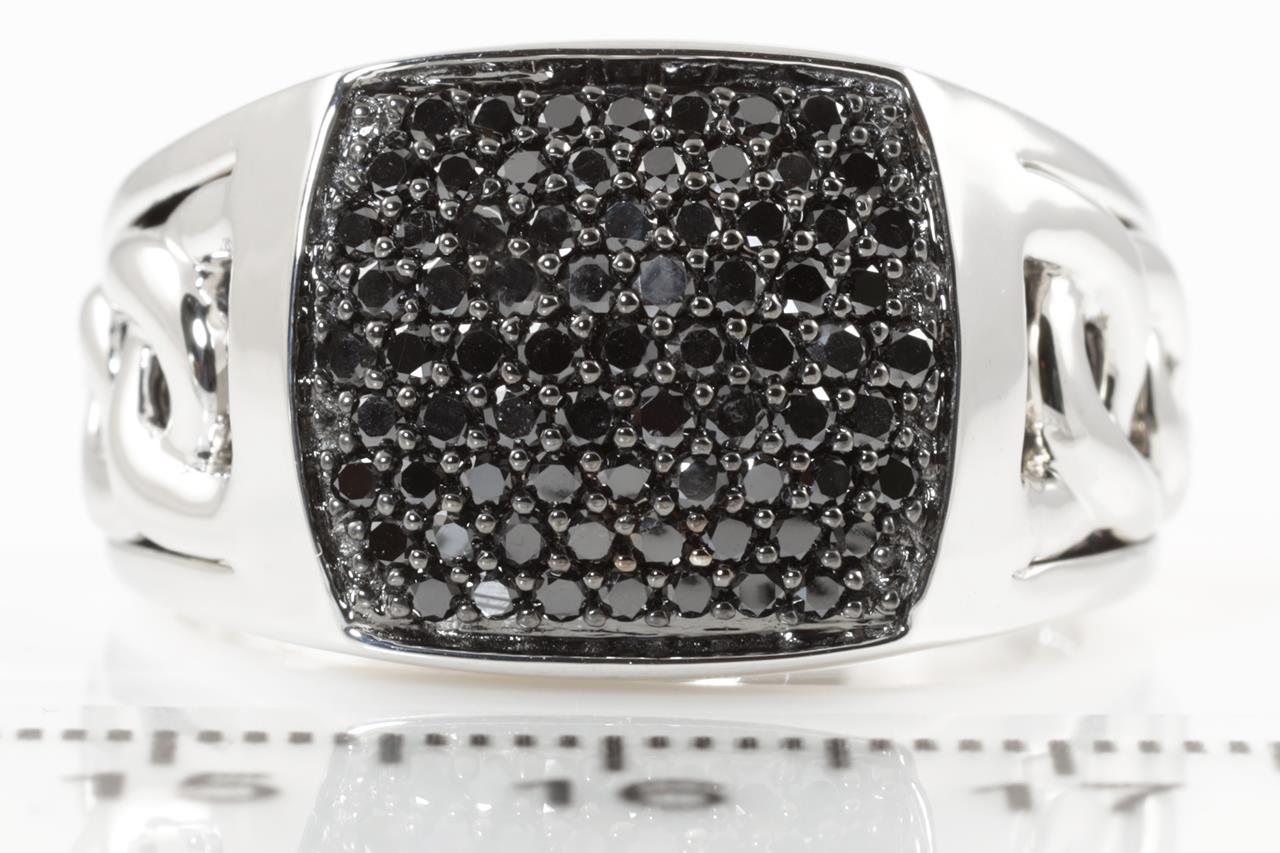 Mens ring with 73 black Diamonds totalling 1.01cts (Colour may be treated). 9ct white gold. Ring size U - ring resizing is not recommended. Weight: 13.5g. (New)