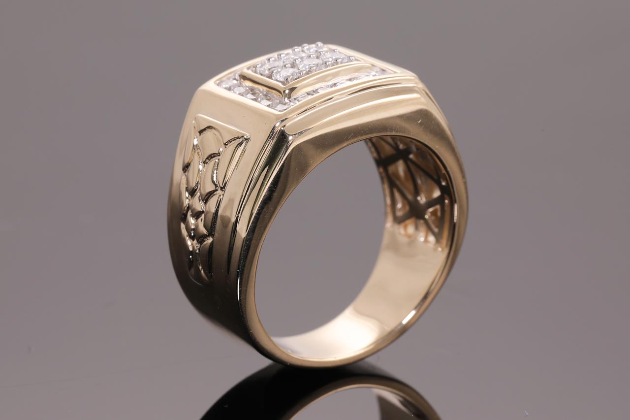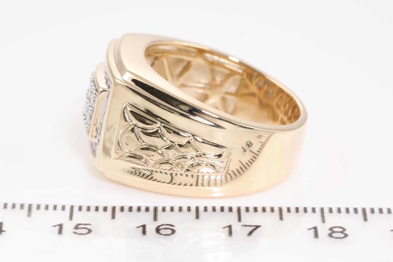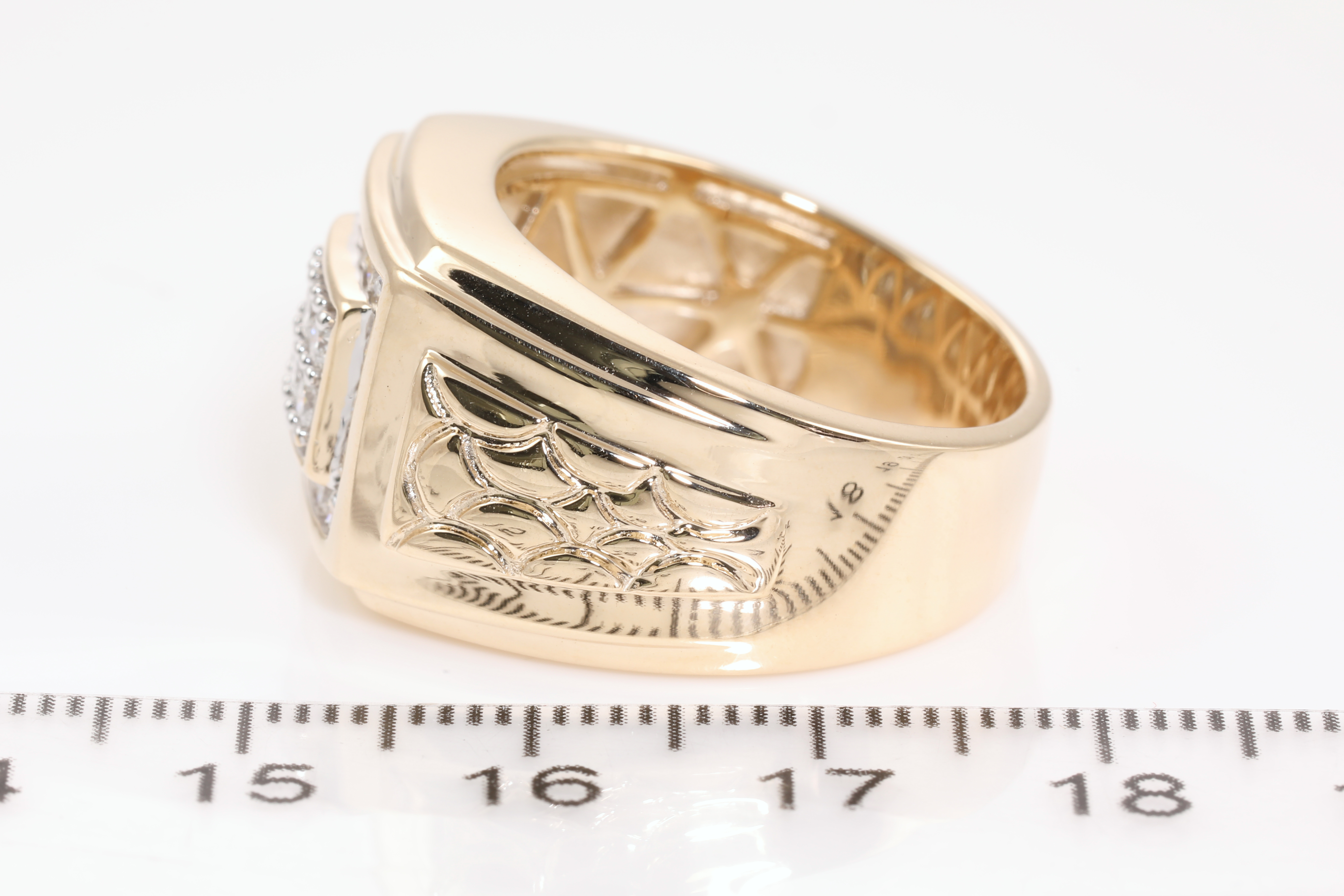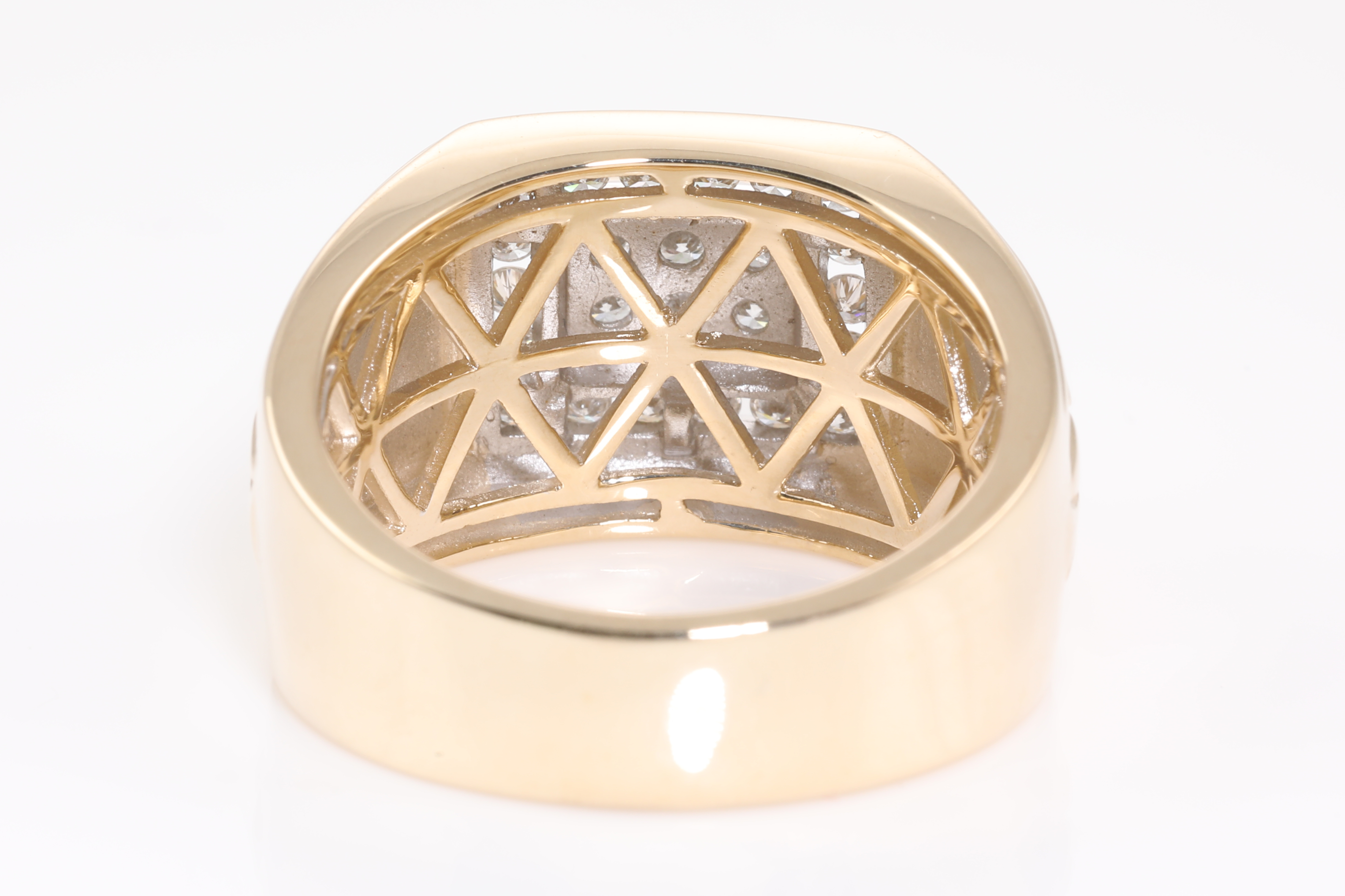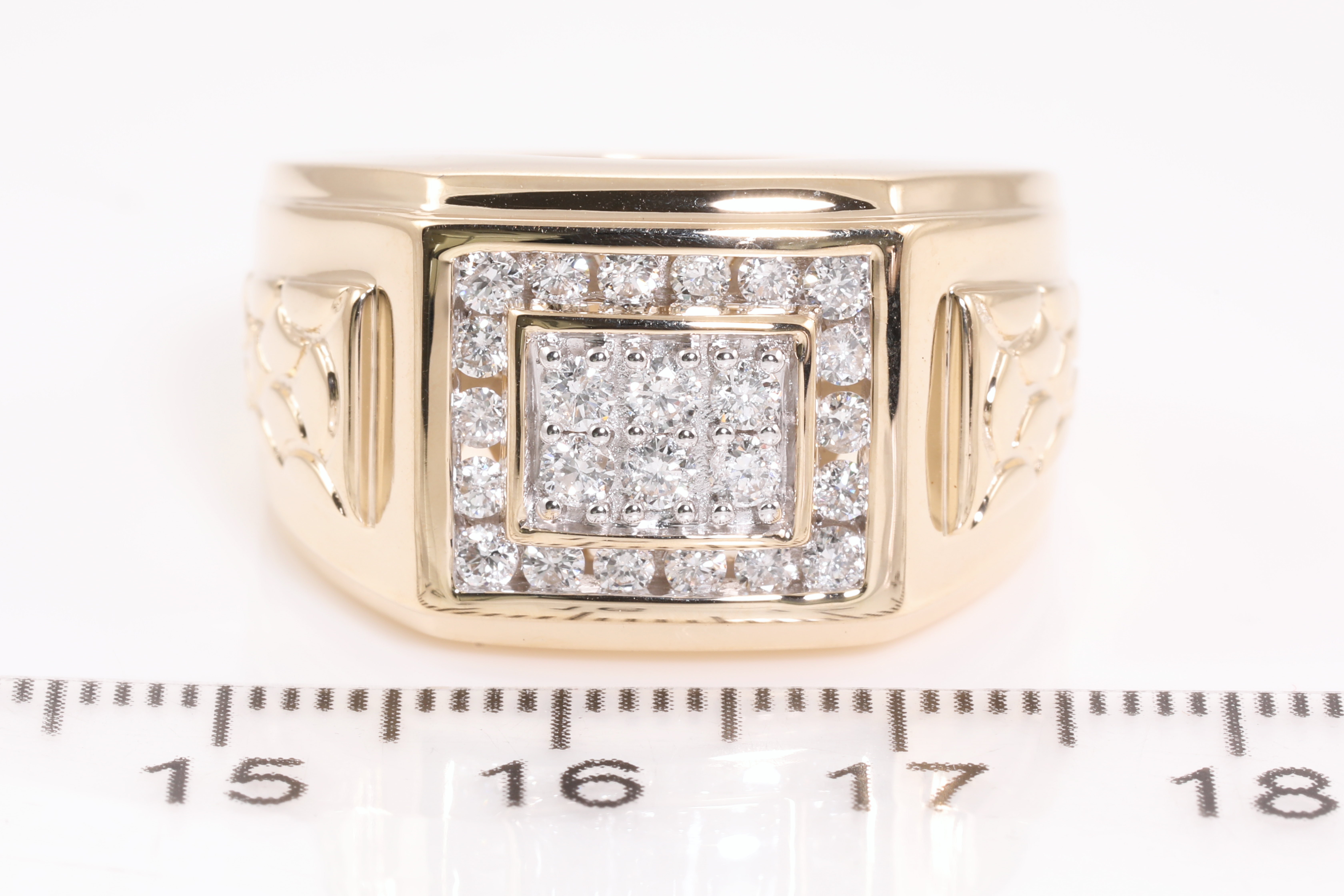Mens ring with 24 round Diamonds totalling 0.74cts (Estimated grading: H SI). 9ct yellow gold. Ring size U. Weight: 14.6g. (New)