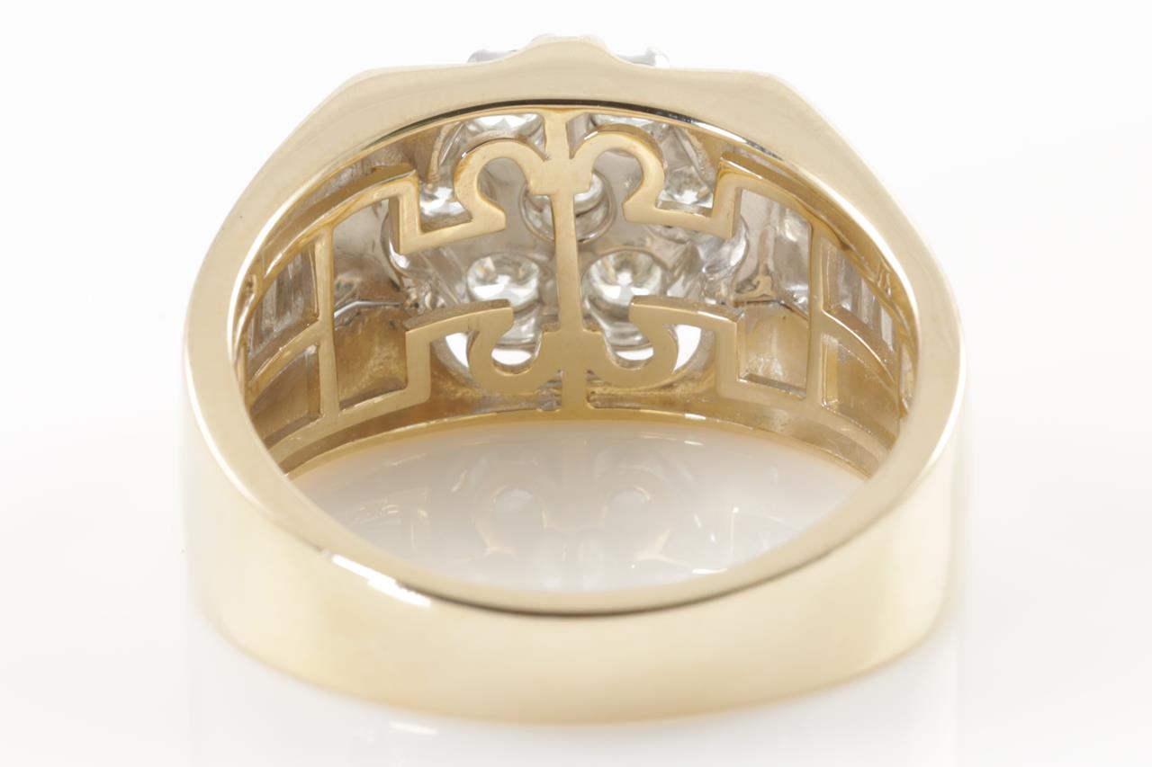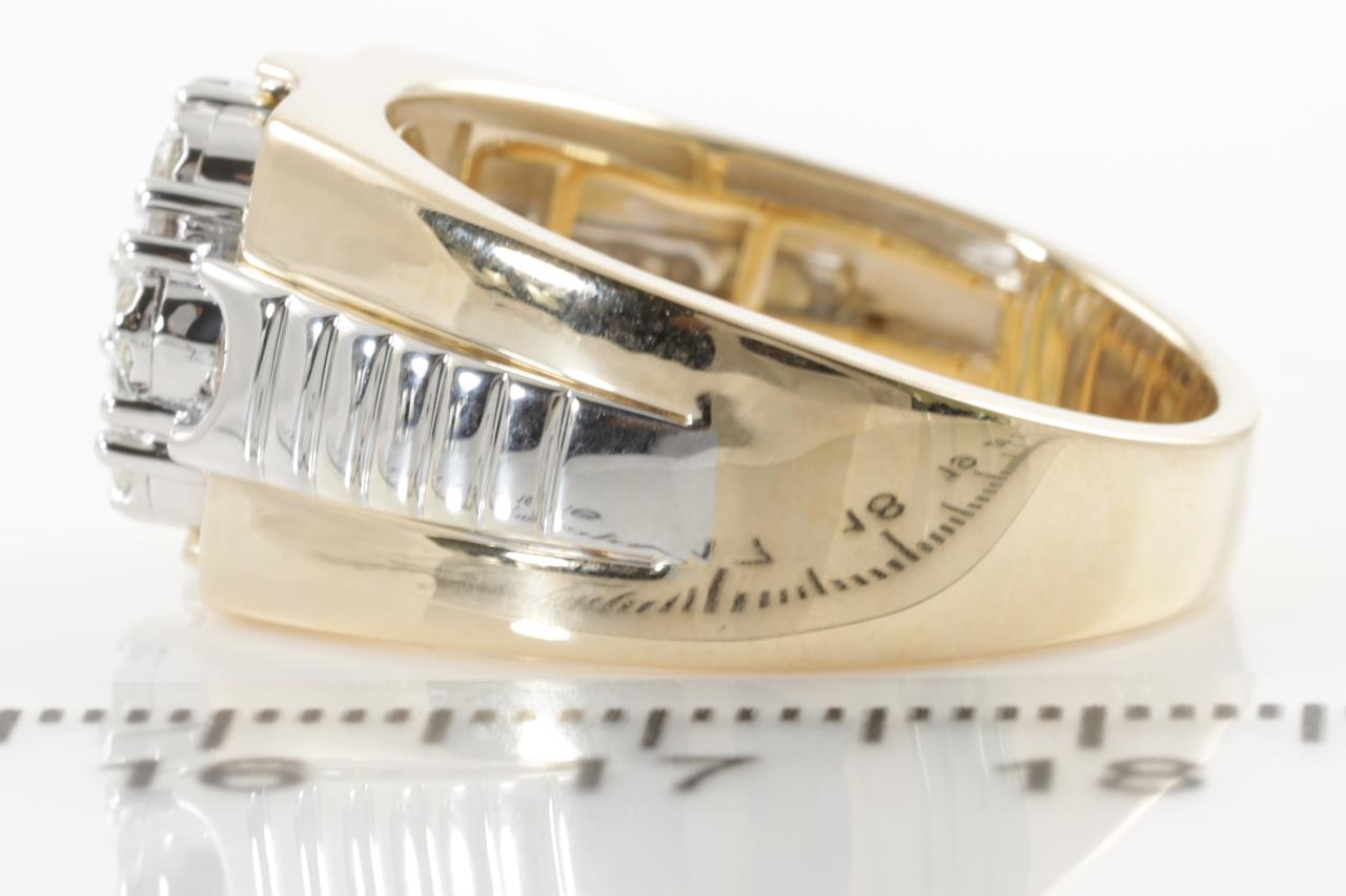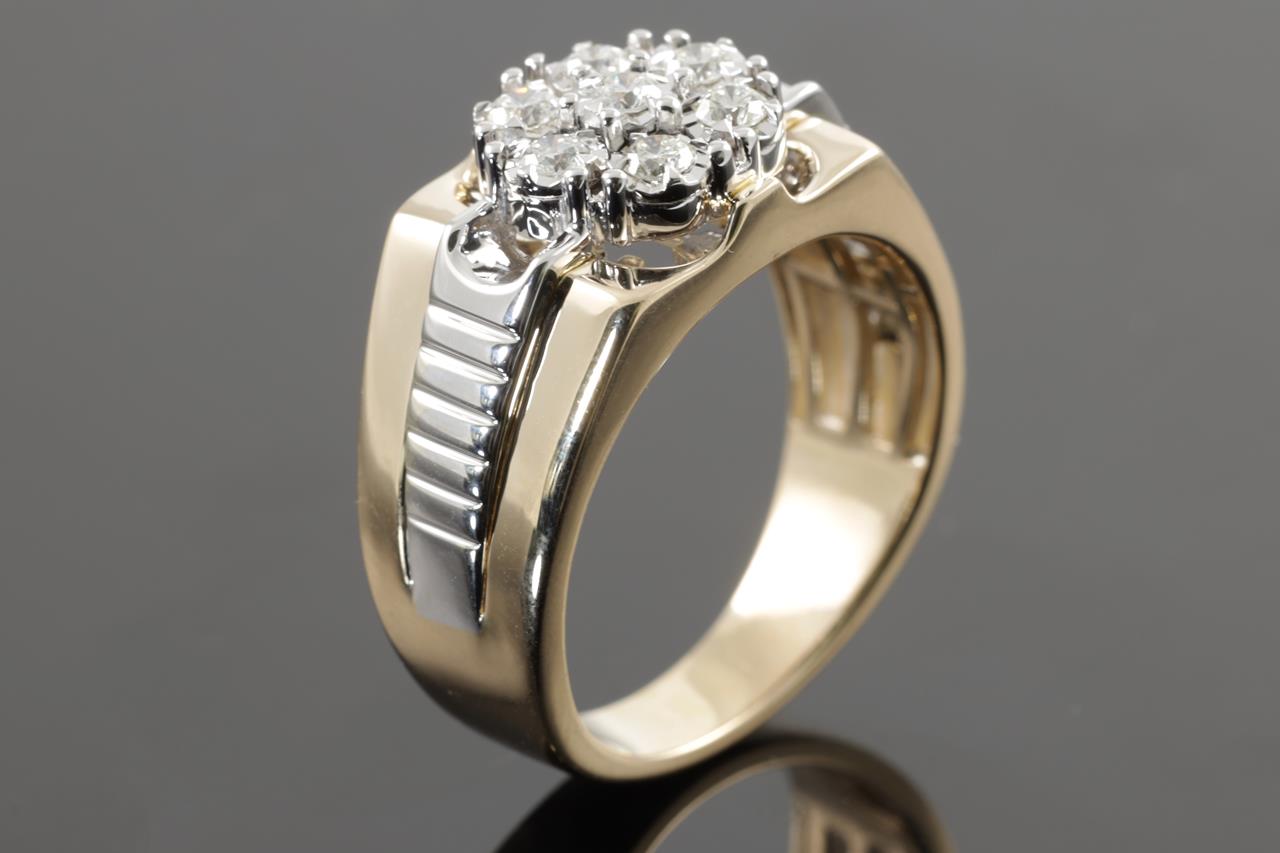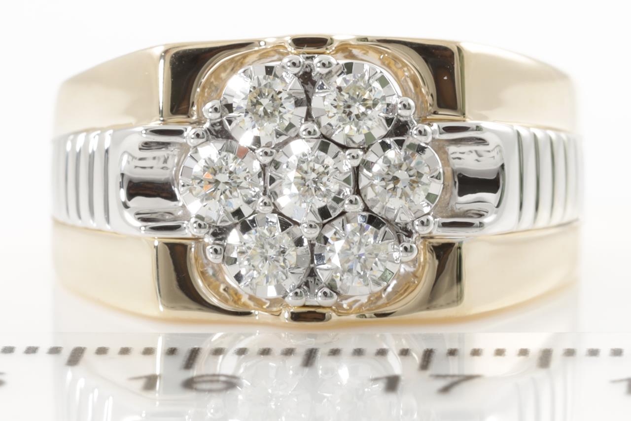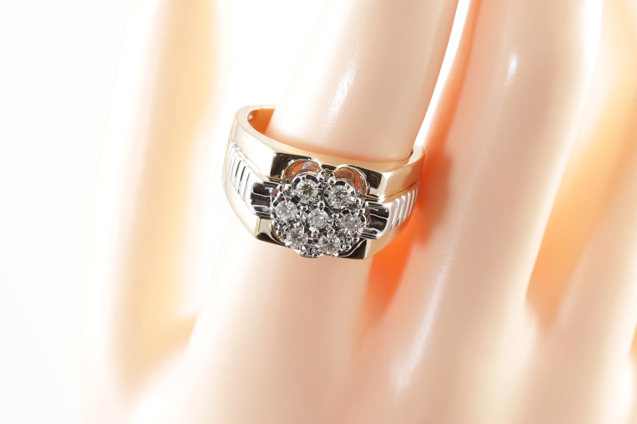 Mens ring with 7 round Diamonds totalling 0.50cts (Estimated grading: H SI). 9ct yellow & white gold. Ring size U. Weight: 8.6g. (New)
