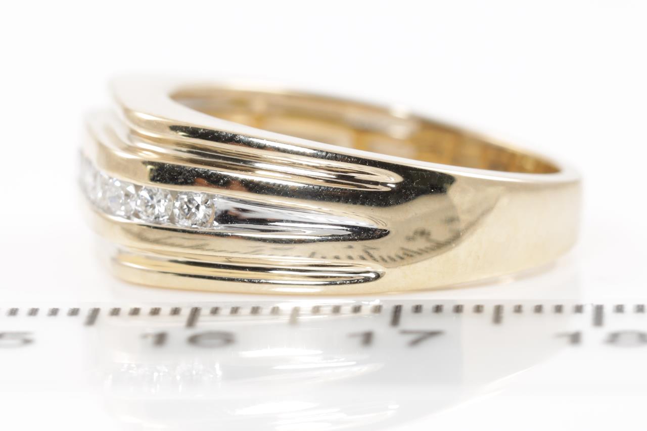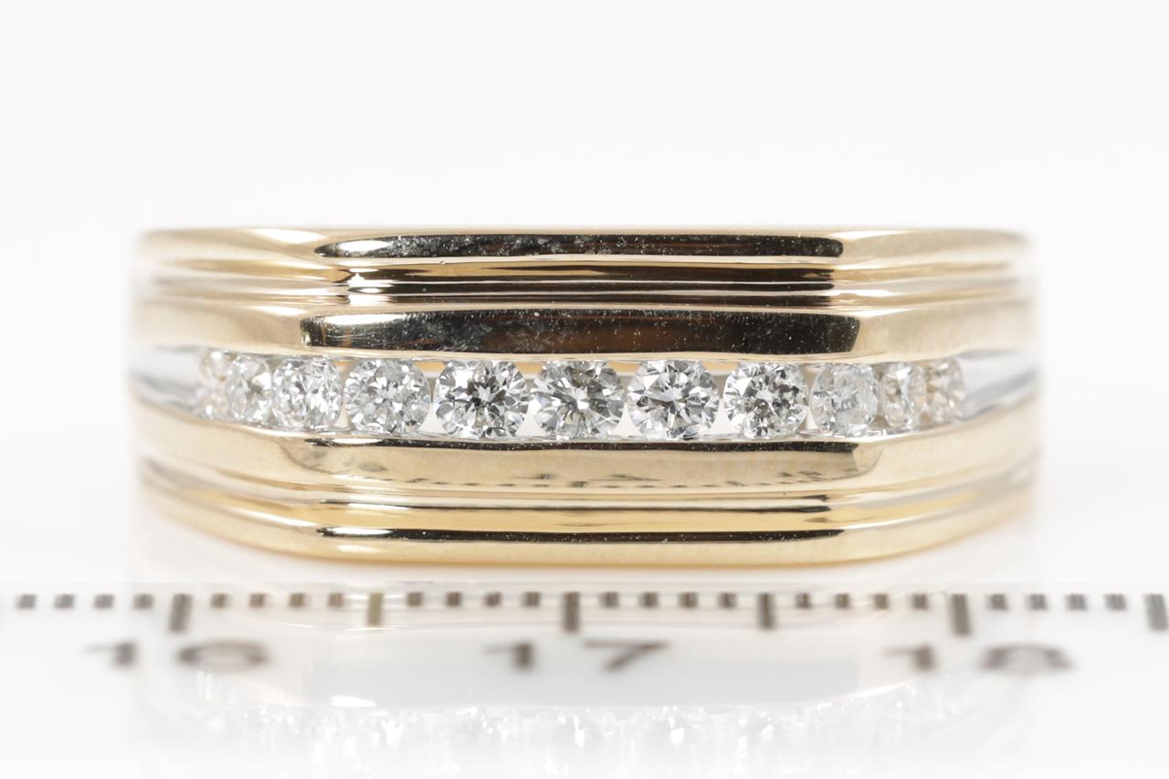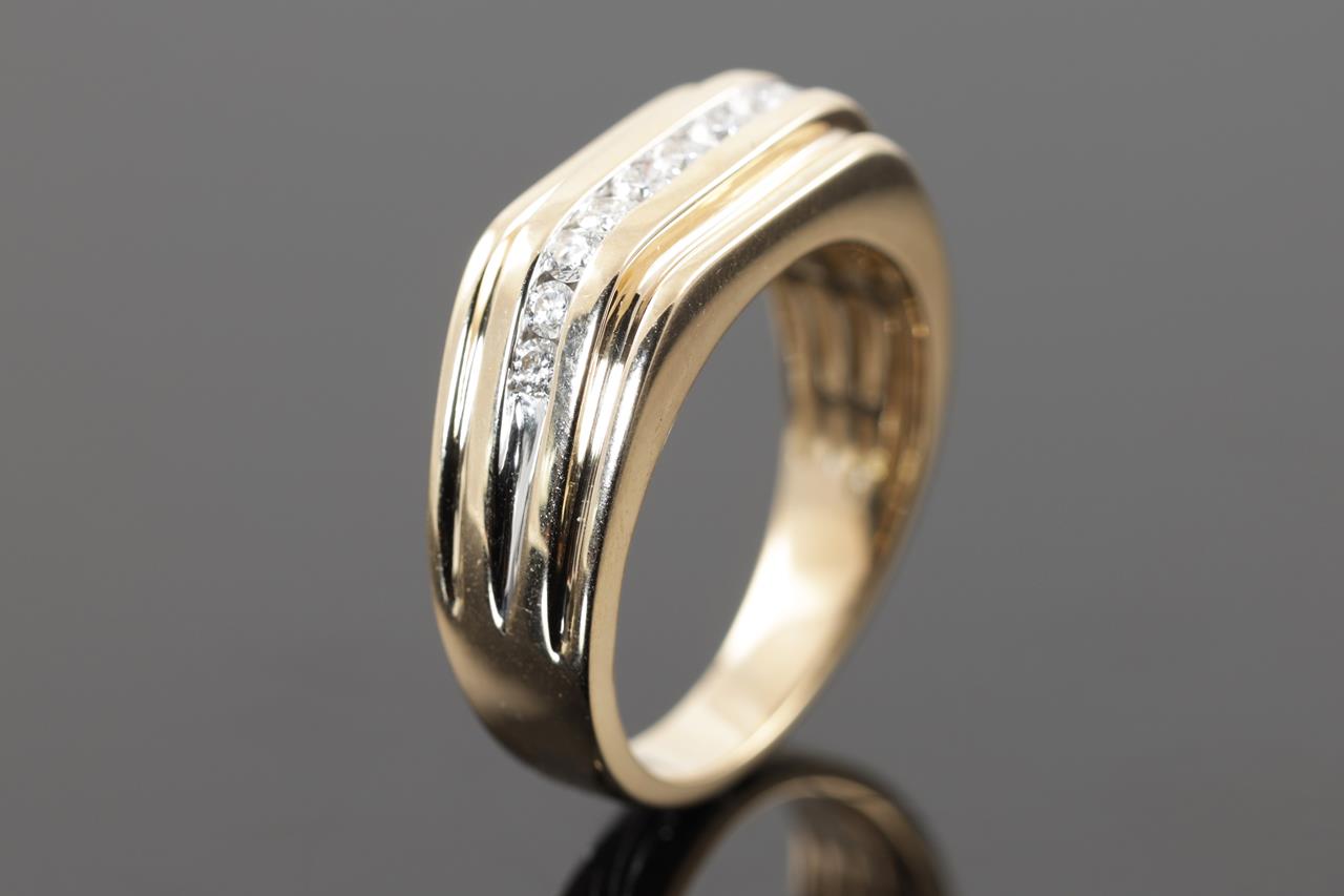 Mens ring with 11 round Diamonds totalling 0.49cts (Estimated grading: H SI). 9ct yellow gold. Ring size U. Weight: 7.6g. (New)