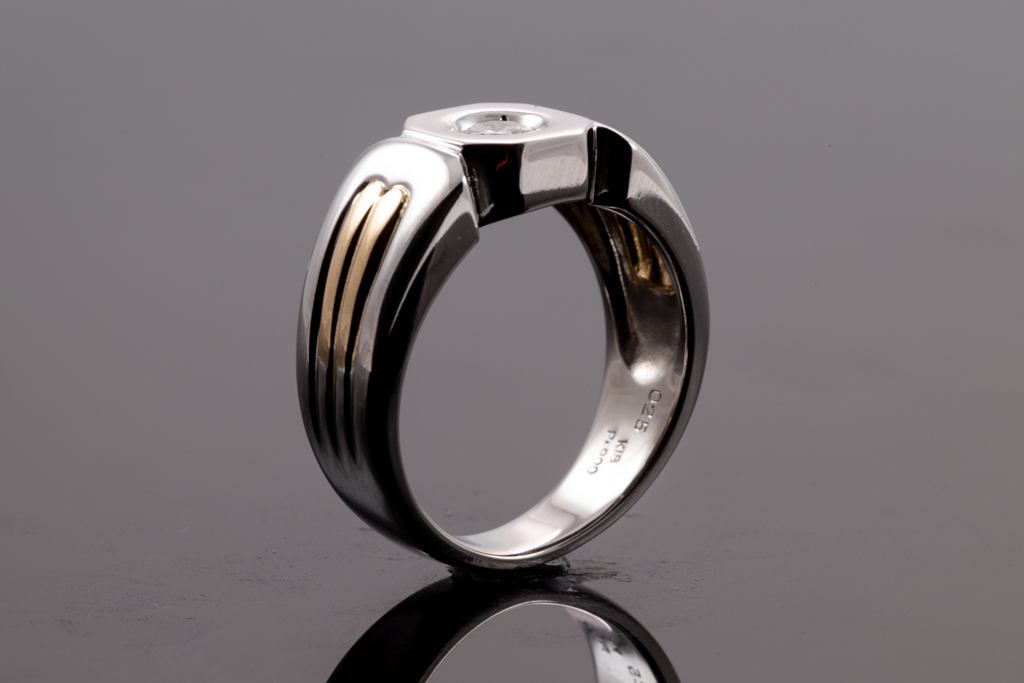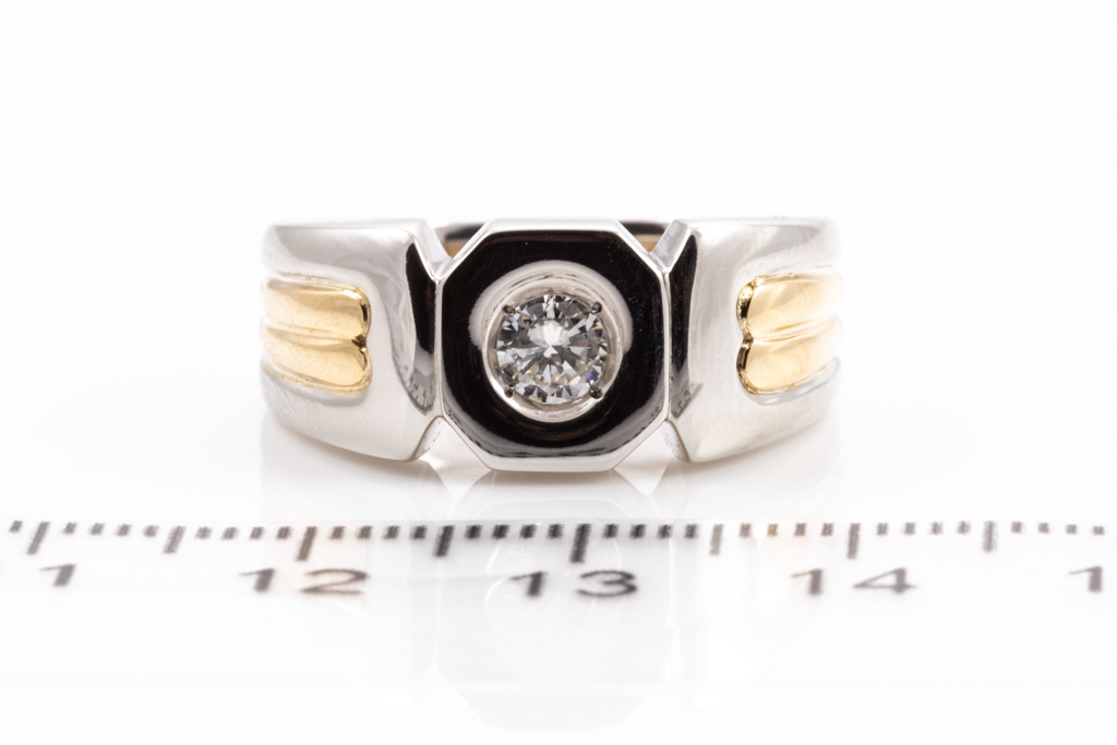Mens ring with a round Diamond of 0.25ct. 18ct yellow gold and platinum. Ring size Q. Weight: 14.8g. (Pre-owned)