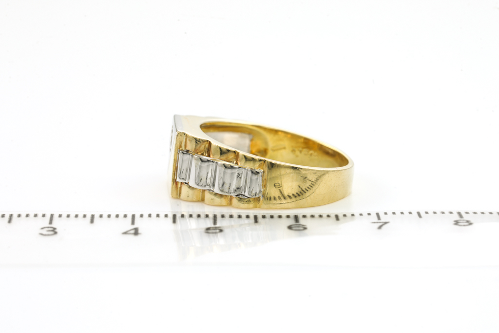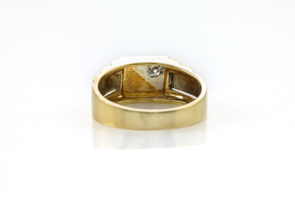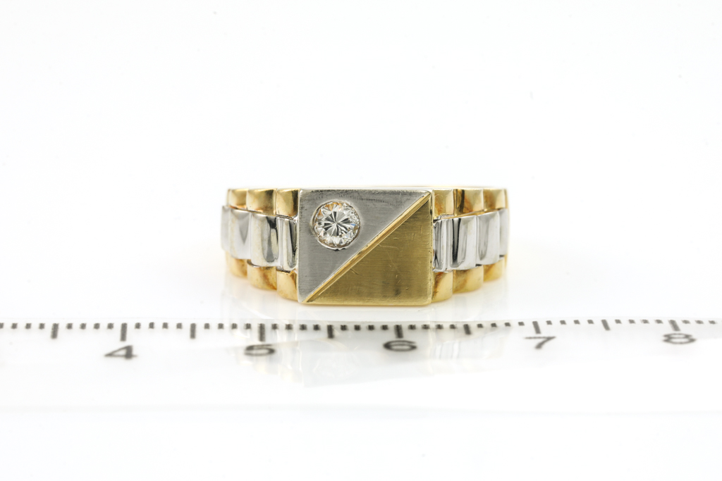 Mens ring with round cut Diamonds of approximately 0.15ct. 18ct white and yellow gold. Ring size S. Weight 7.5g. (Pre-owned)