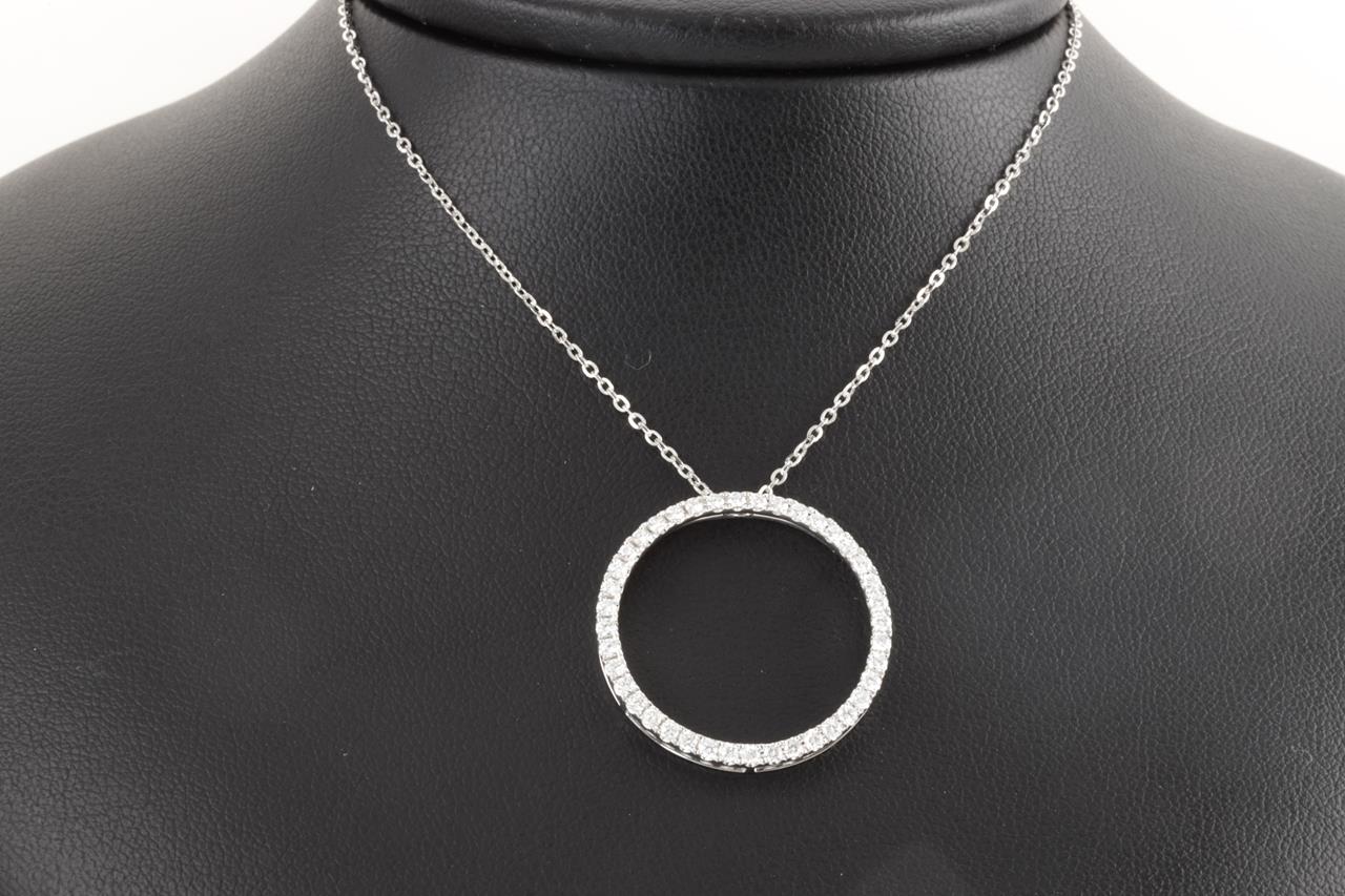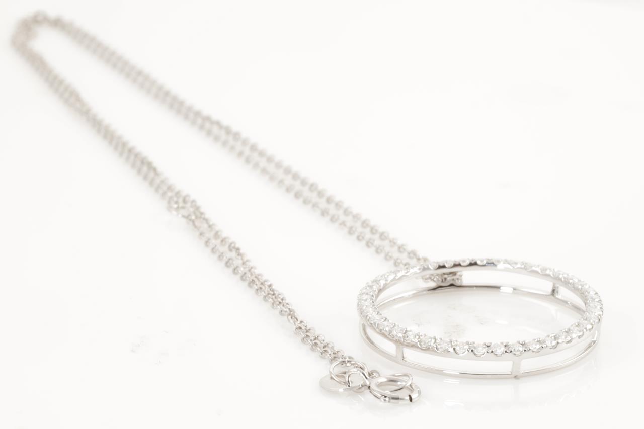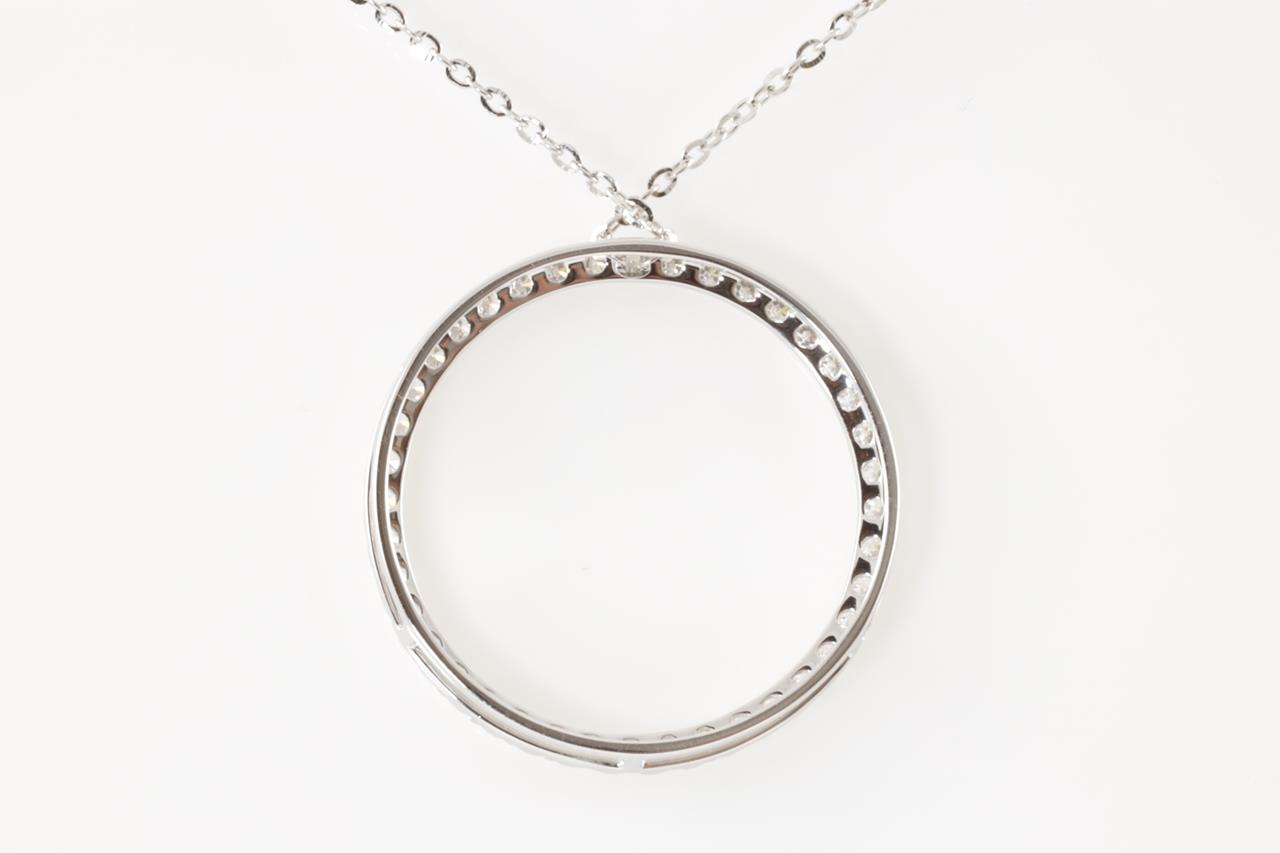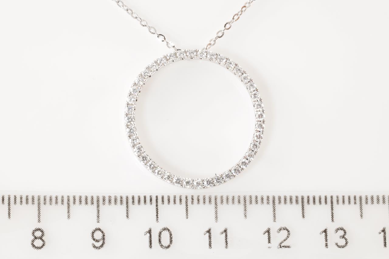 Diamond necklace with circle shaped pendant with round cut Diamonds totalling 0.55cts (Estimated grading: H SI). 18ct white gold. 18ct white gold chain. Length 45cm. Weight 3.2g. (Pre-owned)