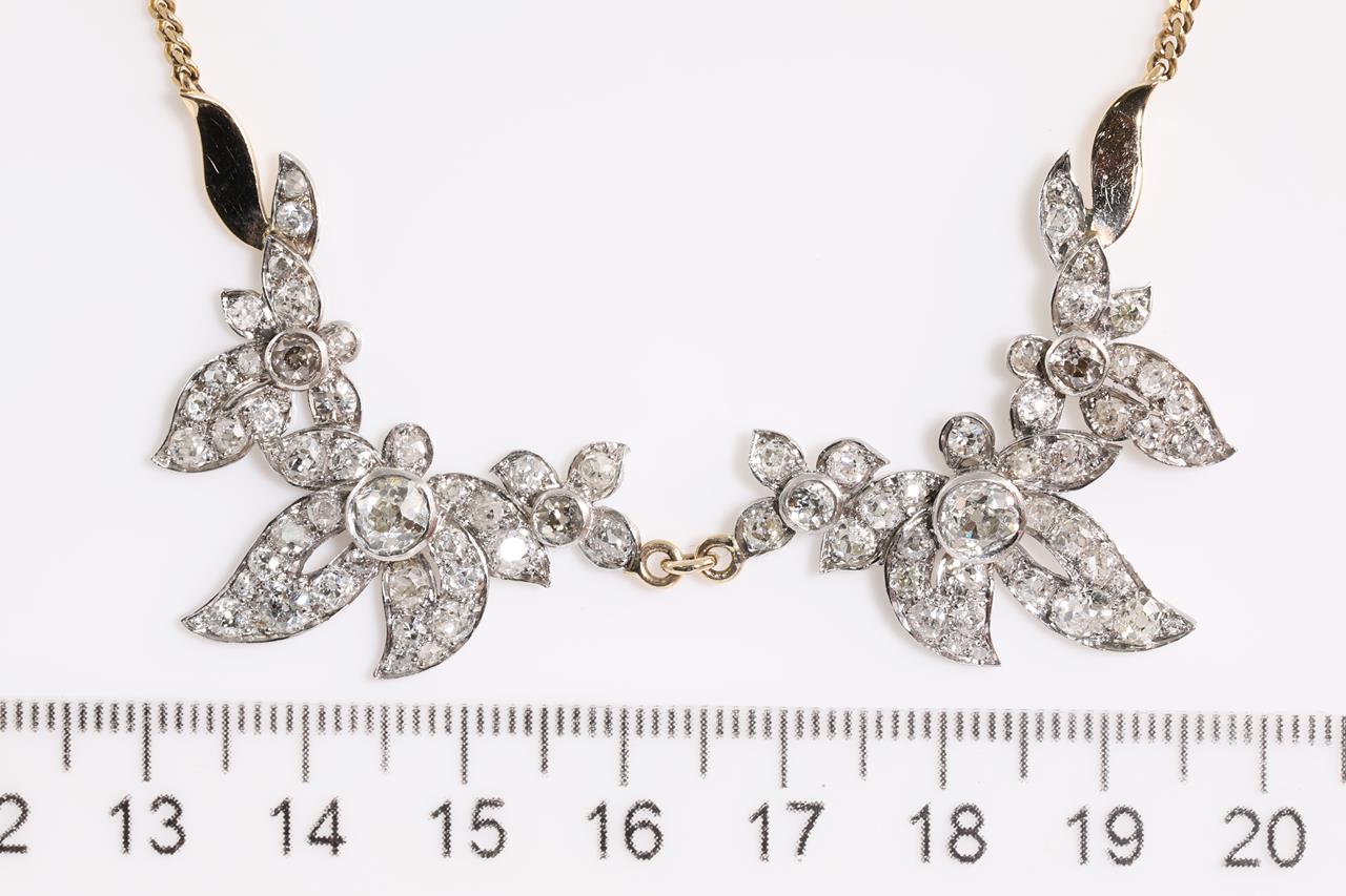 Diamond Necklace with Antique Diamond Pendant articulated section with old round cut Diamonds totalling approximately 4.60cts (Estimate grading G-I SI-P2). Platinum. With 9ct yellow gold chain added later. Length 43cm. Weight 14.4g. (Pre-owned)