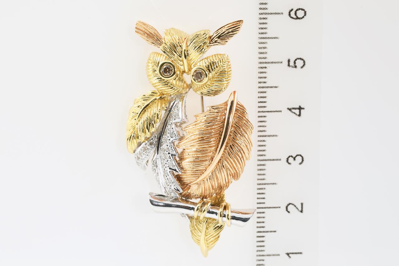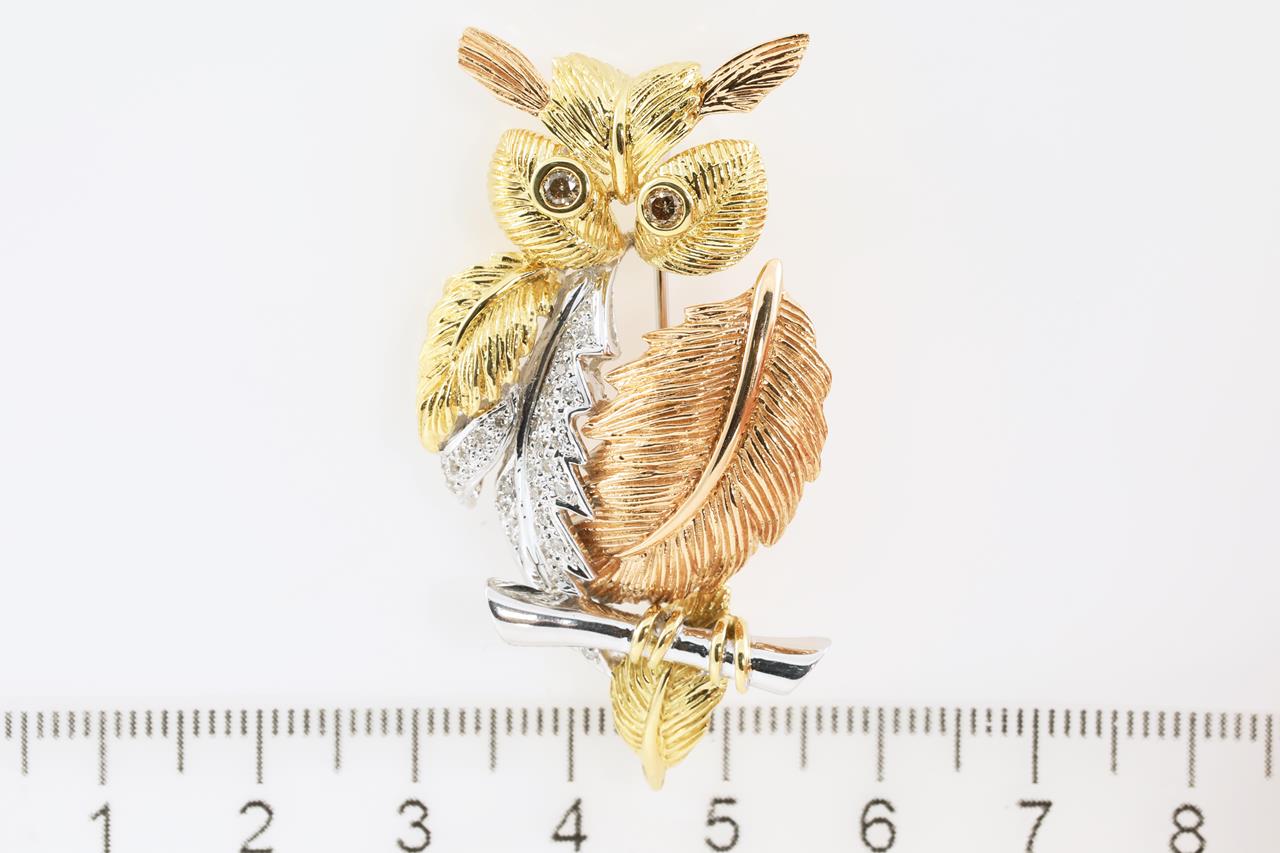 Diamond owl design brooch with round champagne Diamonds eyes totalling 0.10cts and white Diamonds totalling 0.30cts (Estimated grading: H-I SI-P1). 18ct white, yellow and rose gold. Weight: 18.2g (Pre-owned)