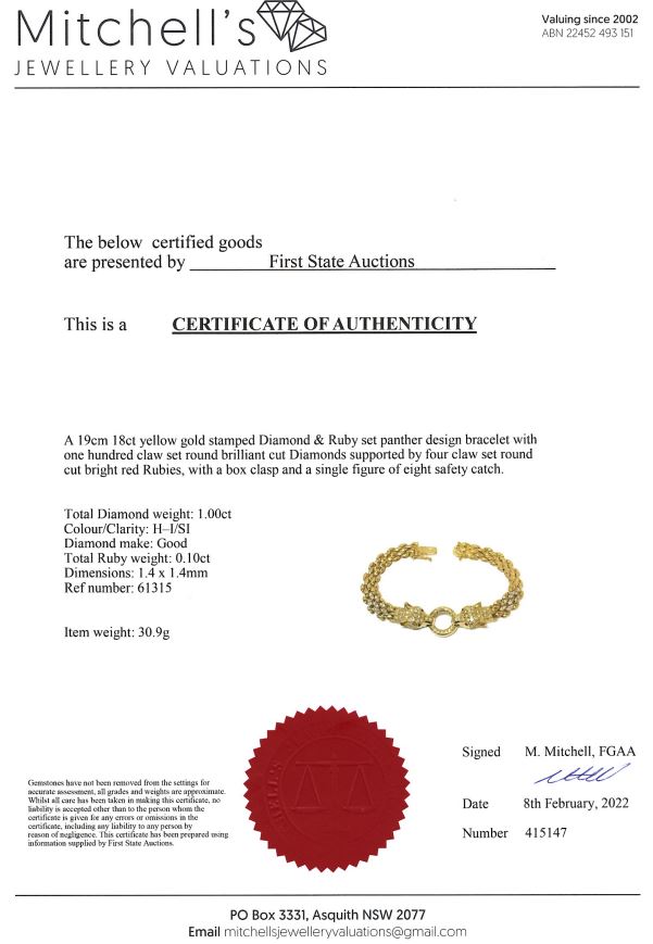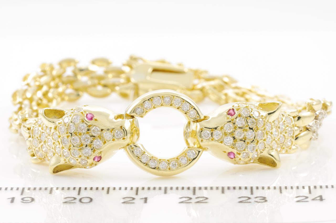 Panther head design bracelet with round Diamonds totalling approximately 1.00cts (Estimated grading:H-I SI) and 4 round Rubies totalling approximately 0.10cts. 18ct yellow gold. Length: 19cm. Weight: 30.9g. With certificate #415147. (Pre-owned)
