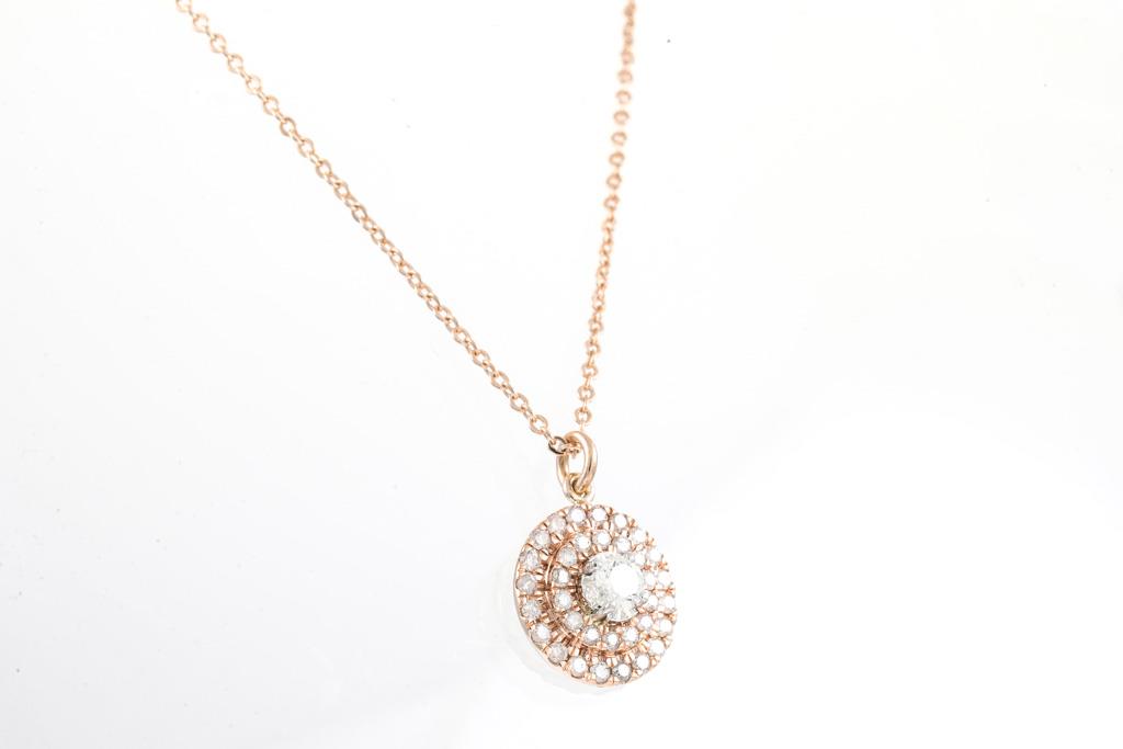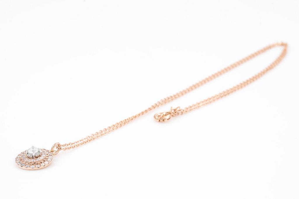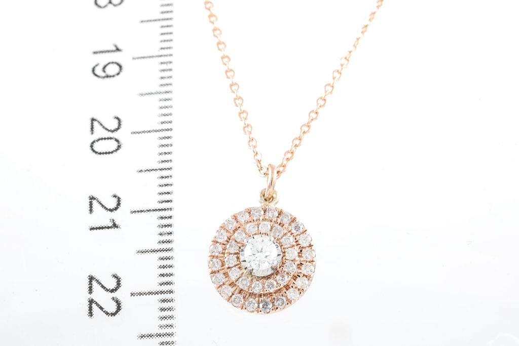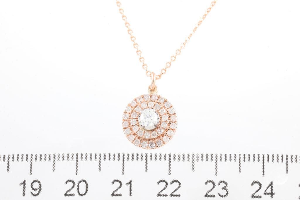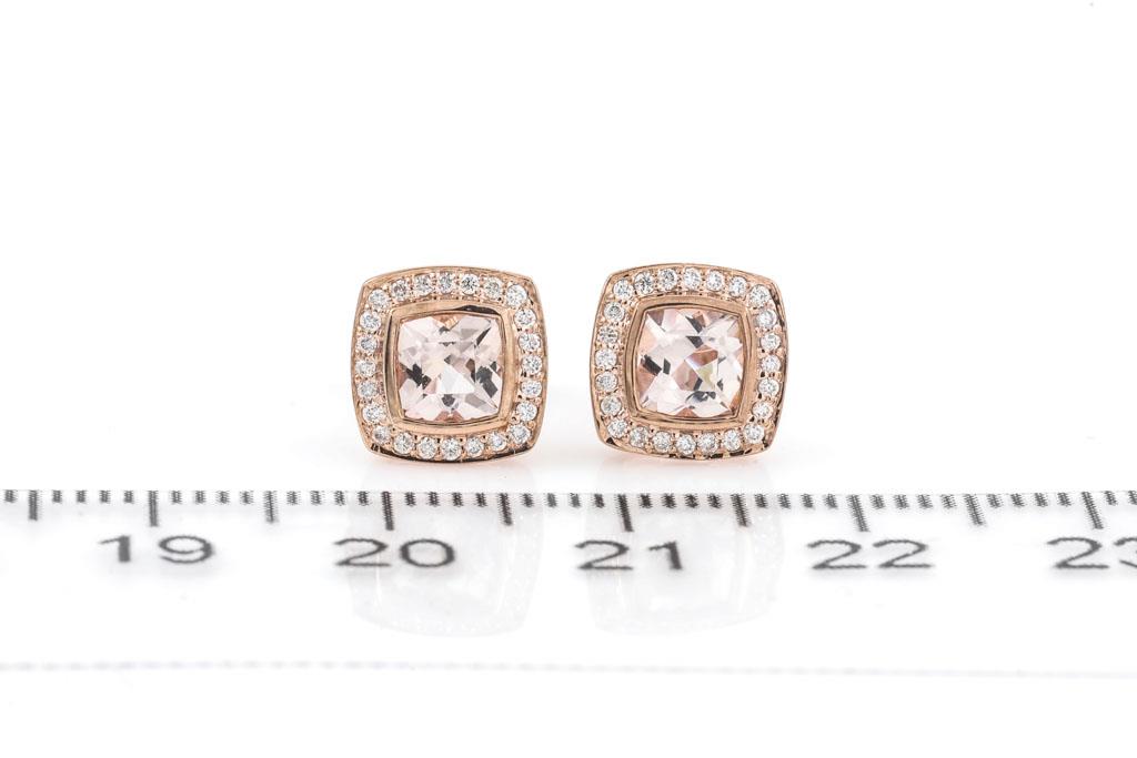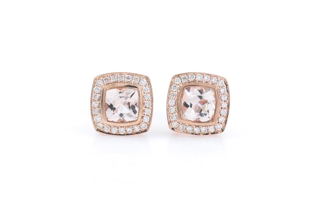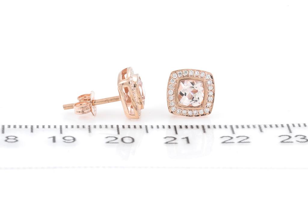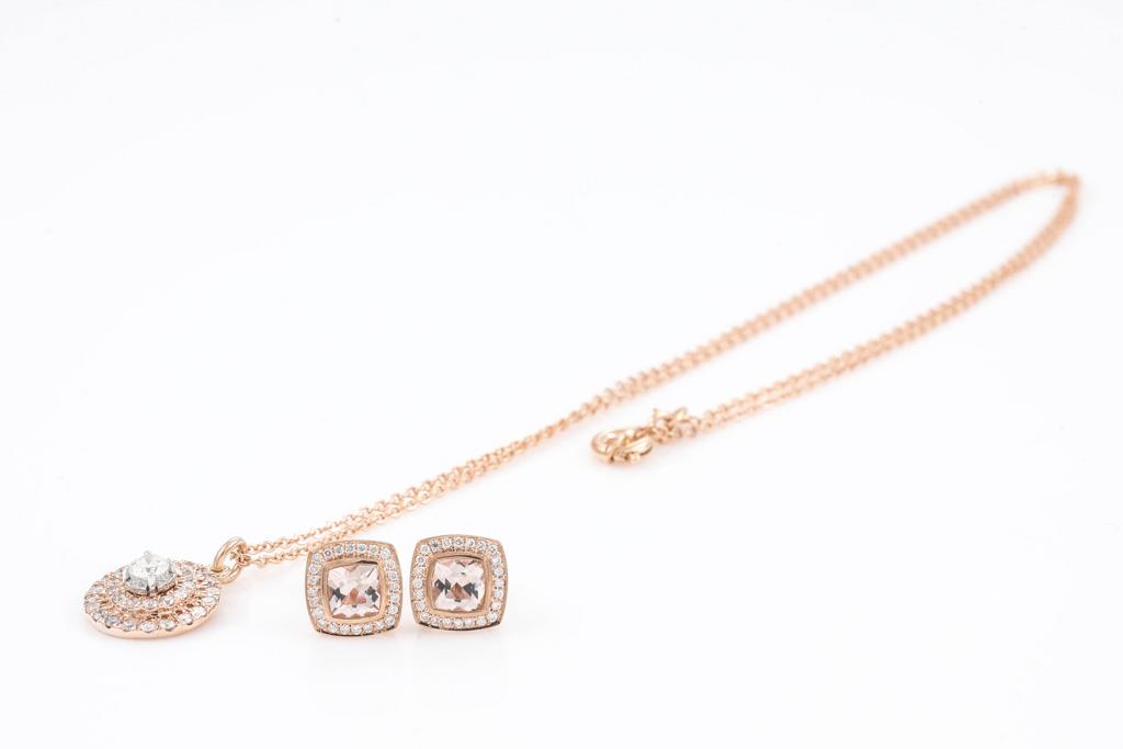 Diamond Pendant with round cut Diamonds totalling approximately 0.55cts (Estimated grading I-J P1-3), 9ct rose gold. Weight 1.3g. On display chain (metal base). With a pair of Morganite and Diamond earrings with cushion cut Morganite totalling approximately 0.80cts and round Diamonds totalling approximately 0.15cts. 9ct rose gold. Weight 1.8g. (As New)