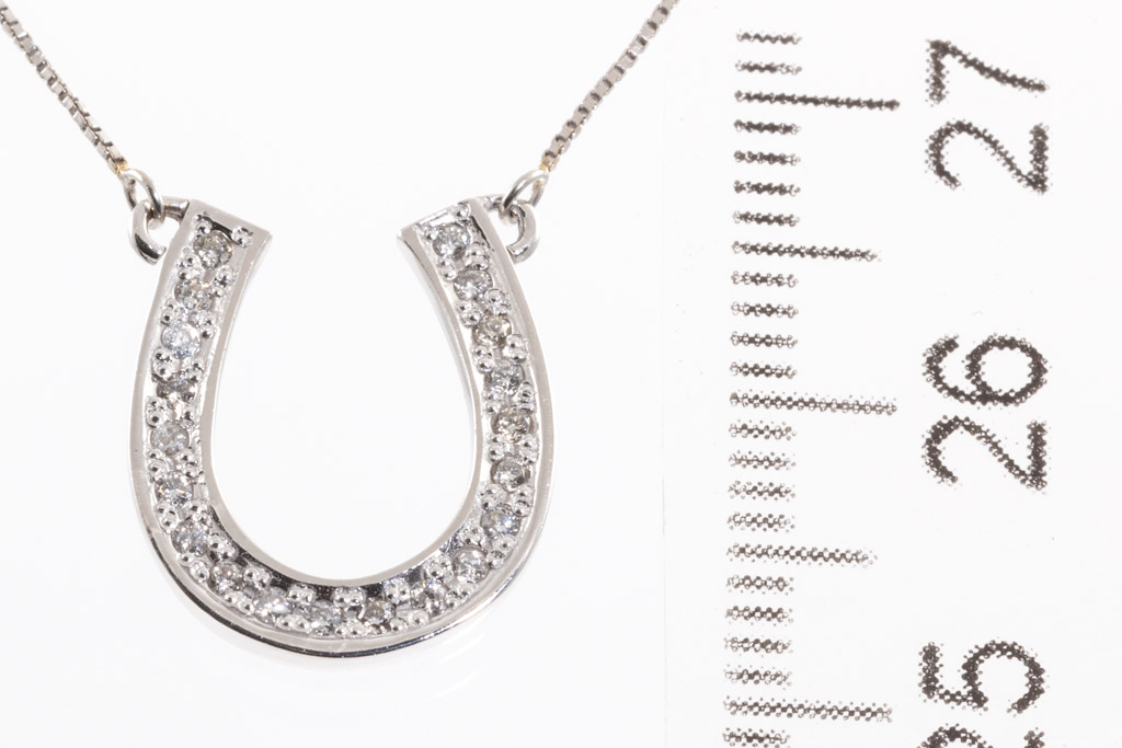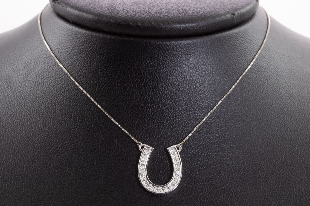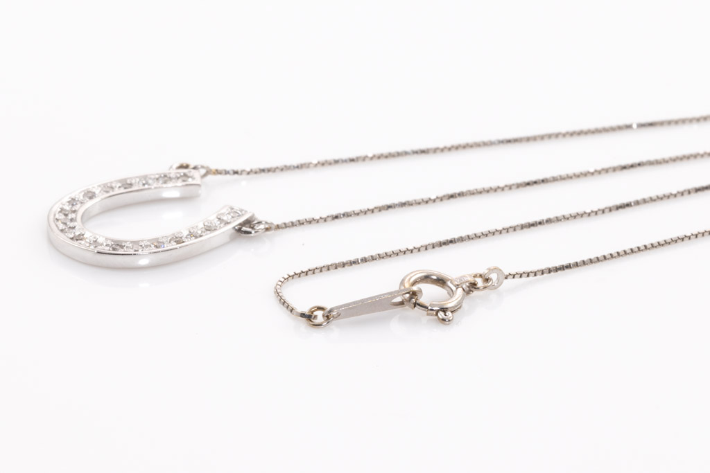 Diamond horseshoe design pendant with round Diamonds totalling 0.13cts. 18ct white gold with 41cm 18ct white gold attached chain. Weight: 2.4g. (Pre-owned)