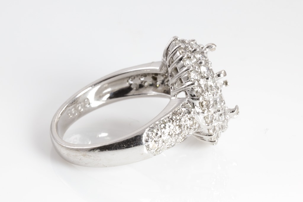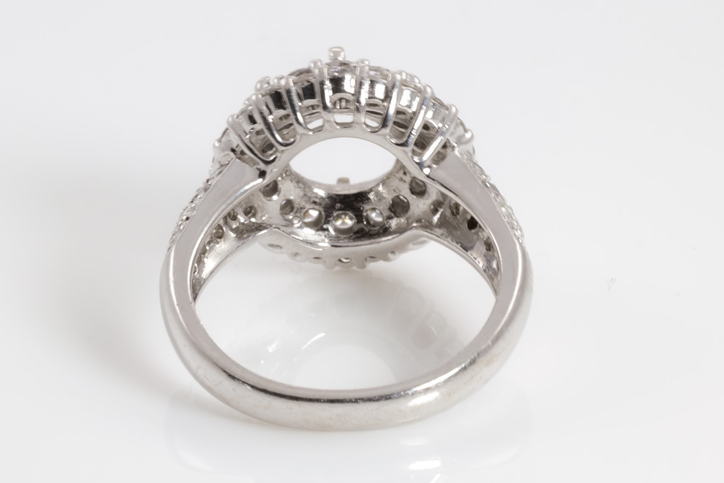 Diamond ring mount to fit round approximately 9.98mm centre with surrounding Diamonds totalling approximately 1.5cts (Estimated grading H-J SI). 18ct white gold. Ring size N. Weight 9.4g. (Pre-owned)