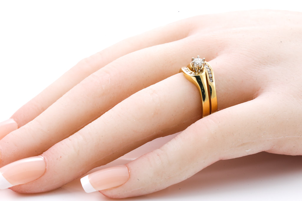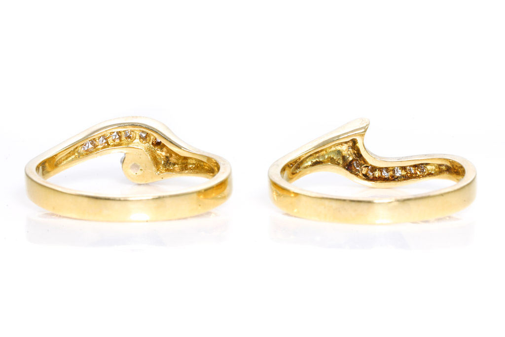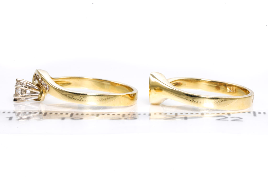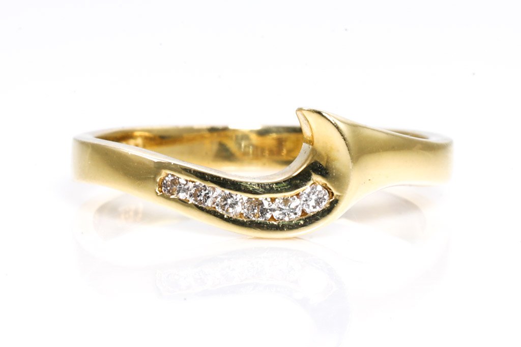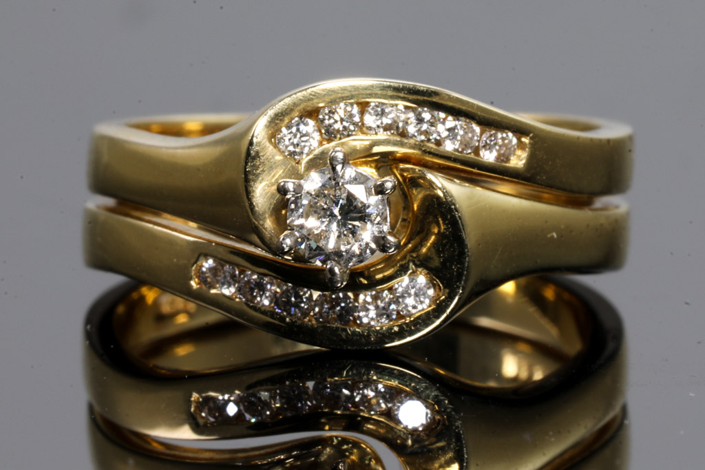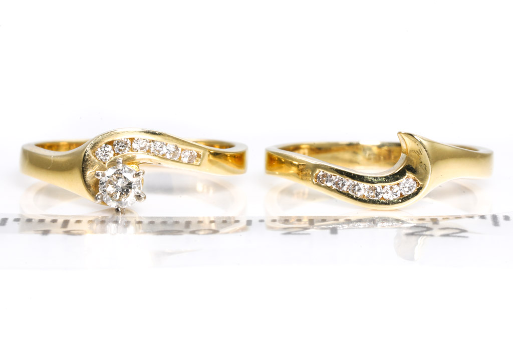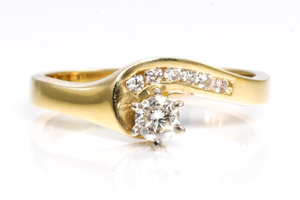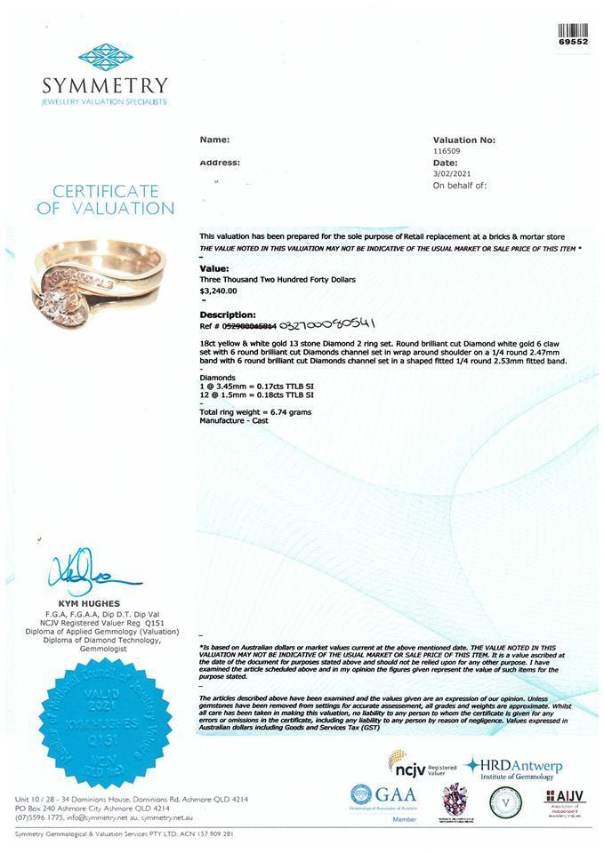 Diamond ring set with centred round Diamond of 0.17ct and rest round Diamonds totalling approximately 0.18cts (with one chipped Diamond). 18ct yellow and white gold. Ring size M1/2. Weight 6.7g. With valuation. (Pre-owned)