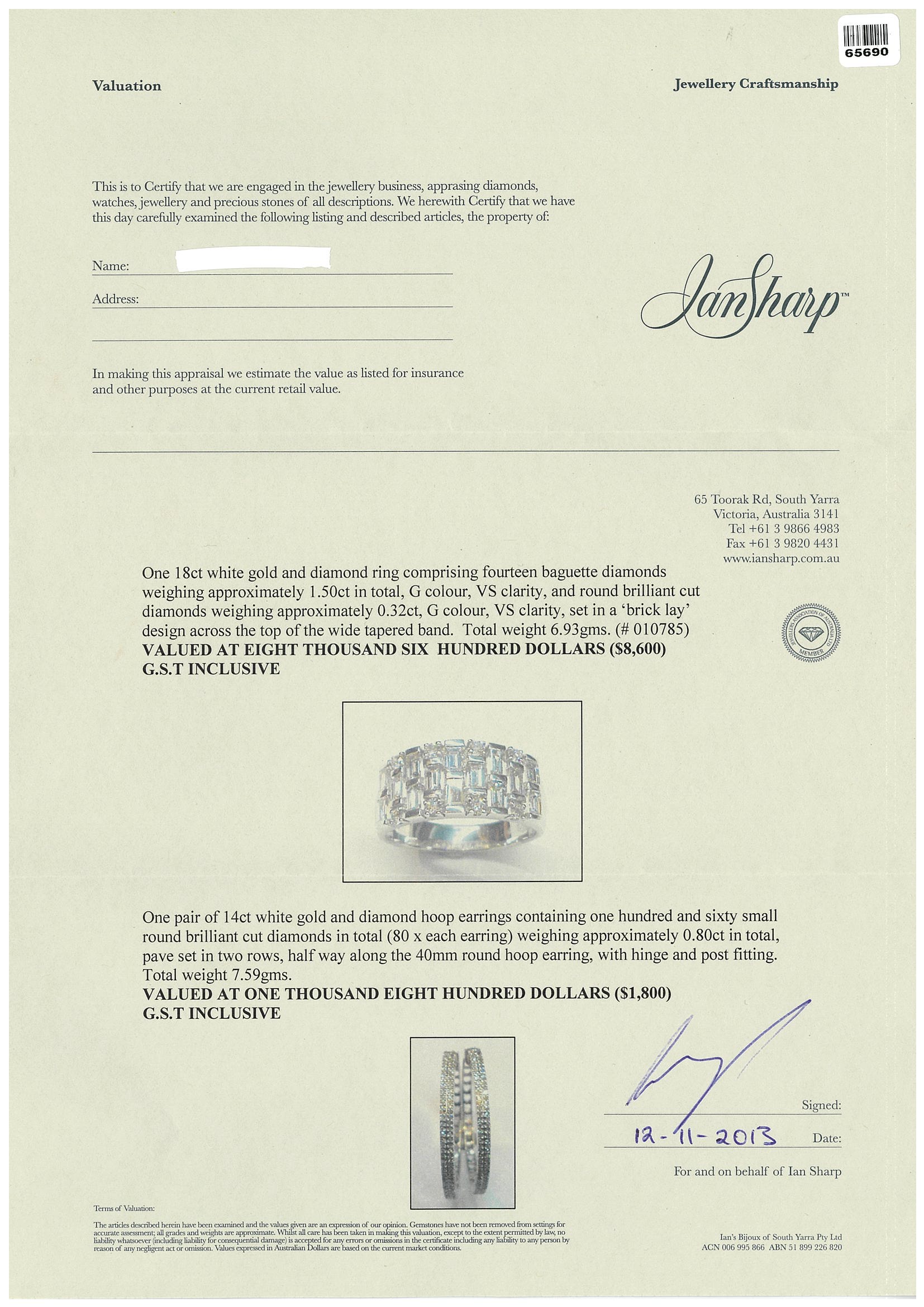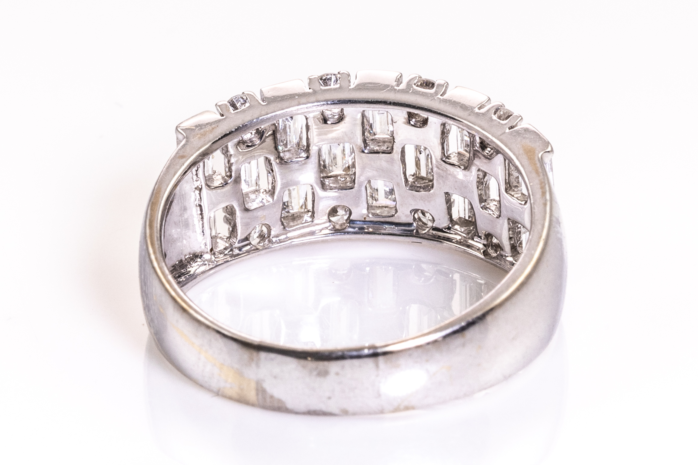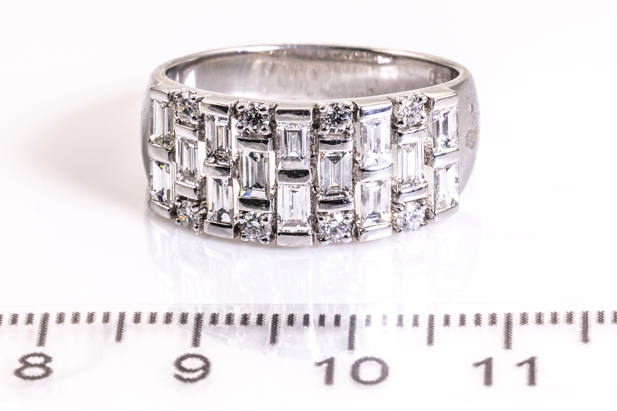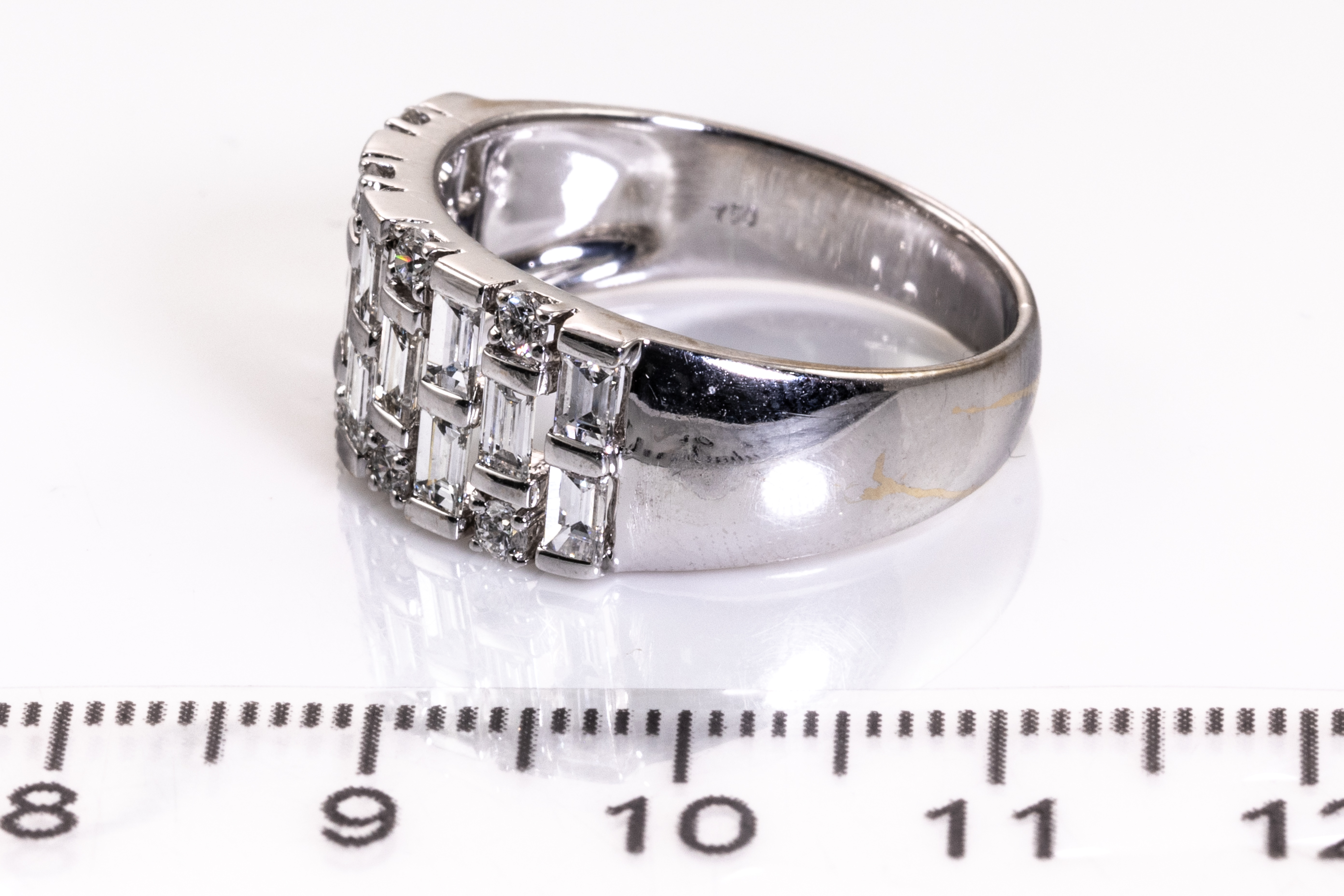1843 Diamond ring with round and baguette cut Diamonds totalling approximately 1.82cts (Estimated grading G VS). 18ct white gold. Ring size S 1/2. Weight 6.9g. With Ian Sharp Valuation. (Pre-owned)