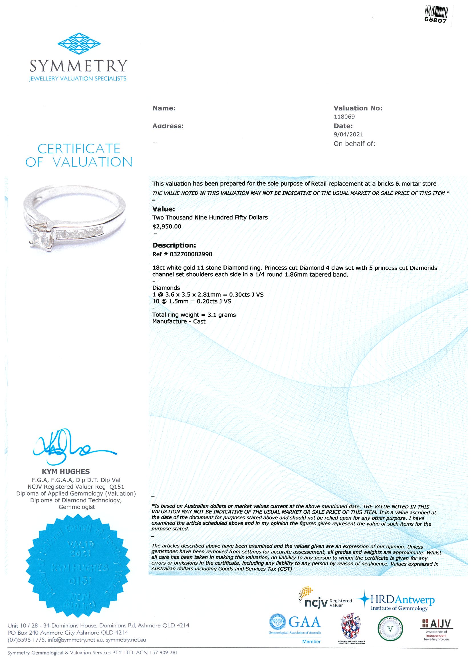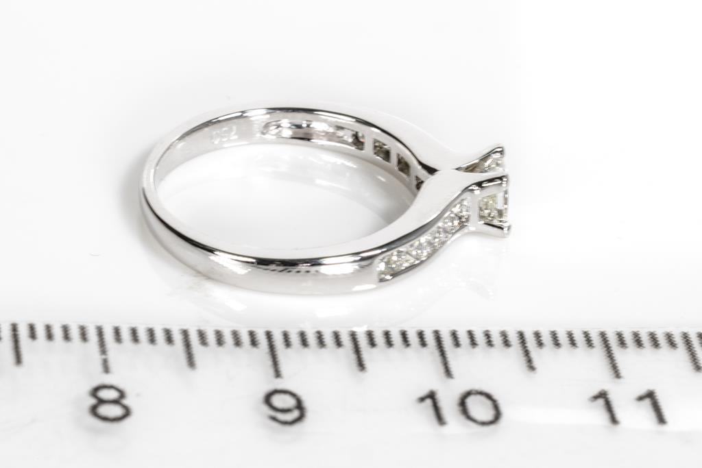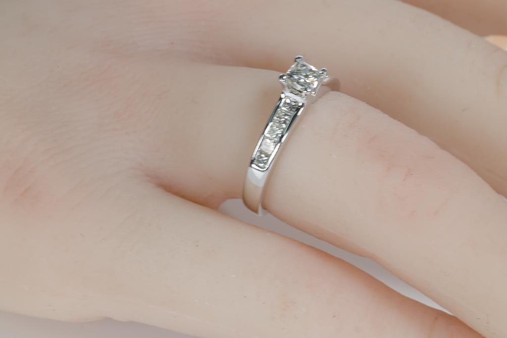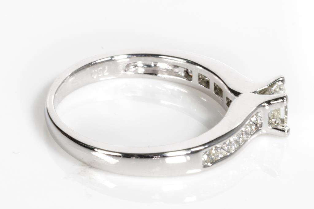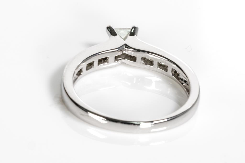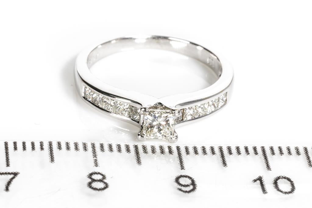 Diamond Ring with centre princess cut Diamond of approximately 0.30cts (Estimated grading J VS) and shoulder princess cut Diamonds totalling approximately 0.20cts (Estimated grading J VS). 18ct white gold. Ring size K. Weight 3.1g. With valuation. (Pre-owned)