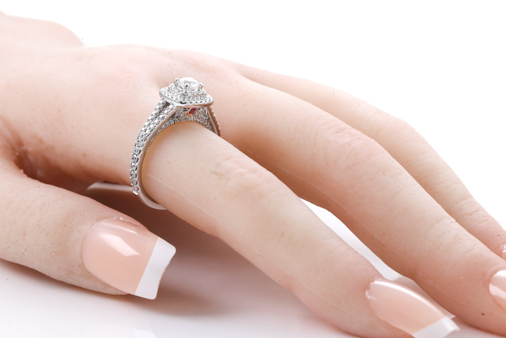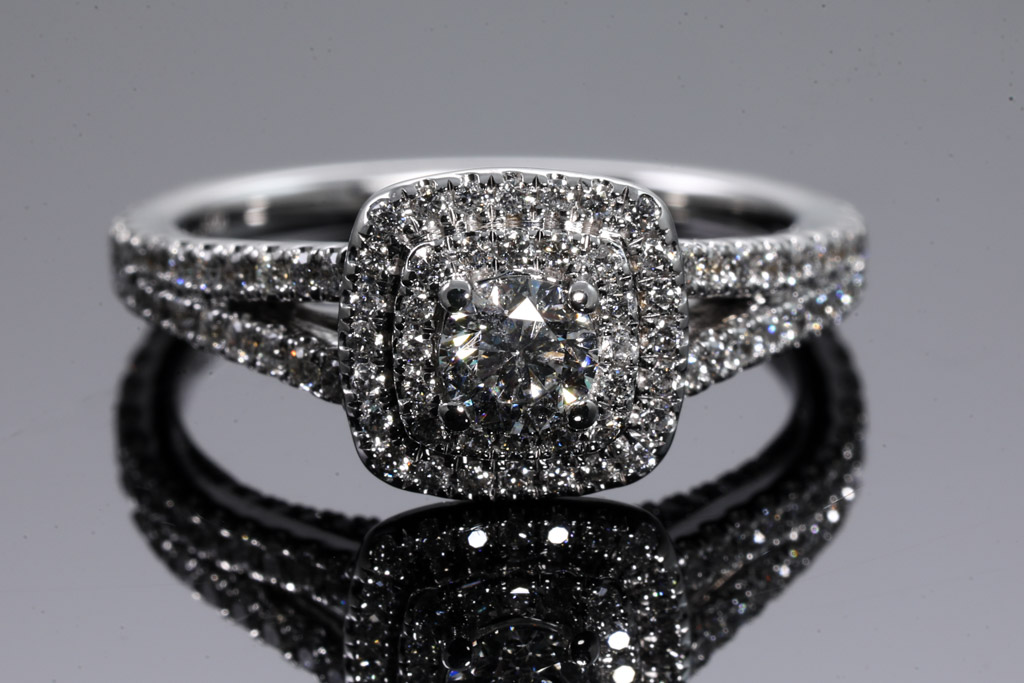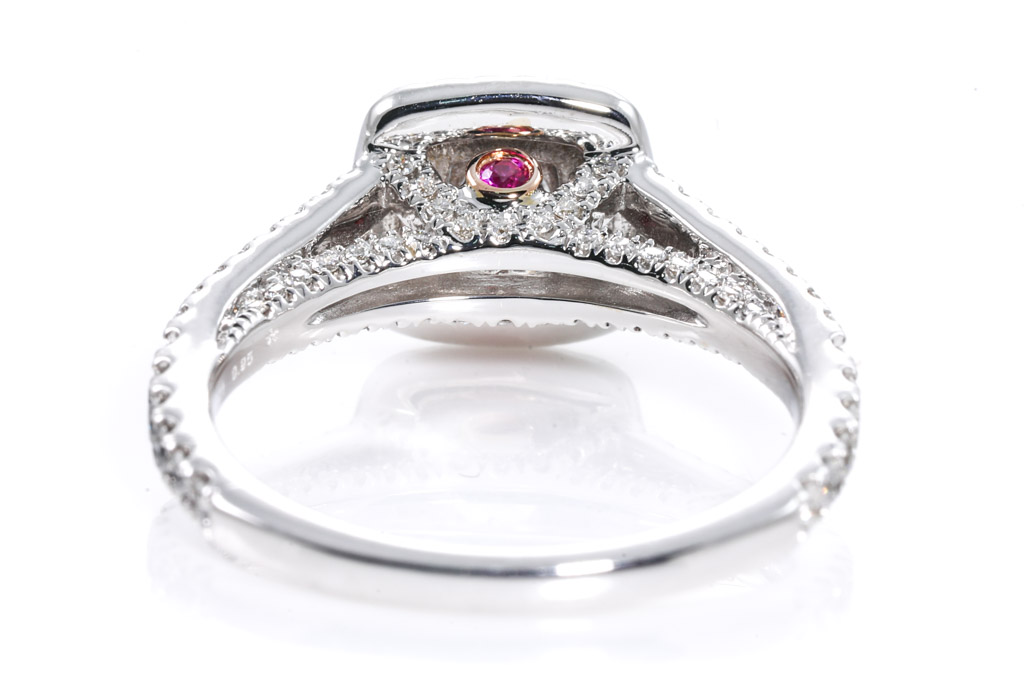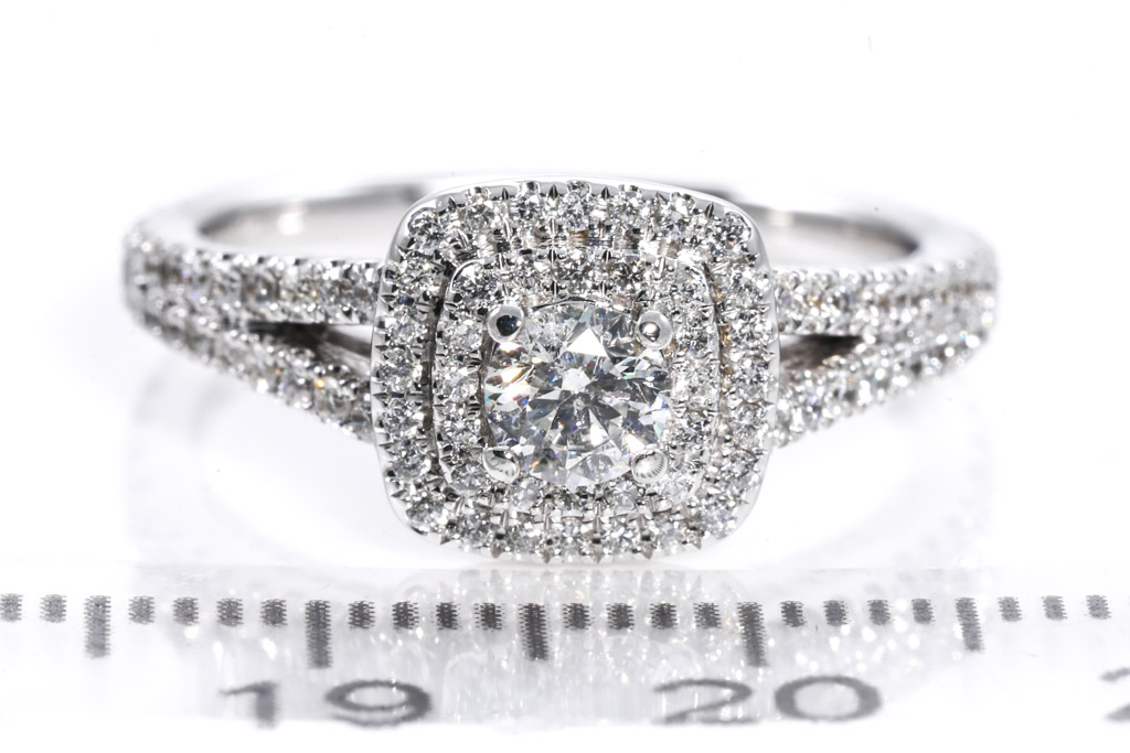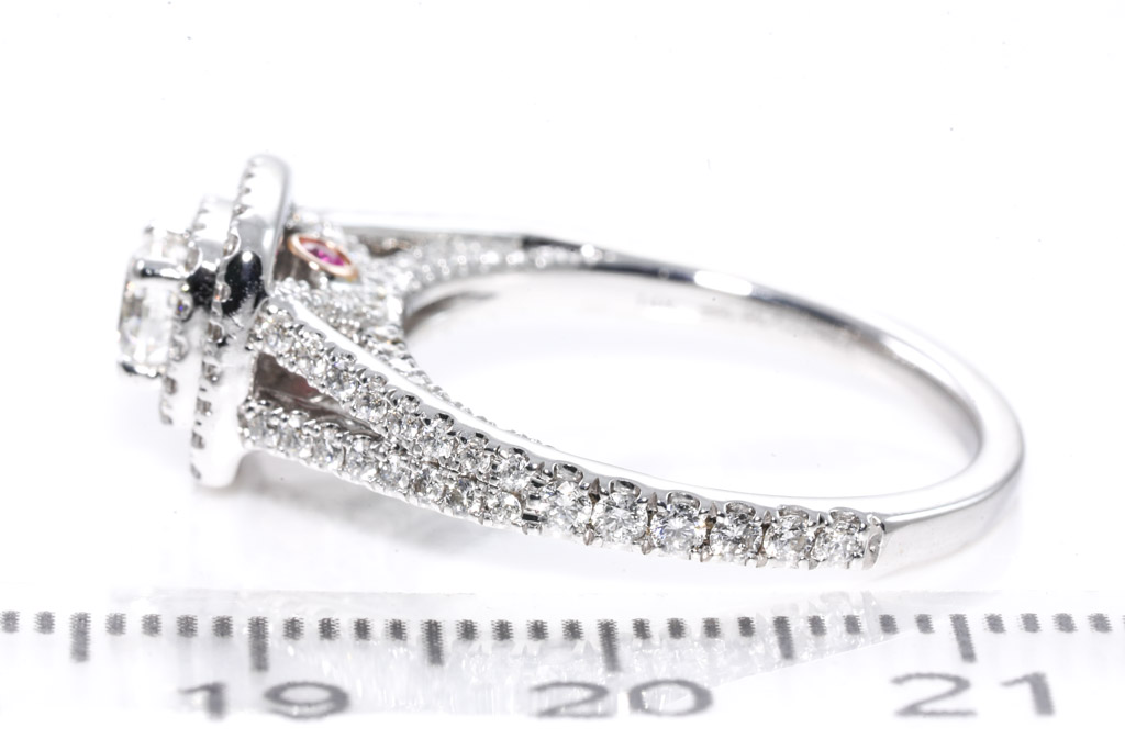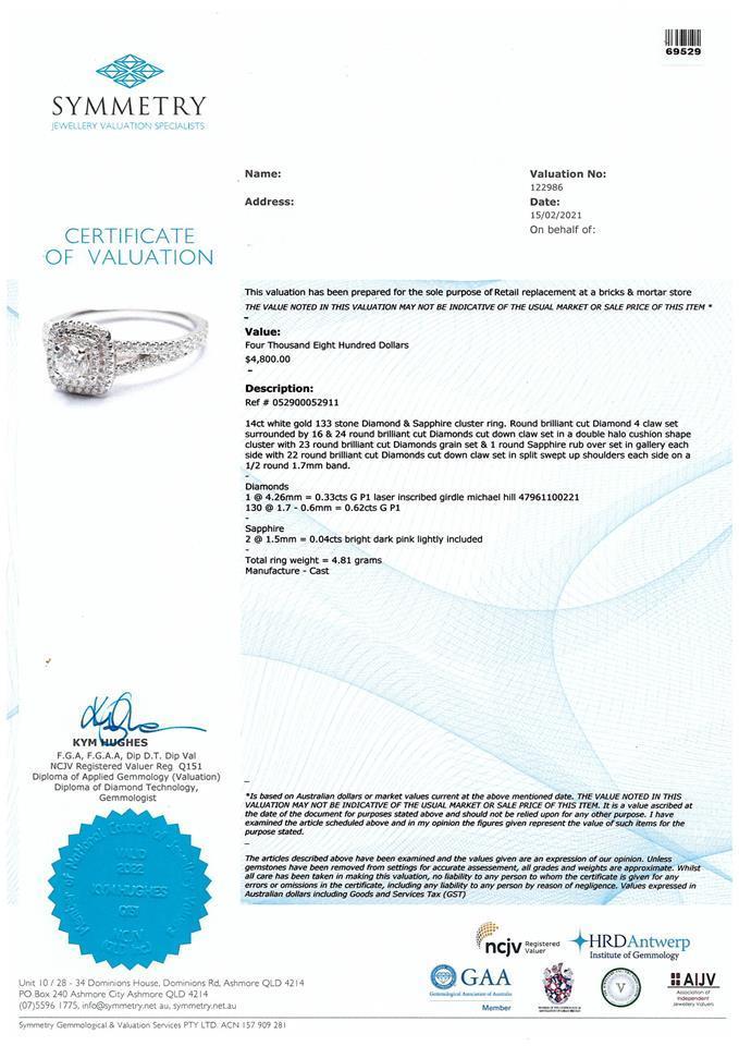 Diamond double halo ring with centred round cut Diamond of 0.33ct (Estimated grading G P1) and rest round Diamonds totalling approximately 0.62cts (Estimated grading G P1) and 2 pink round Sapphires totalling approximately 0.04cts. 14ct white gold. Ring size M 1/2 - resizing not recommended. Ring signed by Michael Hill. Weight 4.8g. With Valuation. (Pre-owned)