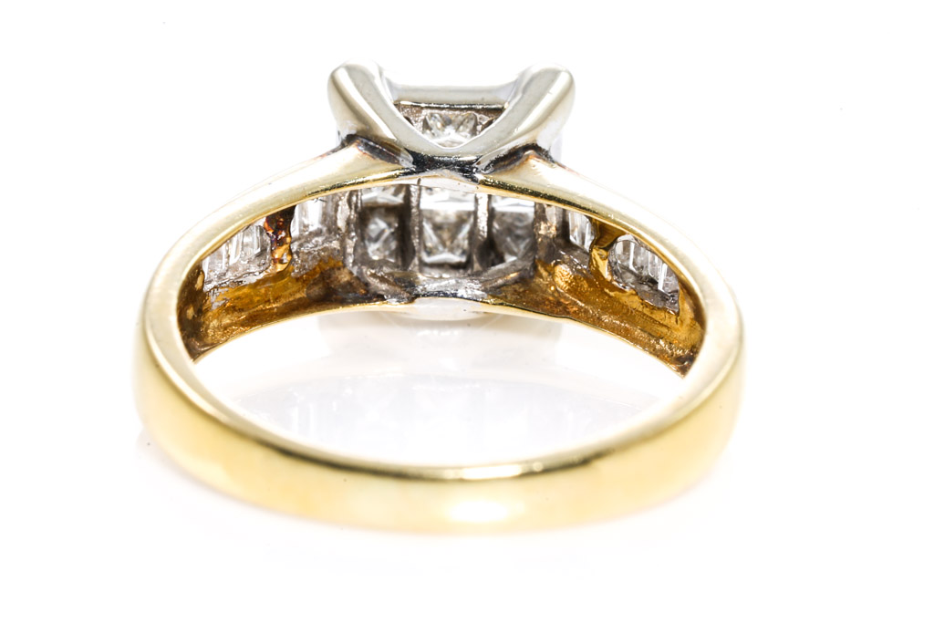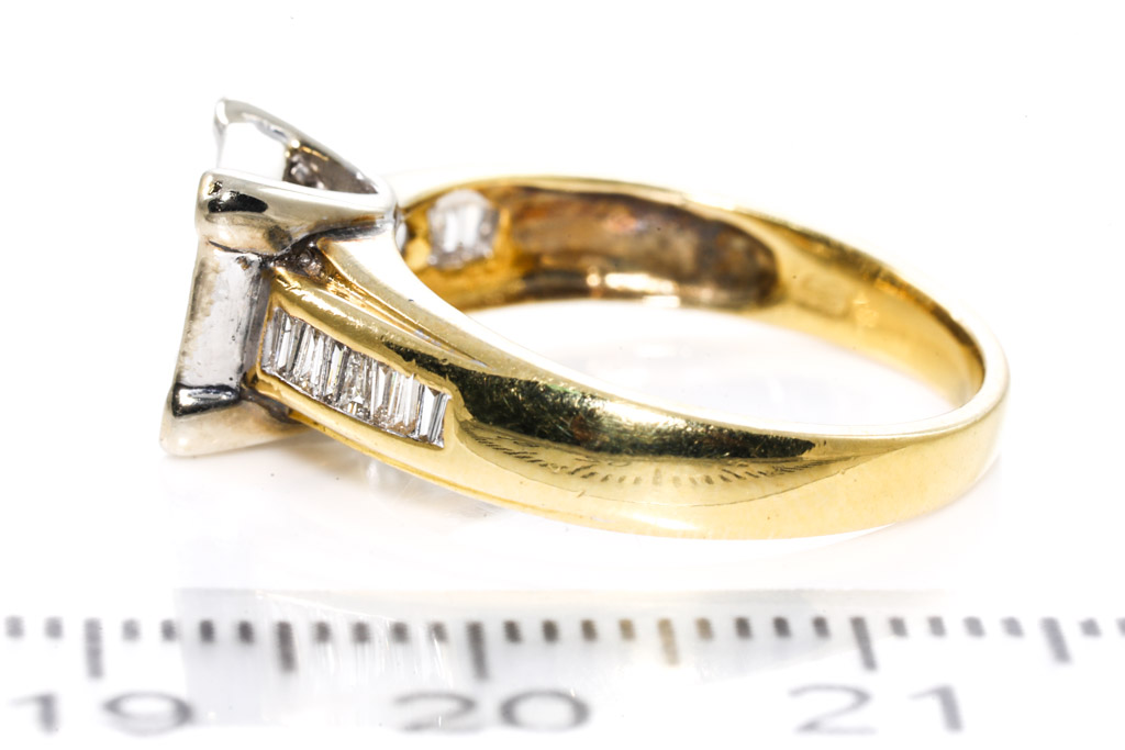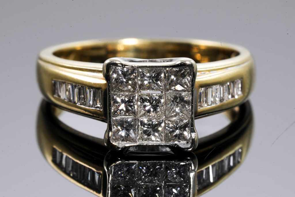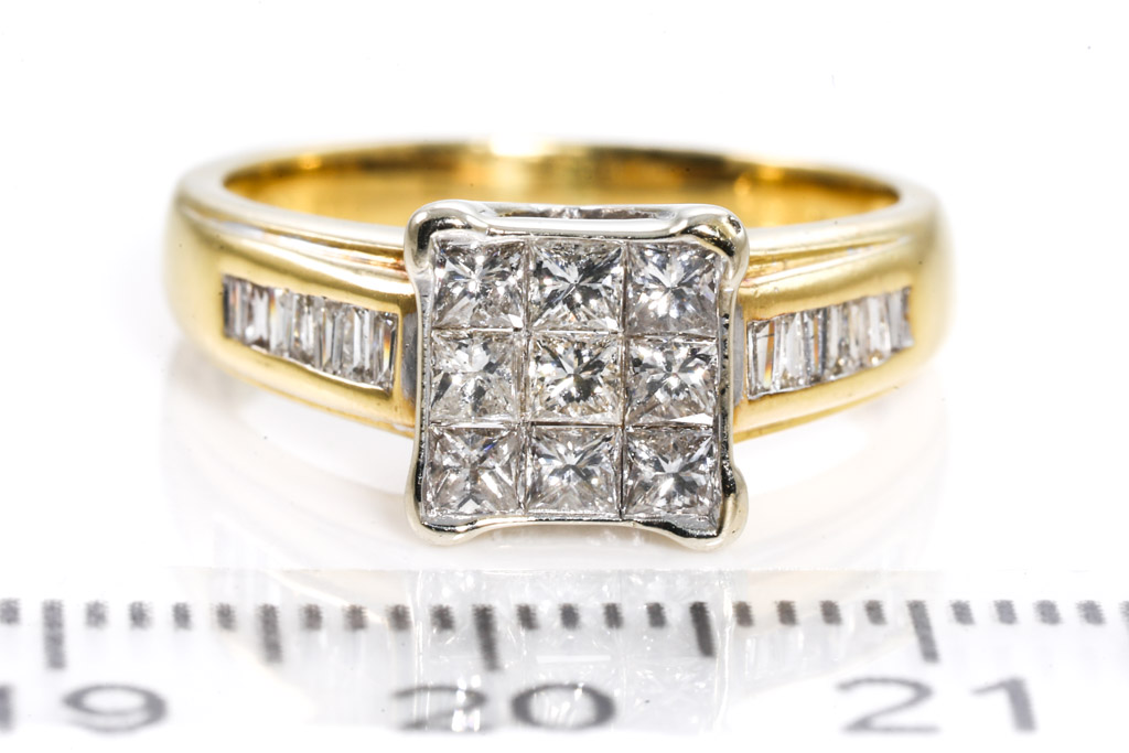 Diamond ring with centre nine invisible set princess cut Diamonds totalling approximately 0.63cts (Estimated grading I-J SI) and baguette Diamonds totalling approximately 0.20cts. 18ct yellow and white gold. Ring size K - Reszing up to 2 sizes. Weight 3.8g. (Pre-owned)
