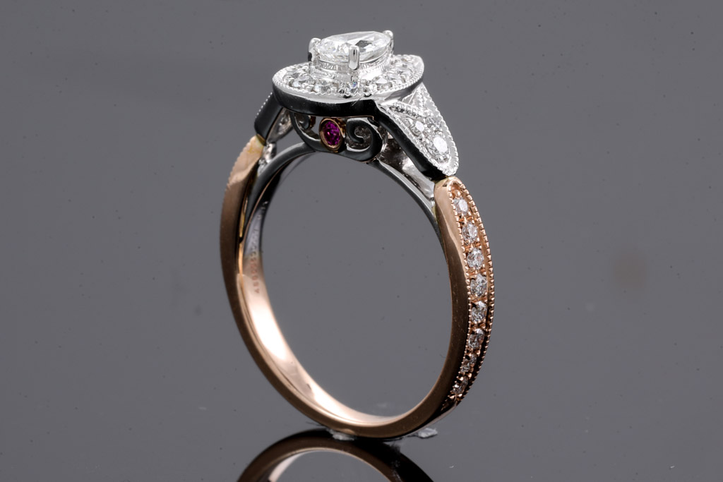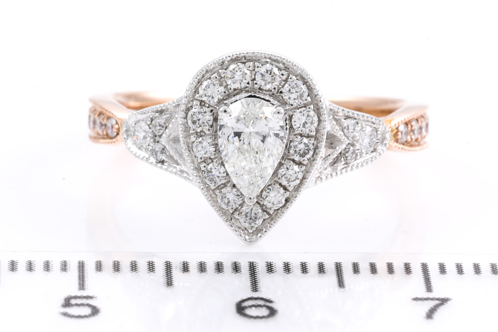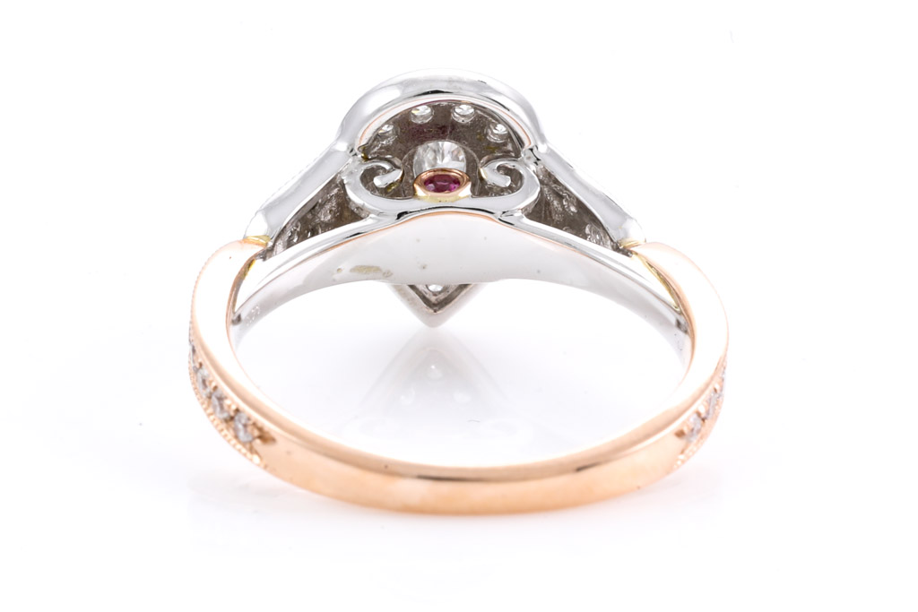 Diamond dress ring with centered pear cut Diamond of approximately 0.31ct (Estimated grading: G P2 inscribed Michael Hill #4885350017) and round Diamonds totalling approximately 0.40cts (Estimated grading G SI) and 2 synthetic rubies. 14ct white and rose gold. Ring size N. With Combined Jewellery Services Valuation. Weight 4.3g. (Pre-owned)