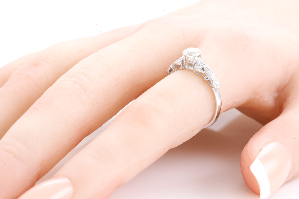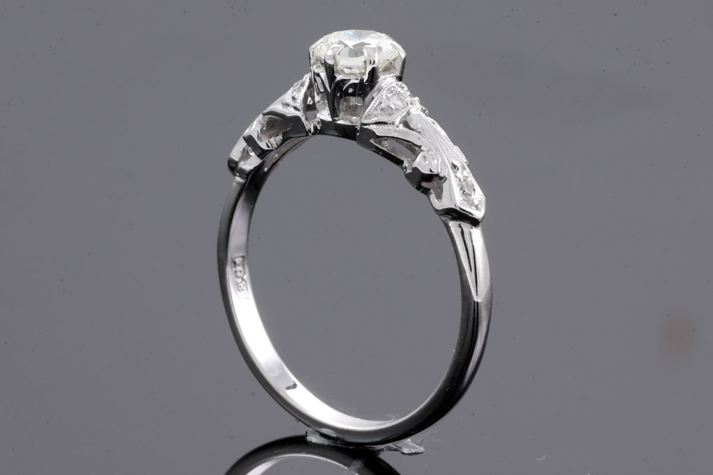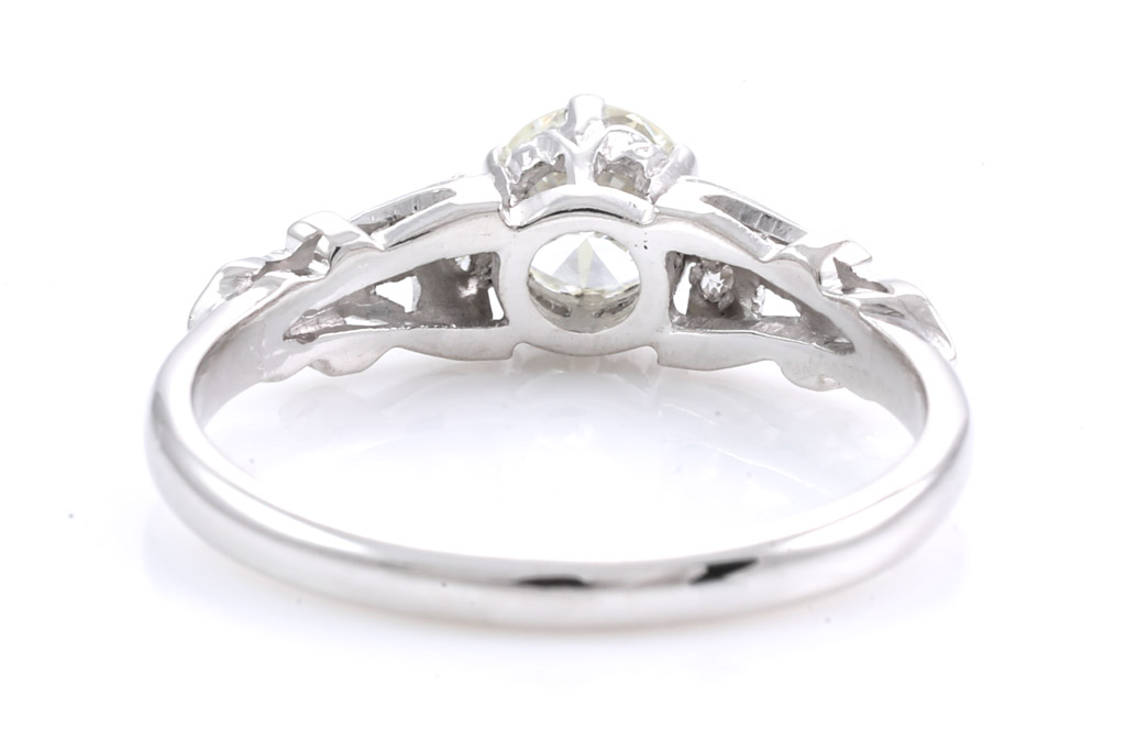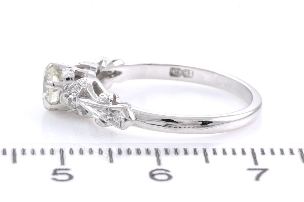 Diamond ring with centred round cut Diamond of approximately 0.48ct (Estimated grading K VS) and Diamonds totalling approximately 0.06cts. 18ct white gold. Ring size M. Weight 2.5g. (Pre-owned)