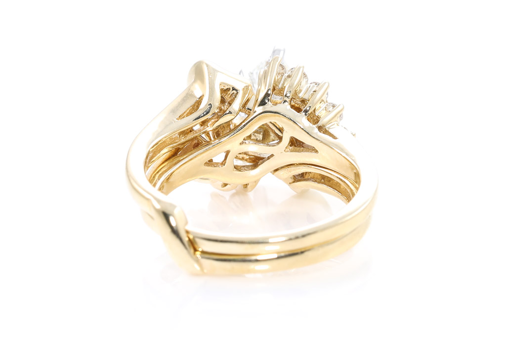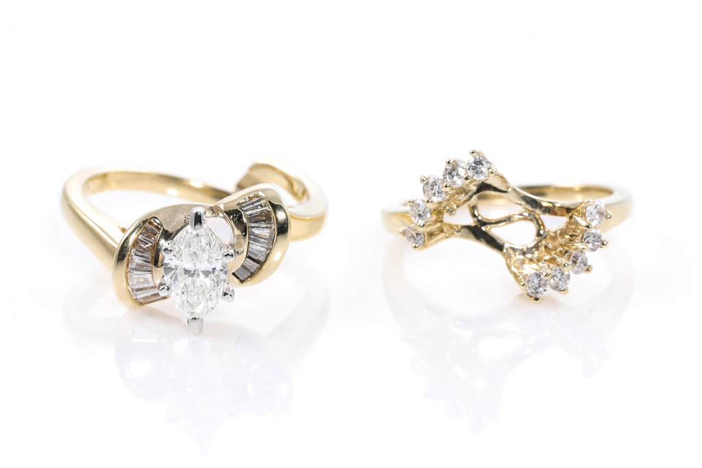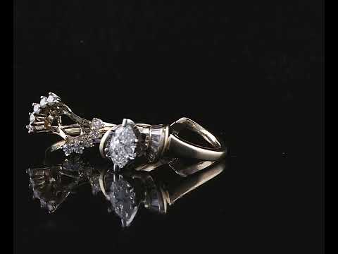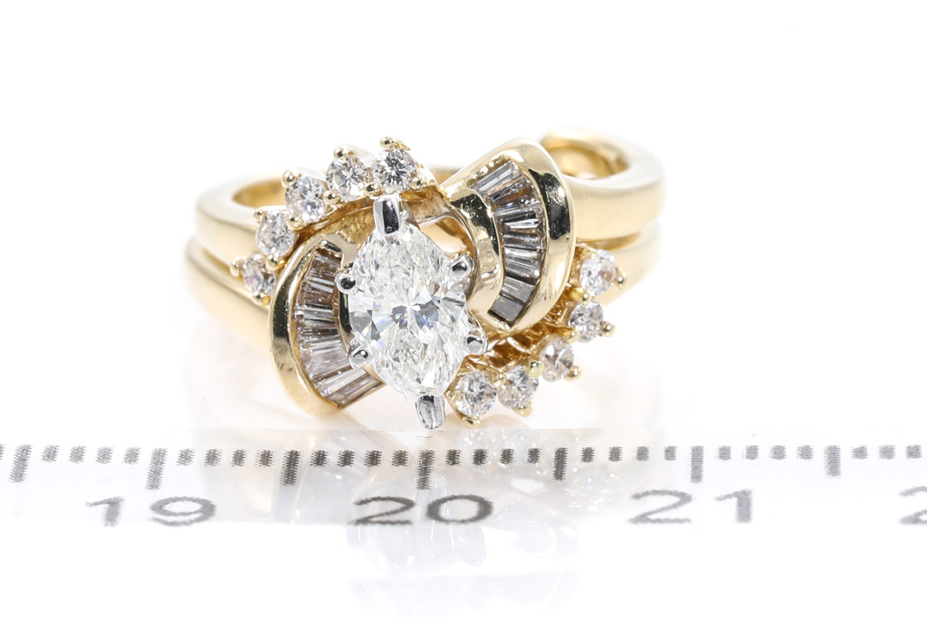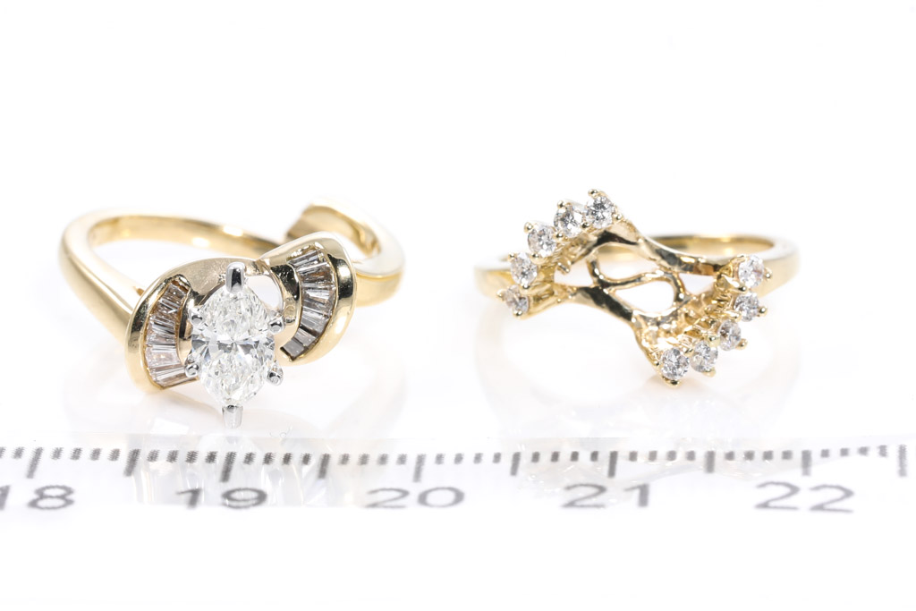 Diamond rings set with centred marquis cut Diamonds of approximately 0.50ct (Estimated grading H SI2) and round & baguette Diamonds totalling approximately 0.50cts (estimated grading H VS-P2). 14ct yellow and white gold. Ring size G 1/2. Weight 6.7g. With Valuation #122280. (Pre-owned)