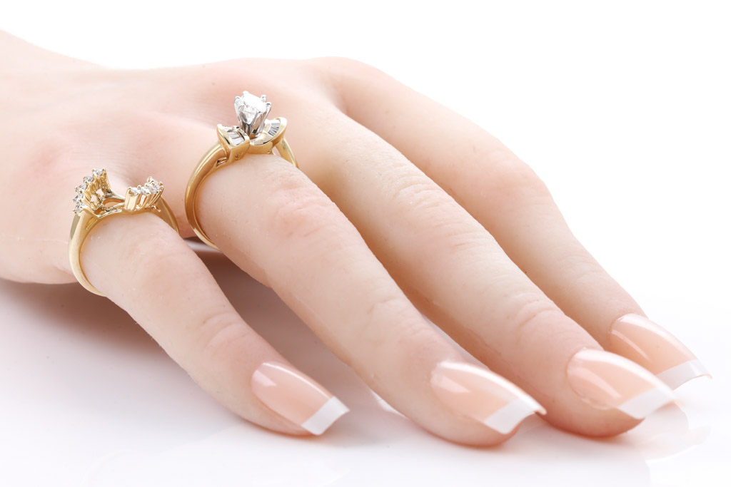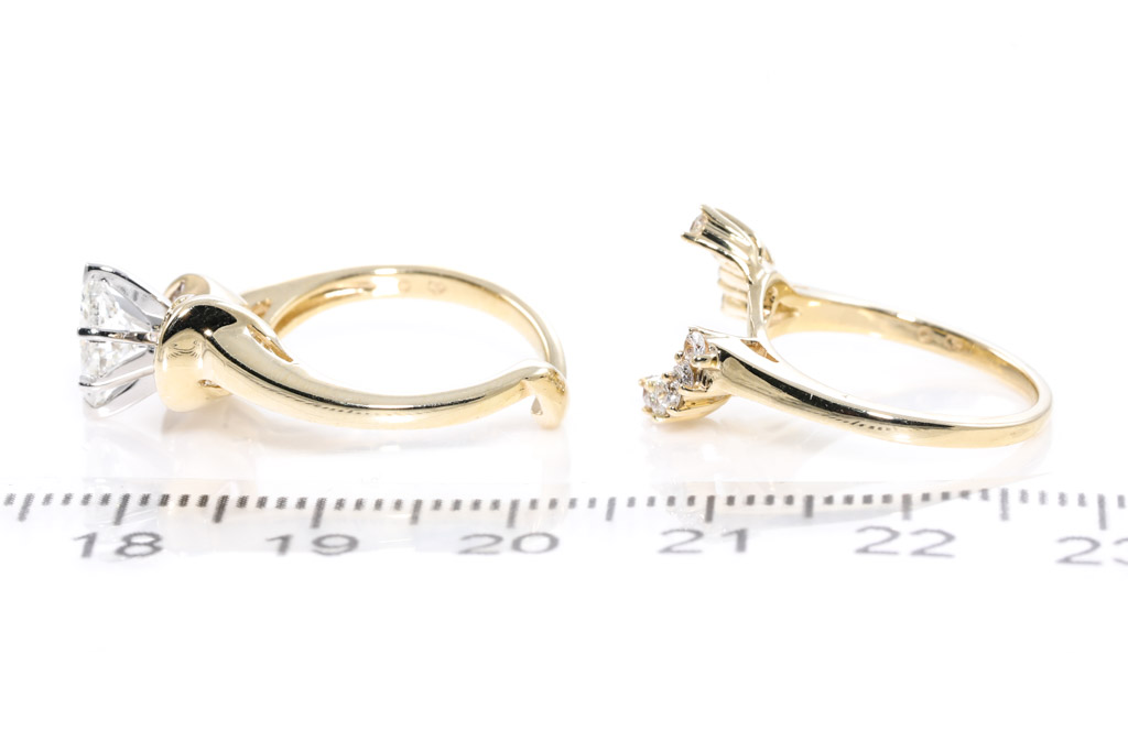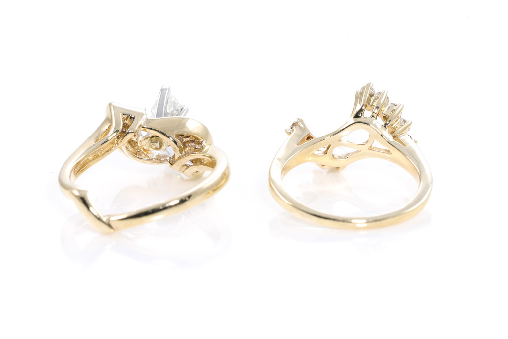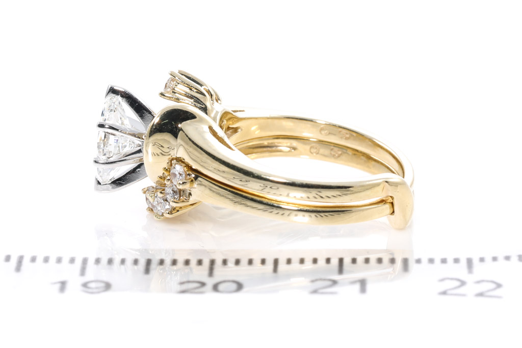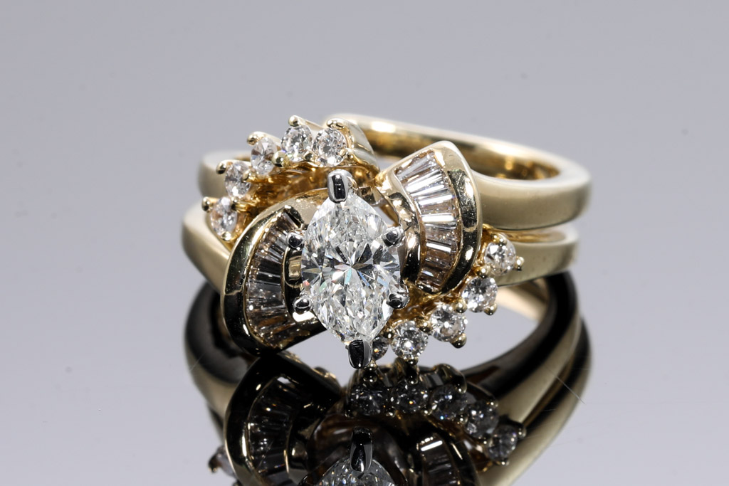 Diamond rings set with centred marquis cut Diamonds of approximately 0.50ct (Estimated grading H SI2) and round & baguette Diamonds totalling approximately 0.50cts (estimated grading H VS-P2). 14ct yellow and white gold. Ring size G 1/2. Weight 6.7g. With Valuation #122280. (Pre-owned)