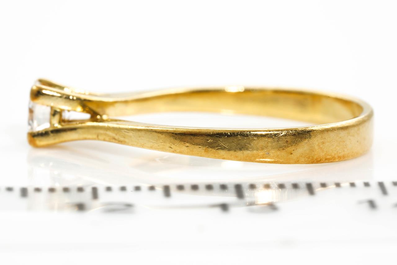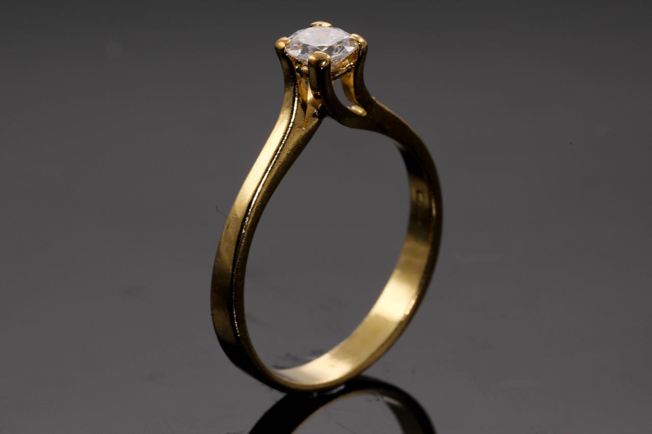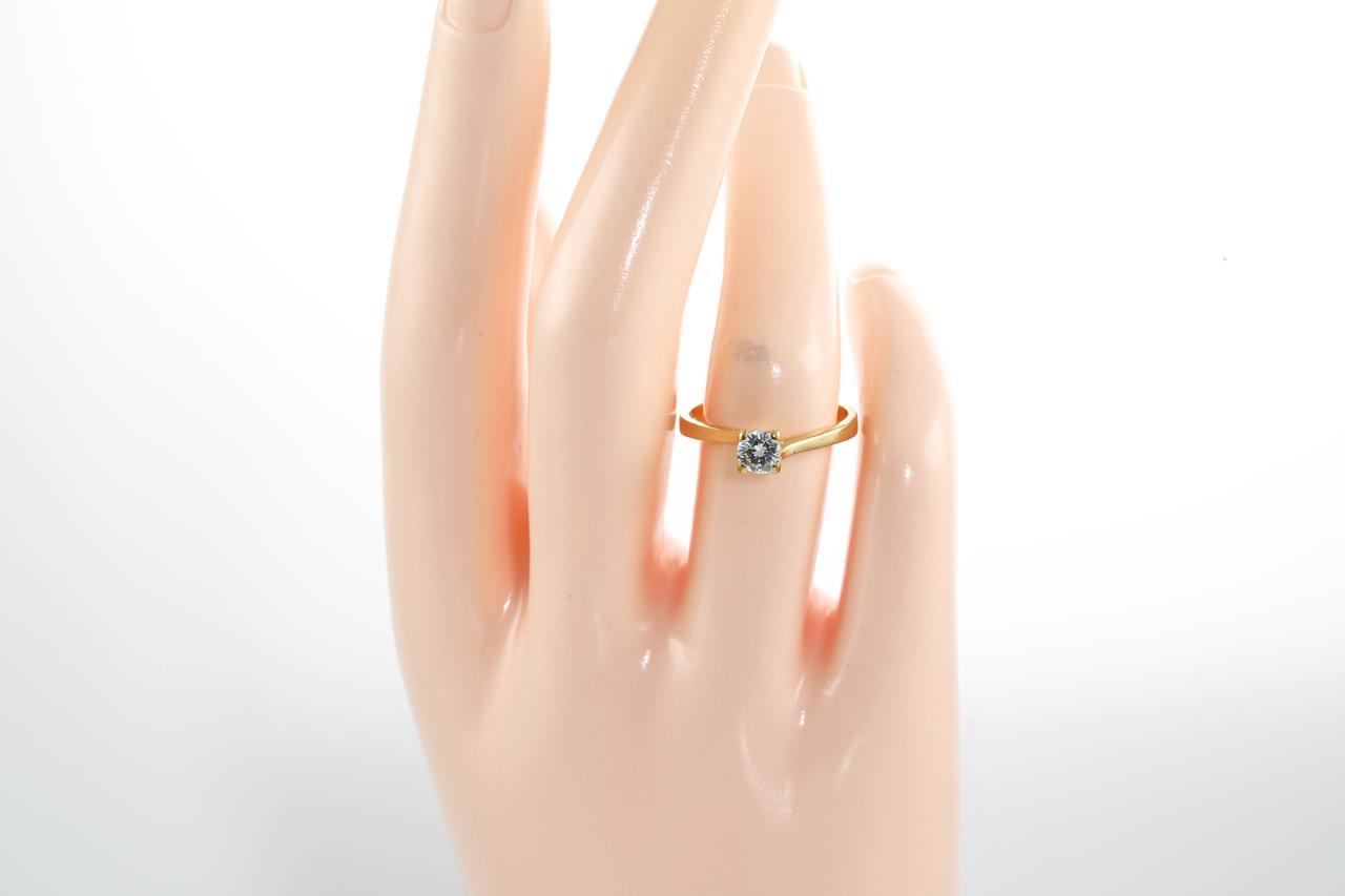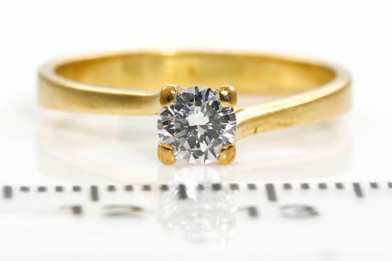 Diamond Solitaire Ring with round brilliant cut Diamond of 0.20ct (Estimated grading: H VS). 18ct yellow gold. Ring Size M. Weight 2.8g. (Pre-owned)